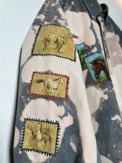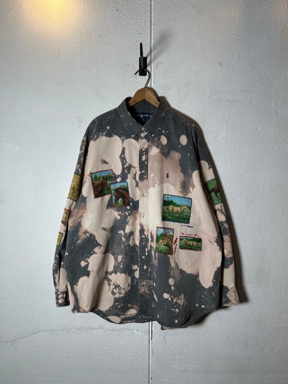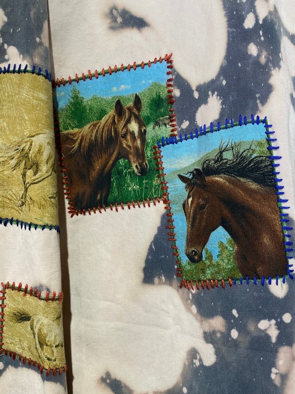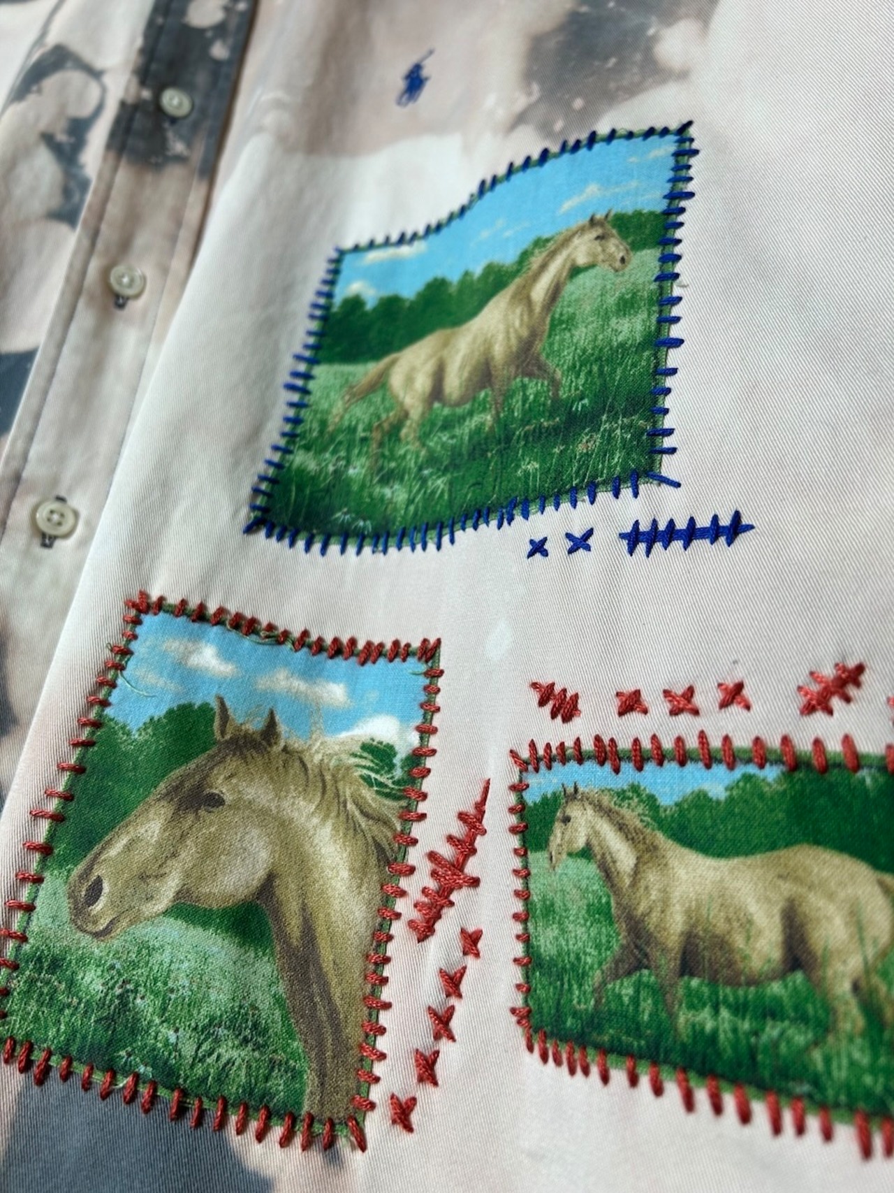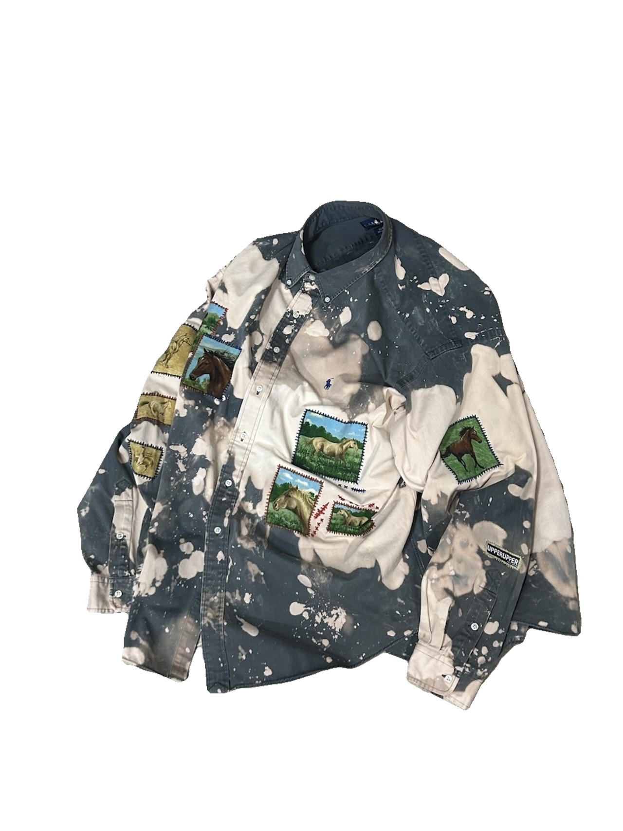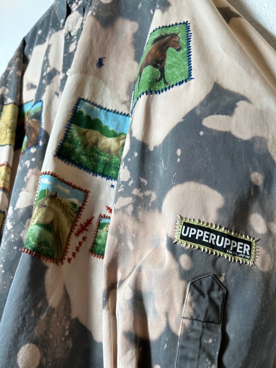 ユニークで魅力的なデザインの、UPRUPR upcycle shirt XXLをぜひご覧ください。このシャツは、上質な古着ボディに、手染め加工を施し、ビンテージファブリックの馬アートを手縫い刺繍で装飾したオンリーワンなアップサイクル品です。無造作な染まり具合と深みのある色合いに、馬アートが散りばめられ、一着で個性を引き立てます!エコなスローファッションの完成体となっています。