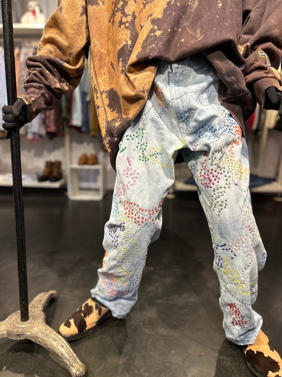 ユニークで魅力的なデザインの、UPRUPR upcycle jeans W38をぜひご覧ください。このジーンズは、上質な古着ボディを使用し、手染め加工を施し、6千針を超える数の手縫い刺繍で装飾した特別なアップサイクル品です!絶妙なアート感を放つバランスで散りばめられたクロスステッチの隙間を「縫う」ように進むステッチのデザイン性が秀逸。サステナブルでありながら、あなたのスタイルを際立たせるスローファッションを全面に押し出したエコな一着です。