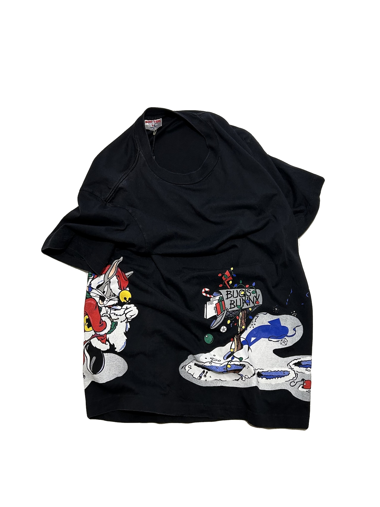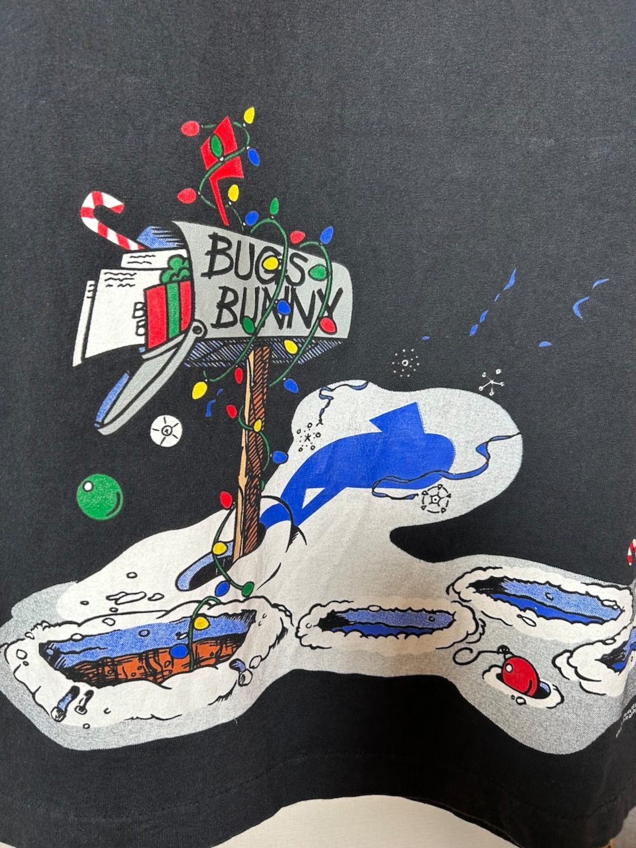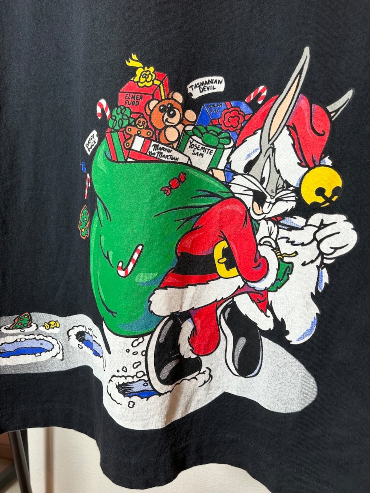 ご覧いただきありがとうございます!こちらの1994 Bugs Bunny Tee Lは、1994年Sun Sportswear社製の特別な一着です。バグスバニーがサンタに扮して仲間たちにプレゼントを届ける姿が愛らしく描かれたデザインが特徴です!Made in USAのオールコットン素材は安定の高品質で、快適な着心地を提供し、当時を感じさせる緩めのシルエットも良き。