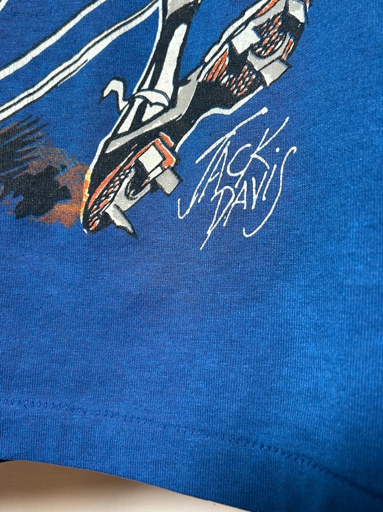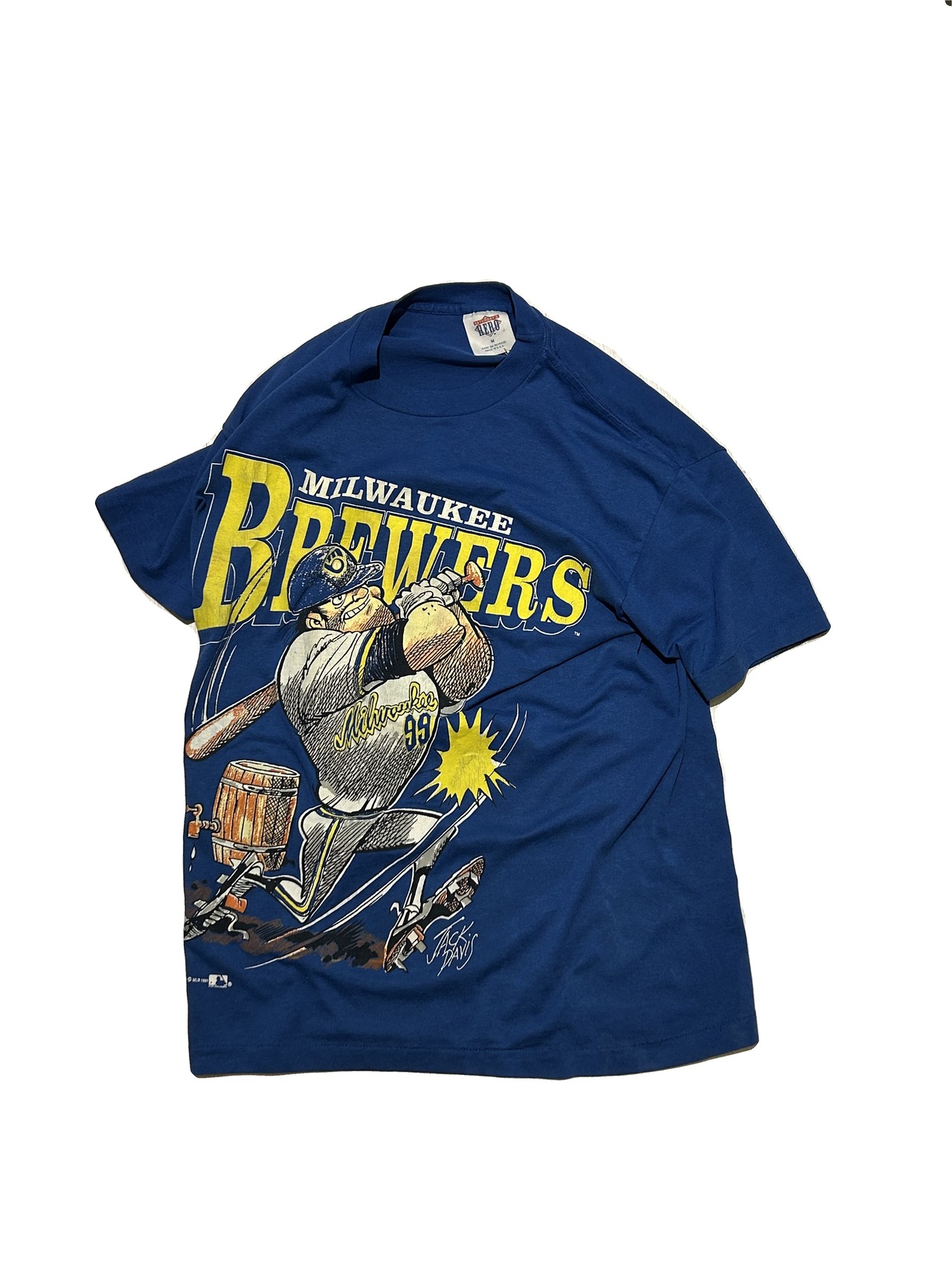 ご覧いただきありがとうございます!こちらの1991 Brewers Tee Mは、1991年Saturday's Hero社製のミルウォーキーブリュワーズTシャツです。Madマガジンのイラストレーター、Jack Davisによるレトロなイラストが特徴的で、独特のブルーが当時感を醸し出す一枚です!