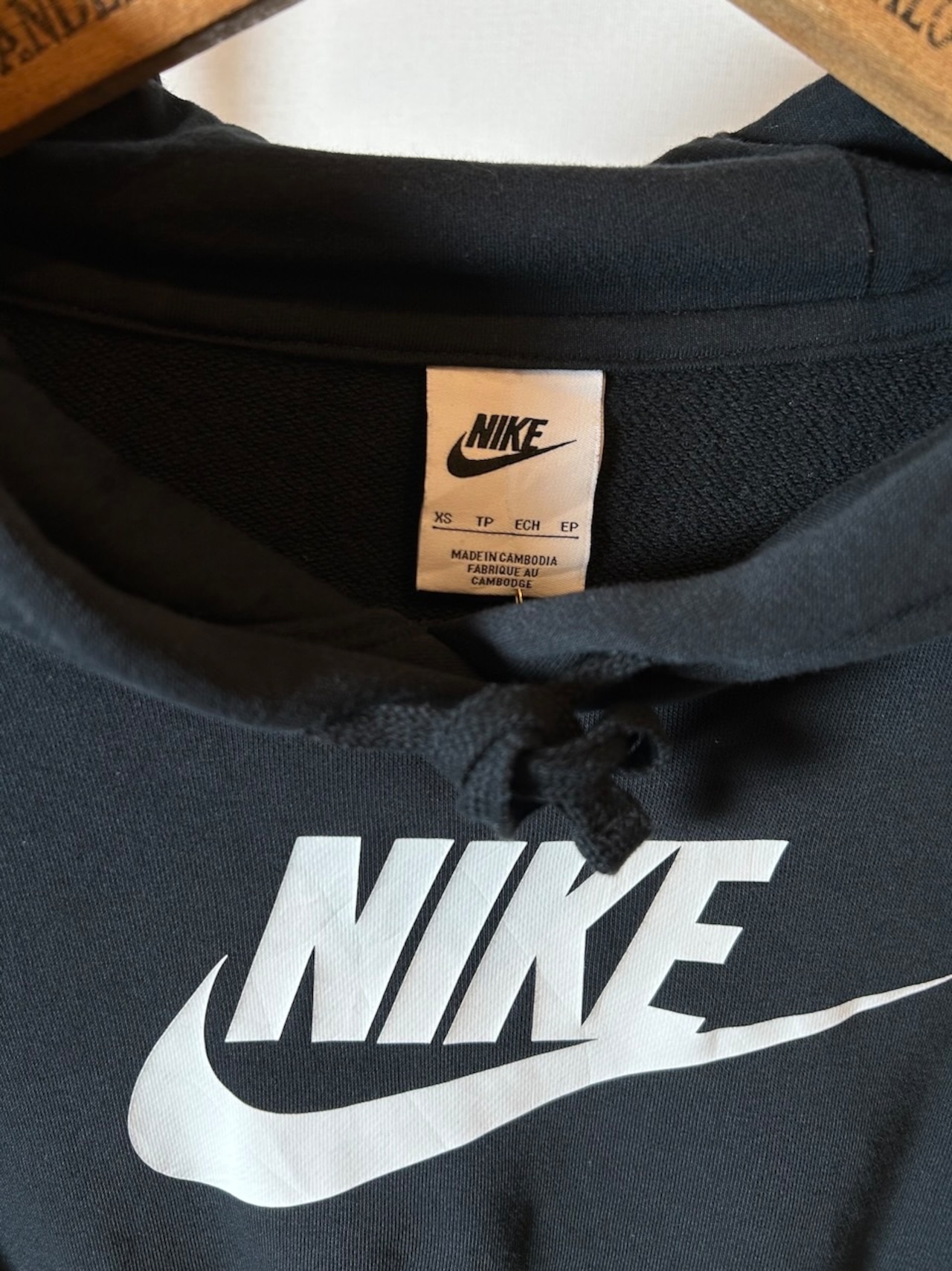 ご覧いただきありがとうございます!こちらのNIKE cropped hoodie XSは、レディースのクロップパーカーです。黒ボディに白ロゴの組み合わせがクラシックながらも、ショートでワイドめなシルエットがほどよいアクセントを加える一着となっています!
