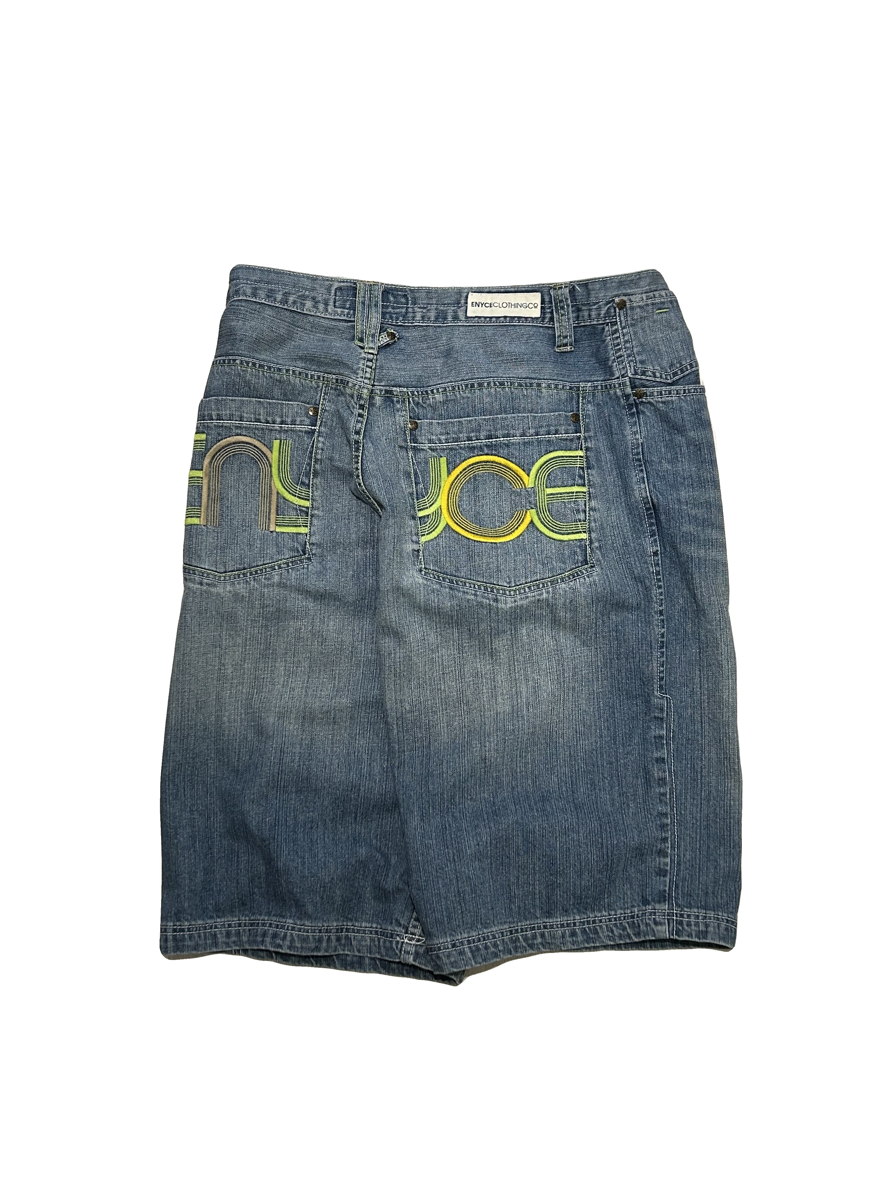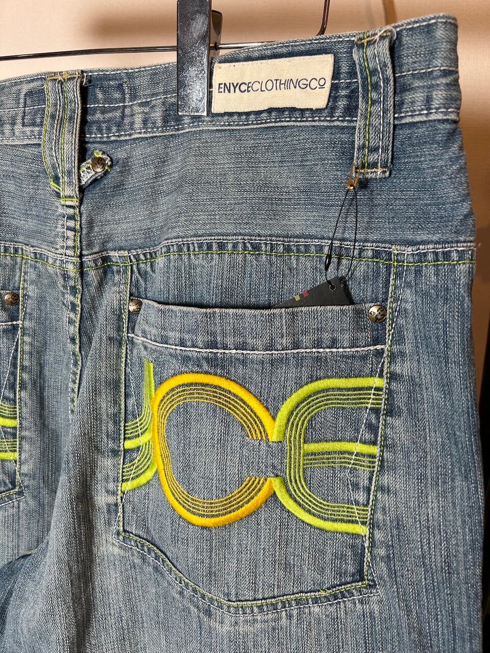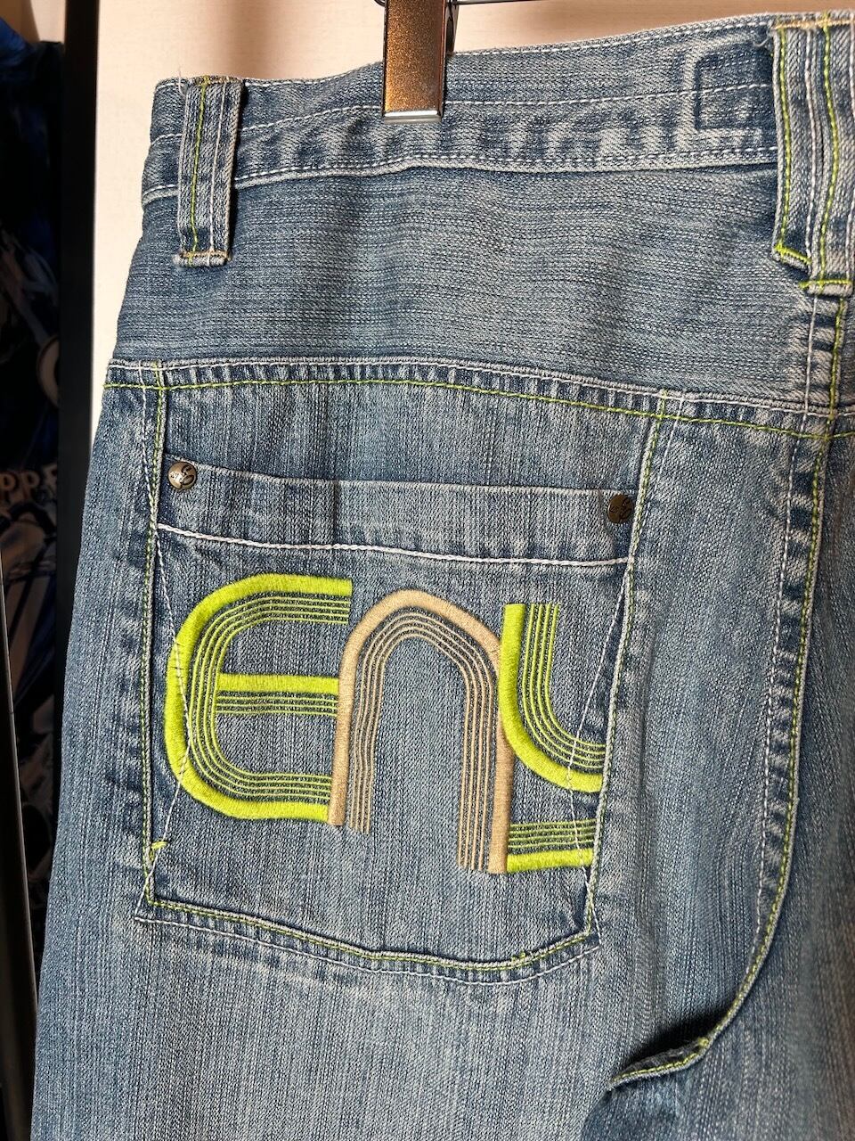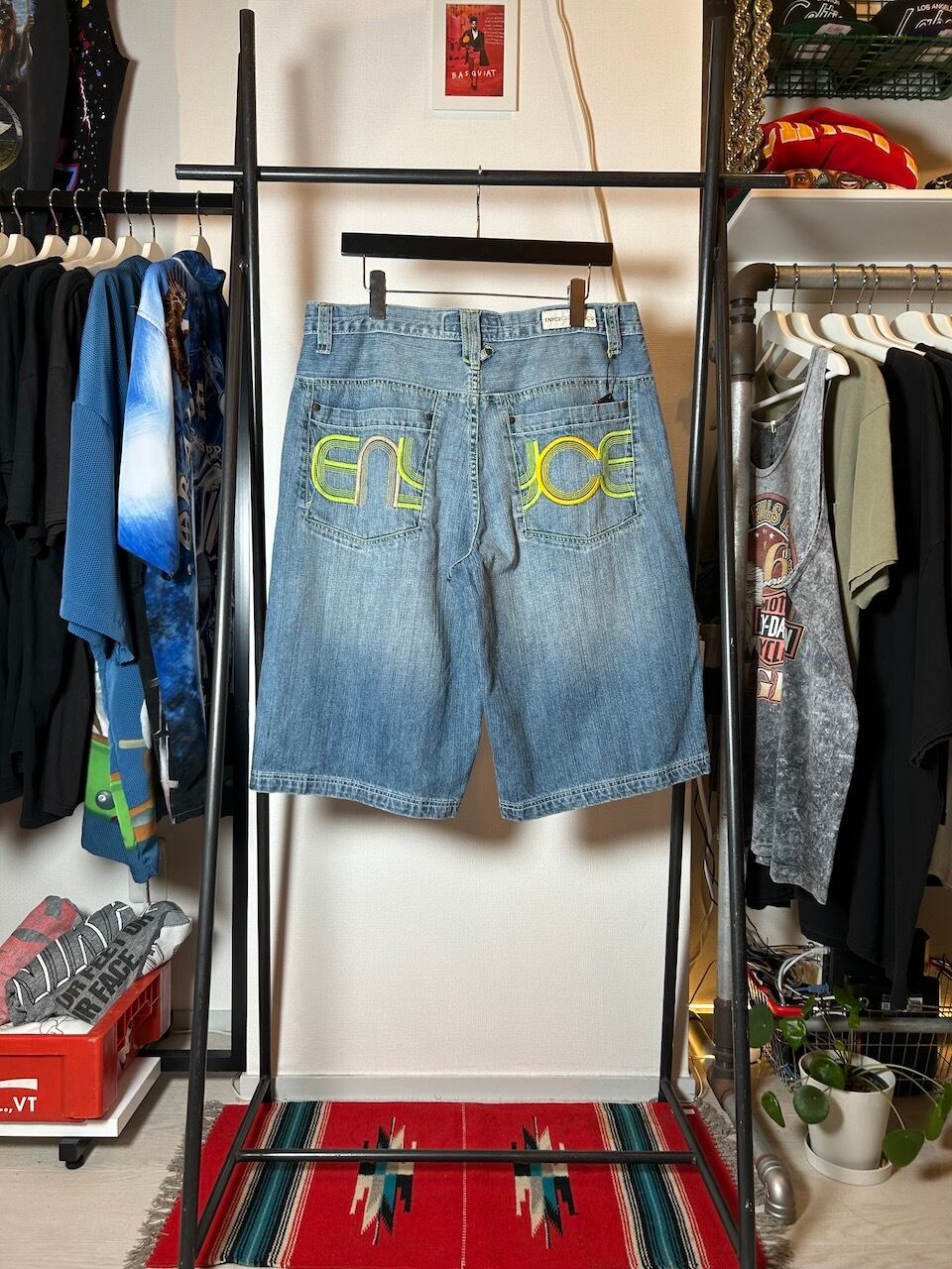 ご覧いただきありがとうございます!こちらのY2K ENYCE shorts W34は、2000年代初期、ENYCEのデニムバギーショーツです。当時感溢れる色味や加工感、バックのカラフルな刺繍とシルエットと完成度の高い一本です!