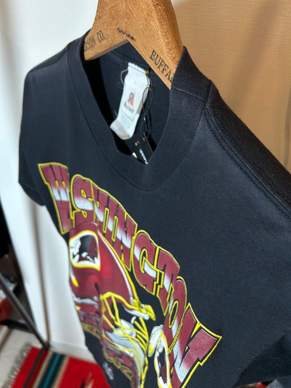 ご覧いただきありがとうございます!こちらの1997 Washington Redskins Tee Mは、1997年製のRiddell社デザインによるレッドスキンズTシャツです。先住民をモチーフとした独特なロゴが印象的な一着で、2020年にチーム名が変更された今では貴重なデザインとなっています!ヘルメットプリントは当時の定番的ですが、ここまでプリントの大きいタイプはなかなかありません!