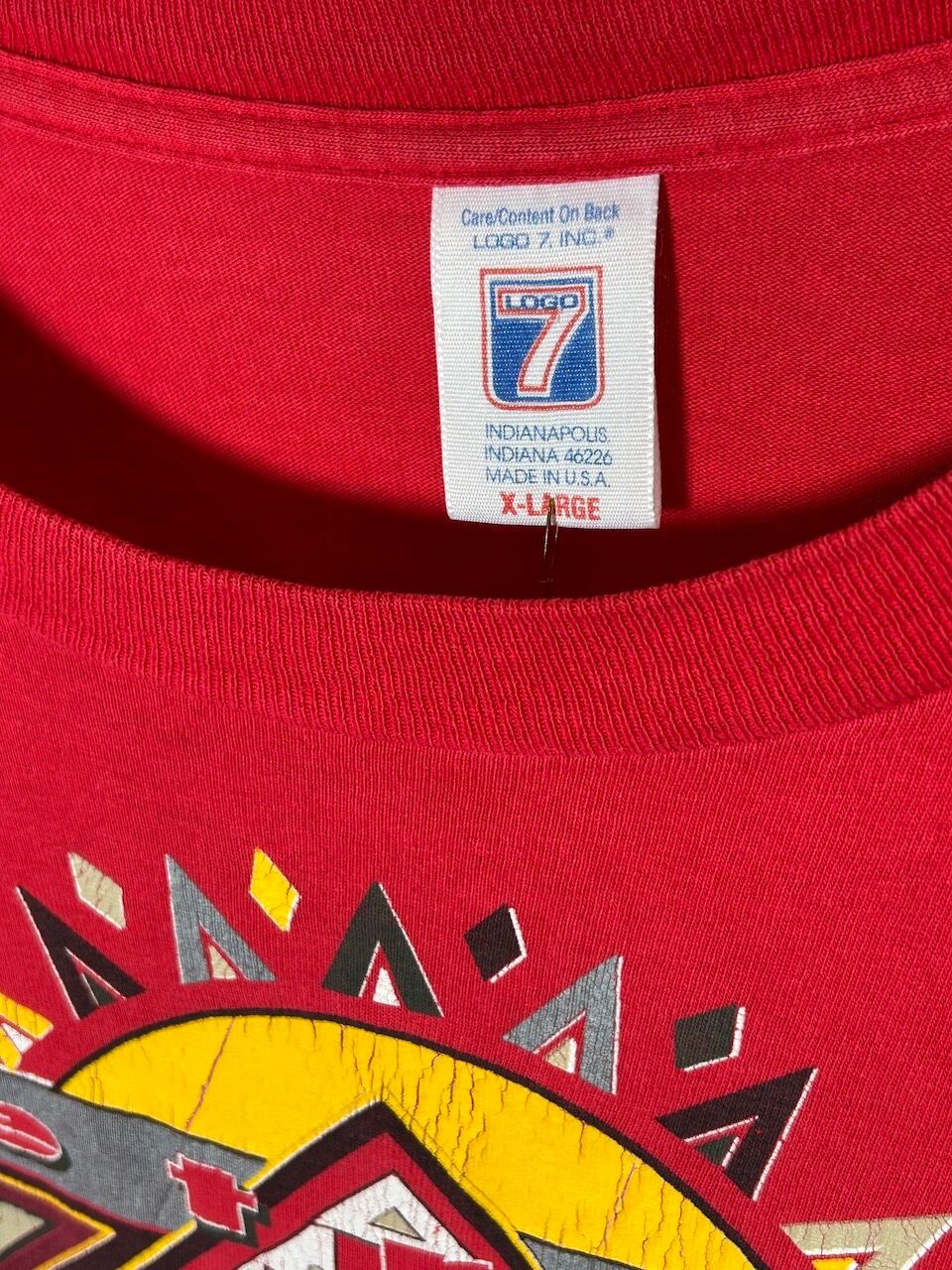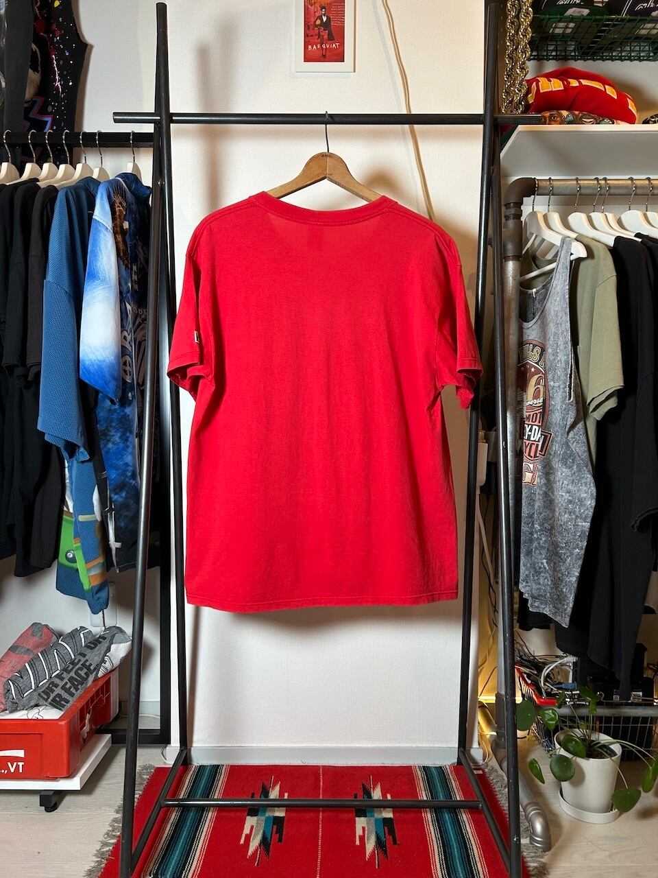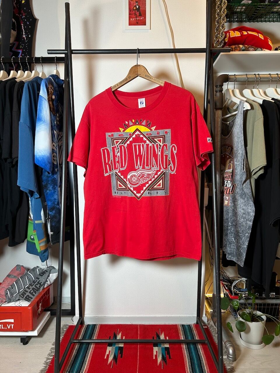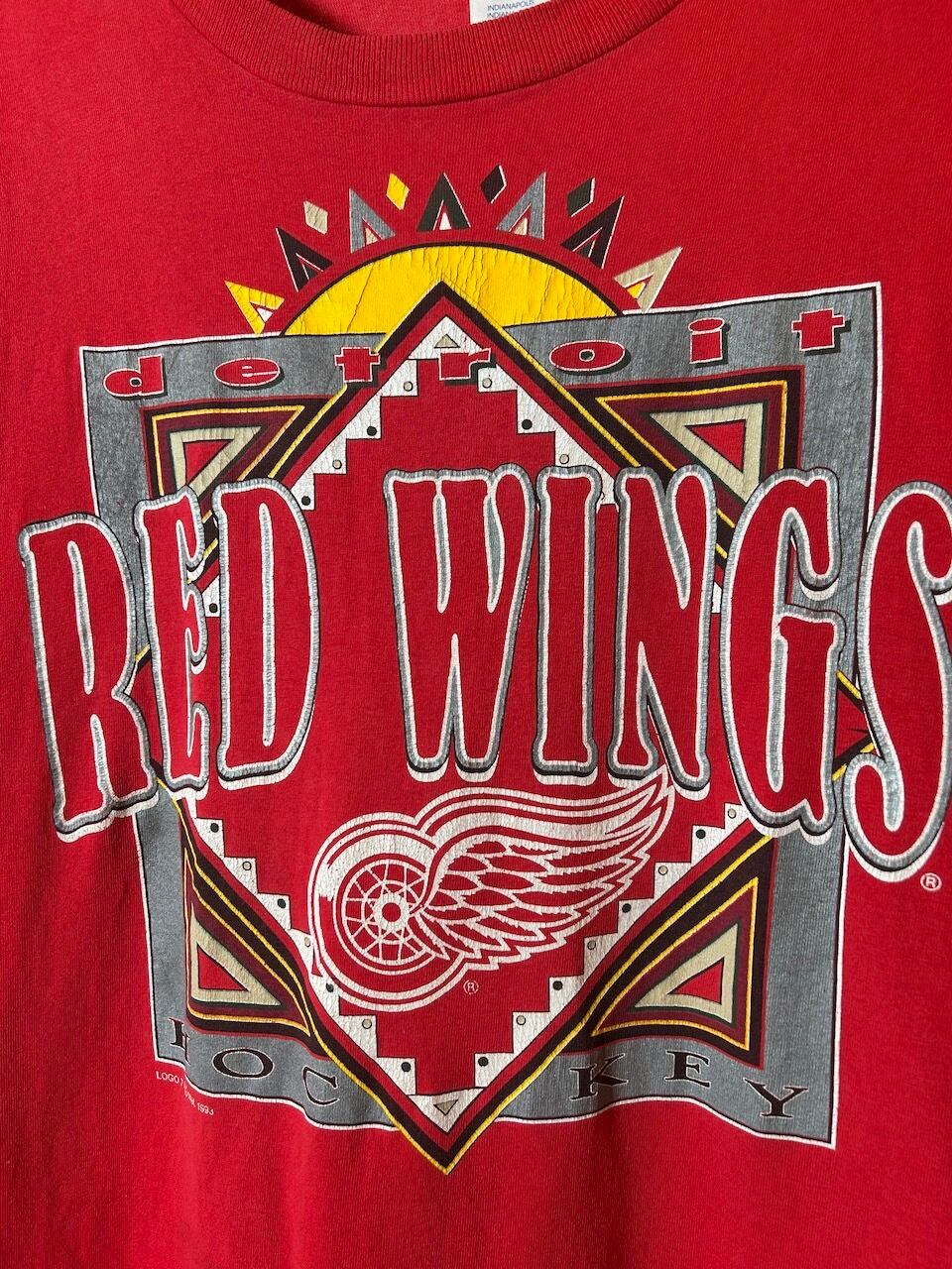 ご覧いただきありがとうございます!こちらの1993 Red Wings Tee XLは、90年代アメリカ製のデトロイトレッドウィングスTシャツです。特徴的なロゴグラフィックがカッコ良い!!太陽っぽいデザインが特に印象的で、赤ボディと相まって全体的にアフリカンな雰囲気をも醸し出す一枚です!程よく年季の入った古着感も最高。