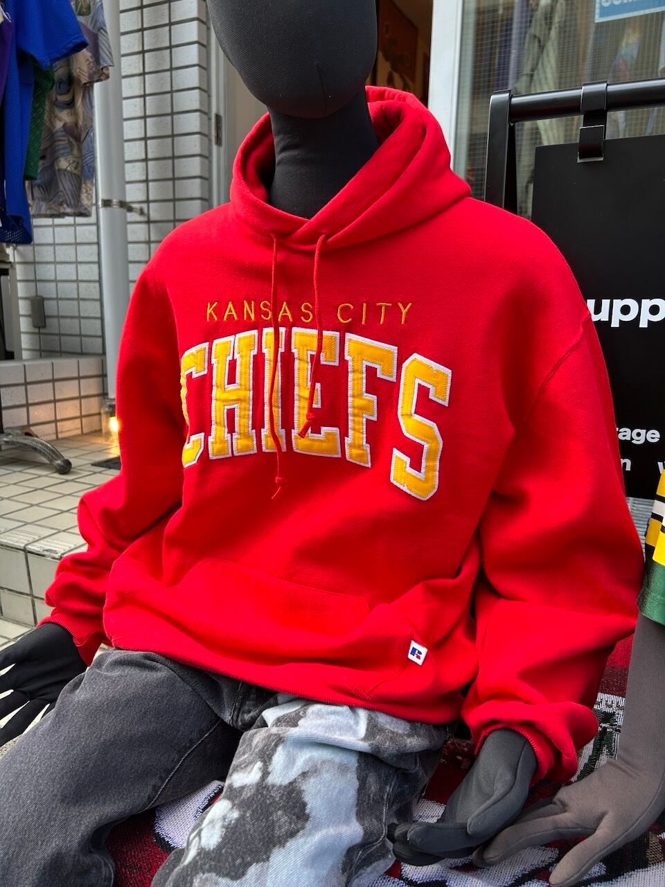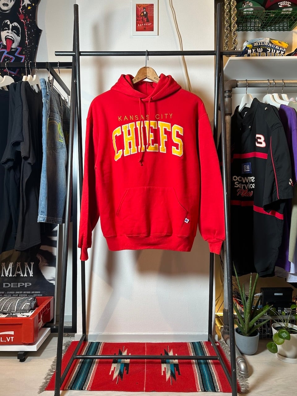ご覧いただきありがとうございます!こちらの90's Chiefs hoodie Lは、90年代Russell社アメリカ製のカンザスシティチーフスのパーカーです。ビビッドでクラシックな色合いと上質なラッセルボディが際立つ、まさに一着でレトロ感を楽しめるアイテムです。