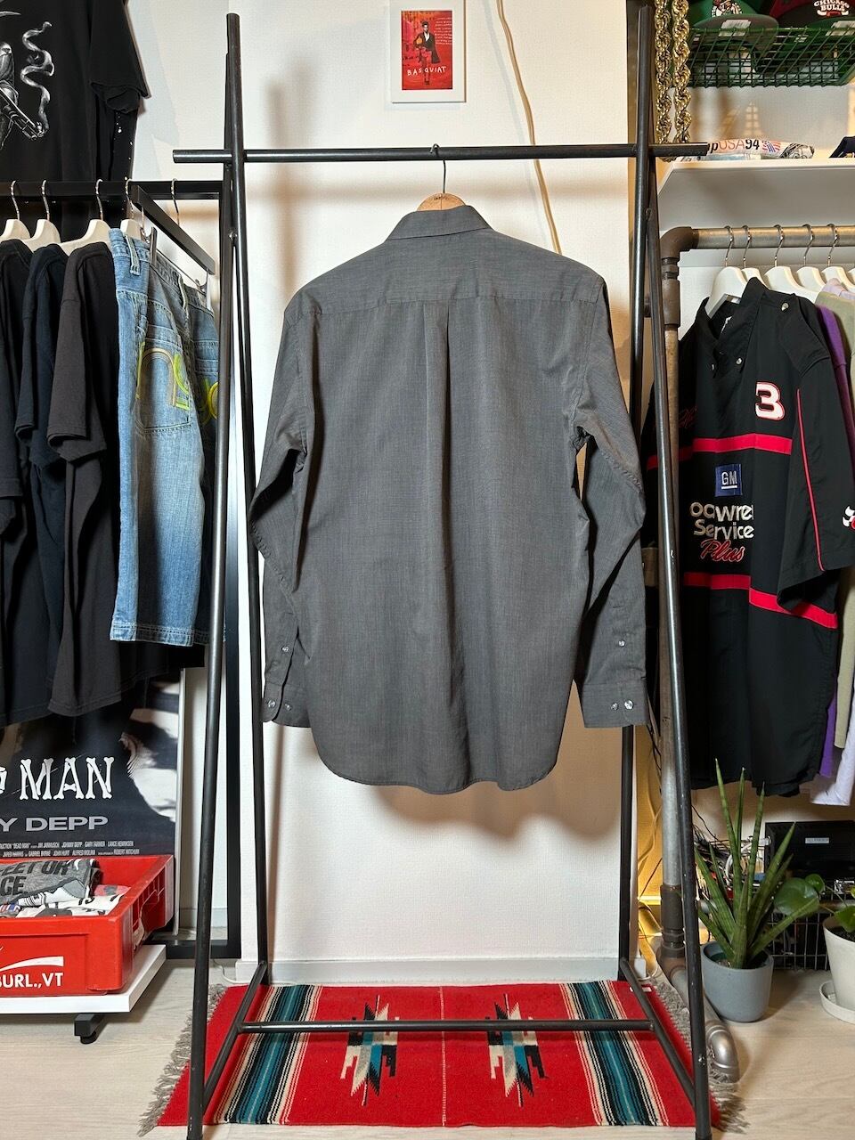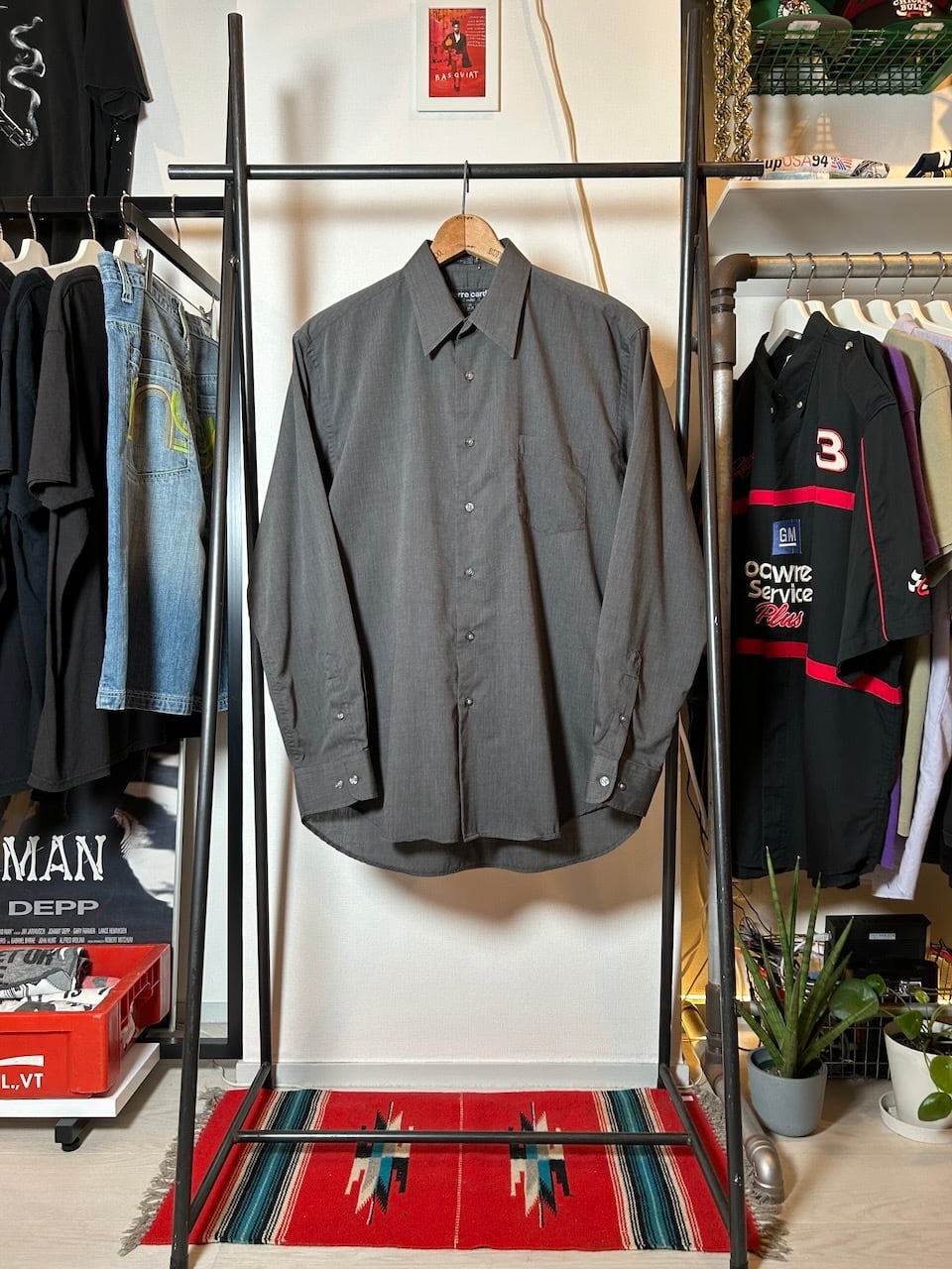ご覧いただきありがとうございます!こちらの80's Pierre Cardin shirt Lは、80年代ピエールカルダンのポリコットンシャツです。ミニマルなデザインと主張の少ないチャコールカラーが特徴で、ハイブランドの雰囲気を漂わせる秀逸なアイテムです。