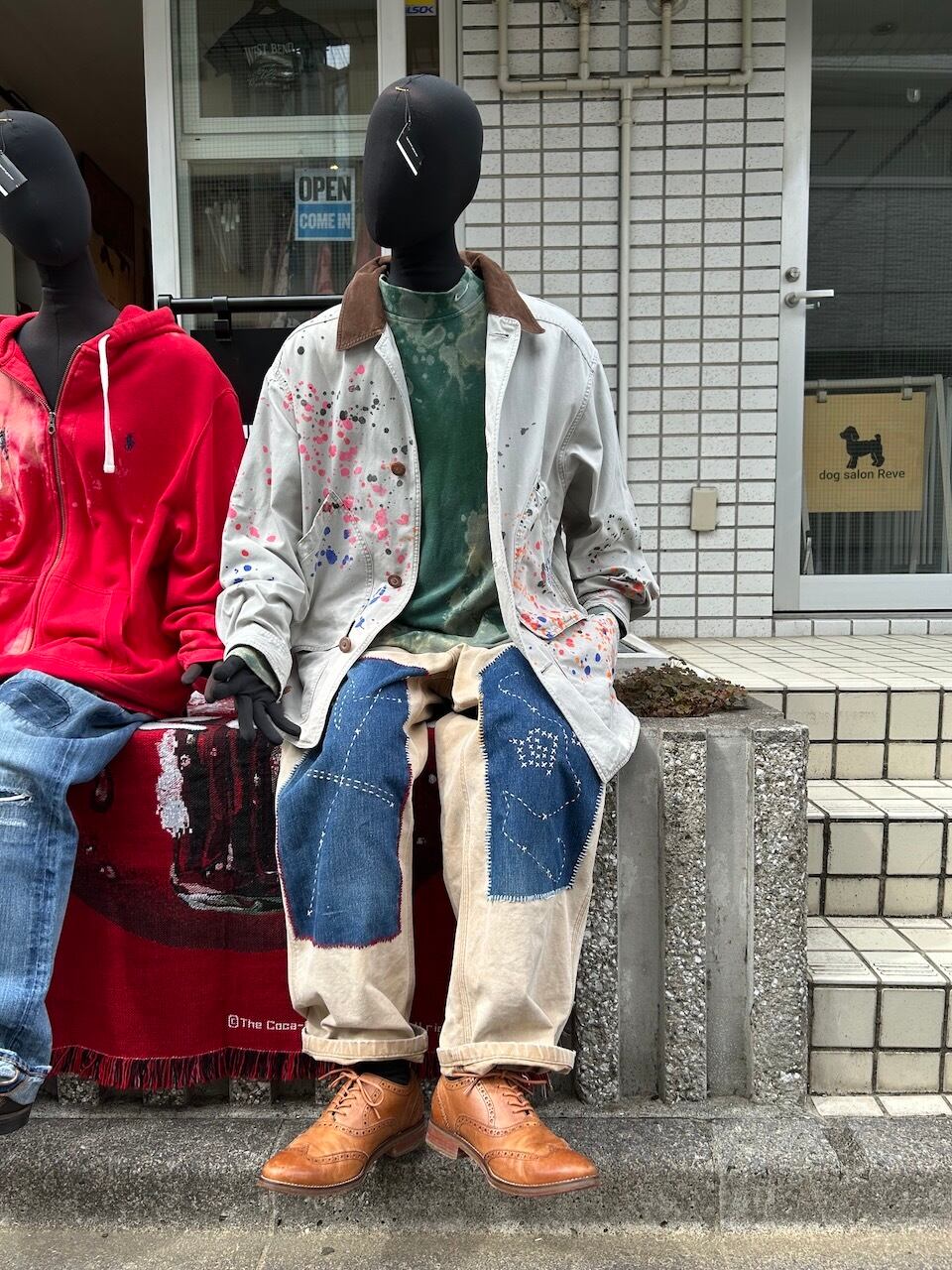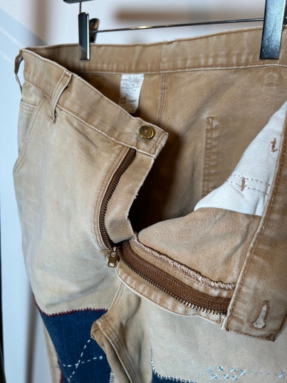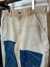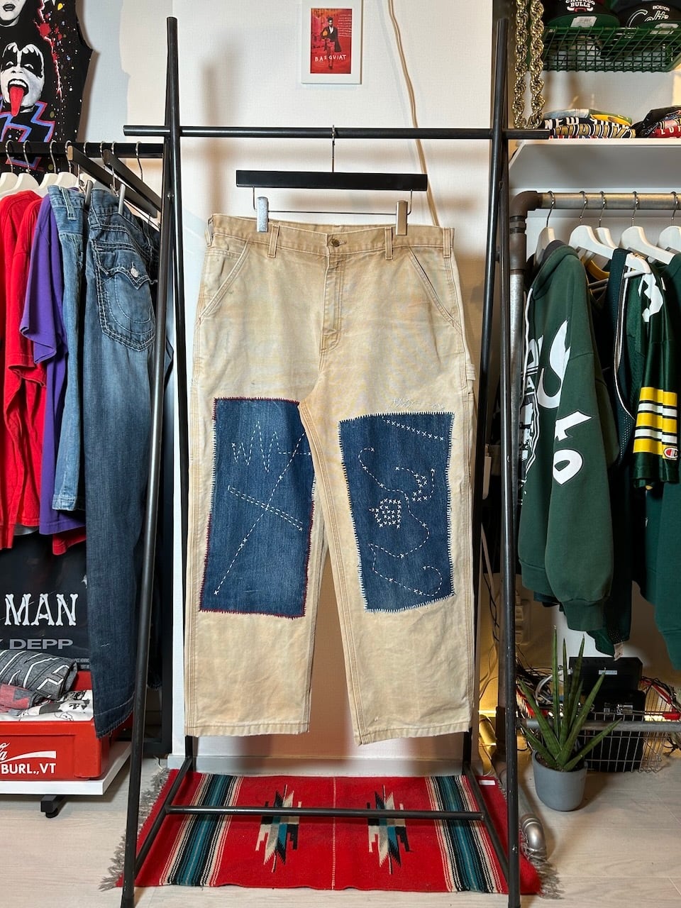 ご覧いただきありがとうございます!こちらのUPRUPR upcycle pants W36は、良く履き込まれた2000年代アメリカ製のCarharttダックパンツに、70年代の色落ちデニム生地を膝周辺に大胆に当て、手縫いで装飾したユニークな一本です。自由に動く刺し子風の刺繍が元々の無骨な雰囲気と相まって、独特なアート感を放つアイテムです。白いシャツと合わせて大人っぽく、またはパーカーと合わせてカジュアルにと、幅広く楽しめるアイテムです。