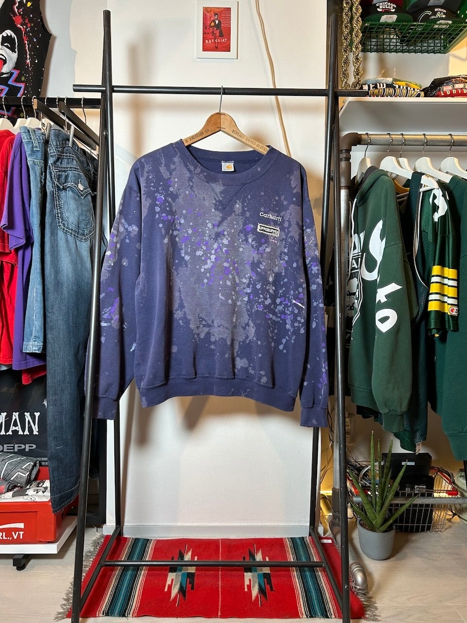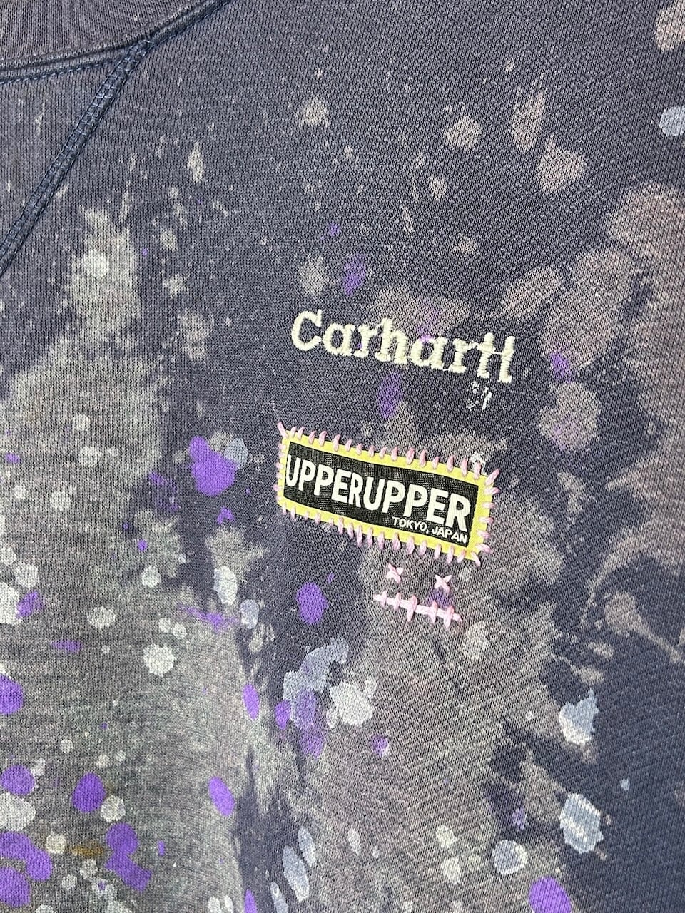 ご覧いただきありがとうございます!こちらのUPRUPR upcycle sweatshirt Mは、90年代製Carharttのスウェットを使用したアップサイクル品です。古着独特の使用感をそのままに、大胆で無造作な雰囲気の変色加工を施した上に、同色系のペイントデザインで全体を調和させた魅力的な一着に仕上がっています!