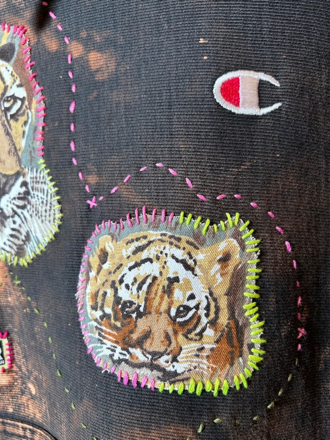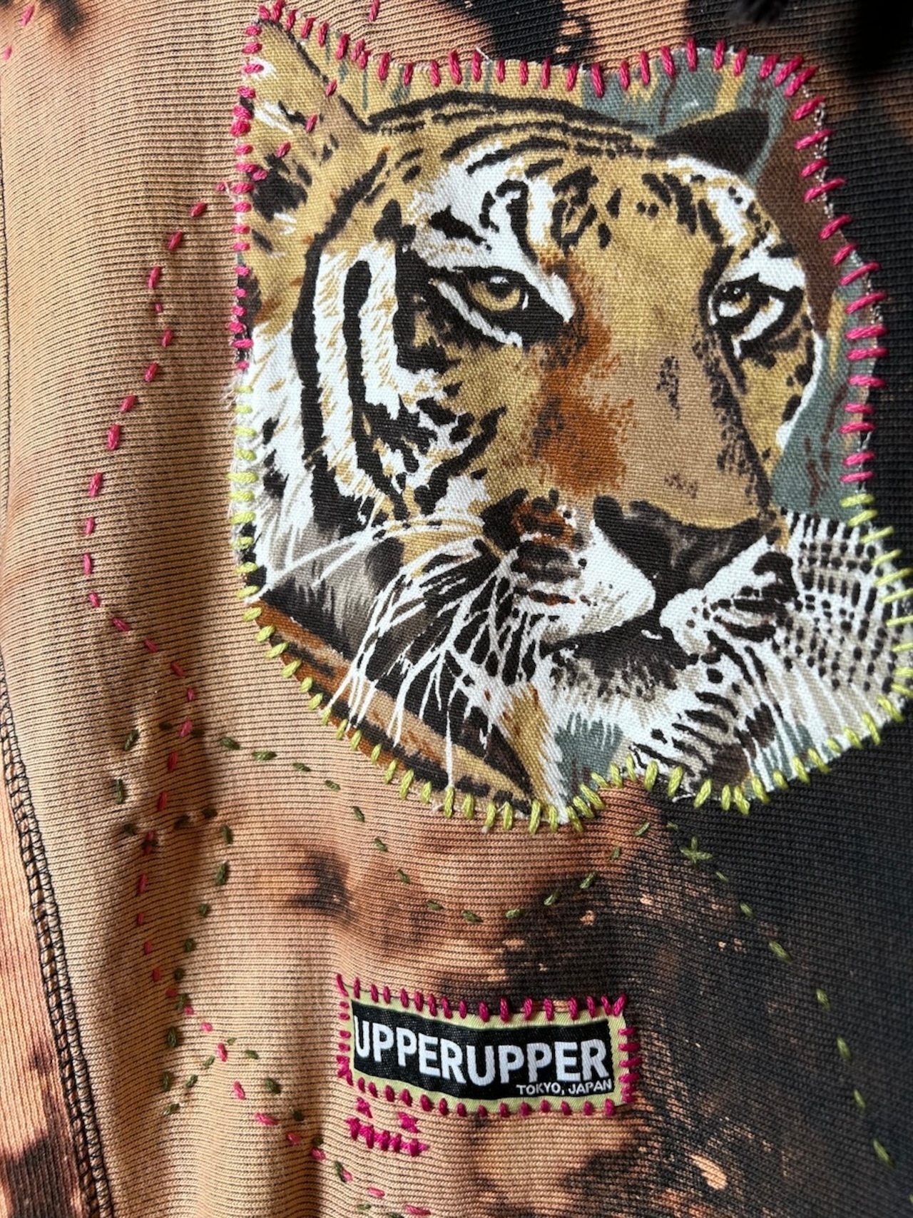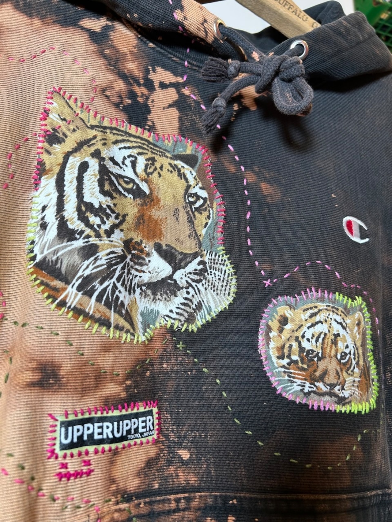 ご覧いただきありがとうございます!こちらのUPRUPR upcycle hoodie Sは、2010年代製のチャンピオンリバースウィーブを使用したアップサイクル品です。ハンドメイドで変色加工を施し、ビンテージ生地の虎の親子イラストアートを手縫いで装飾し、カラフルな刺繍ステッチでポップな印象を与える一着に仕上げました!