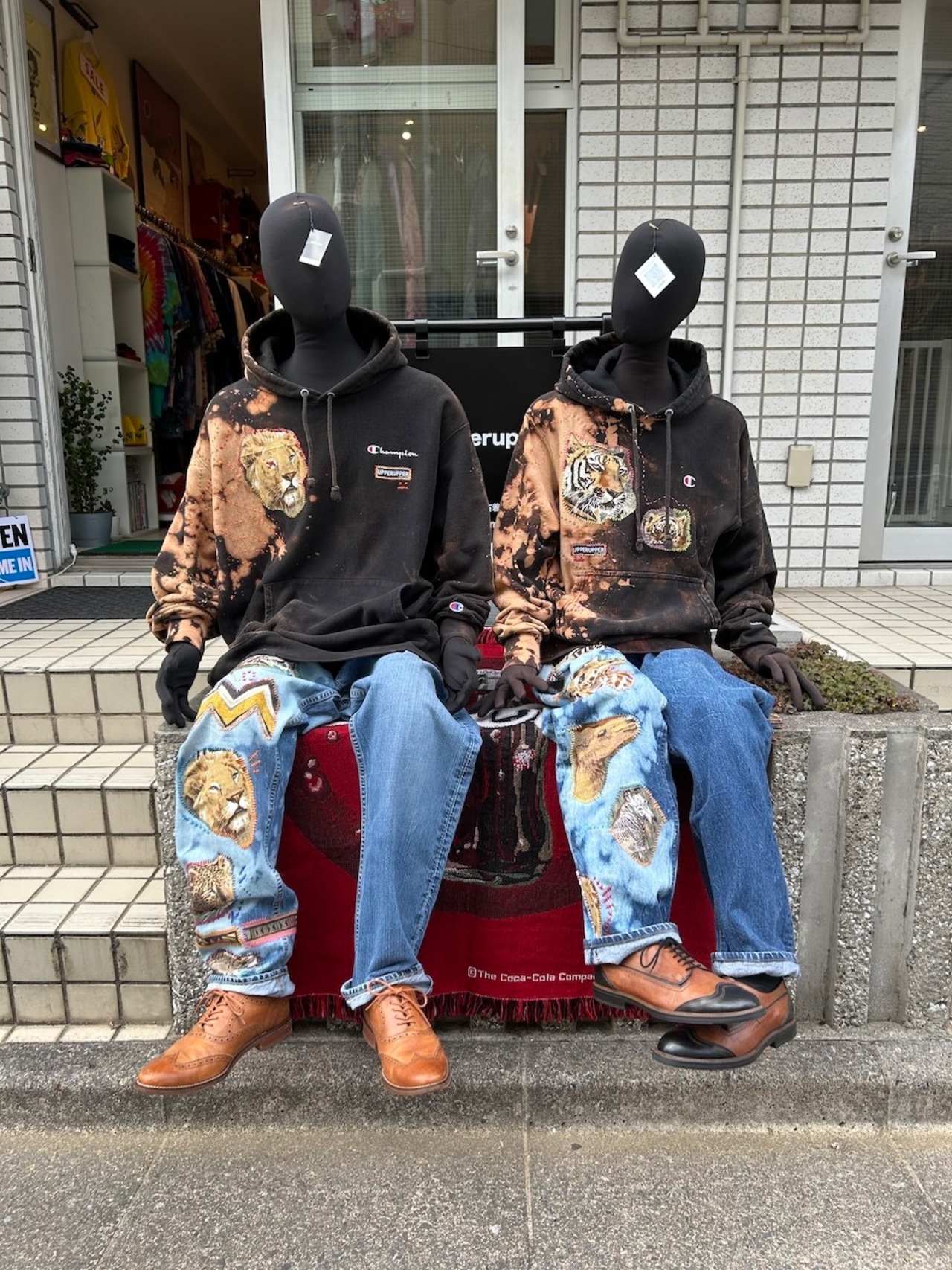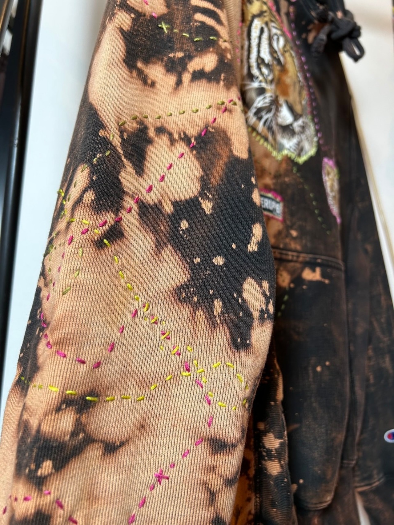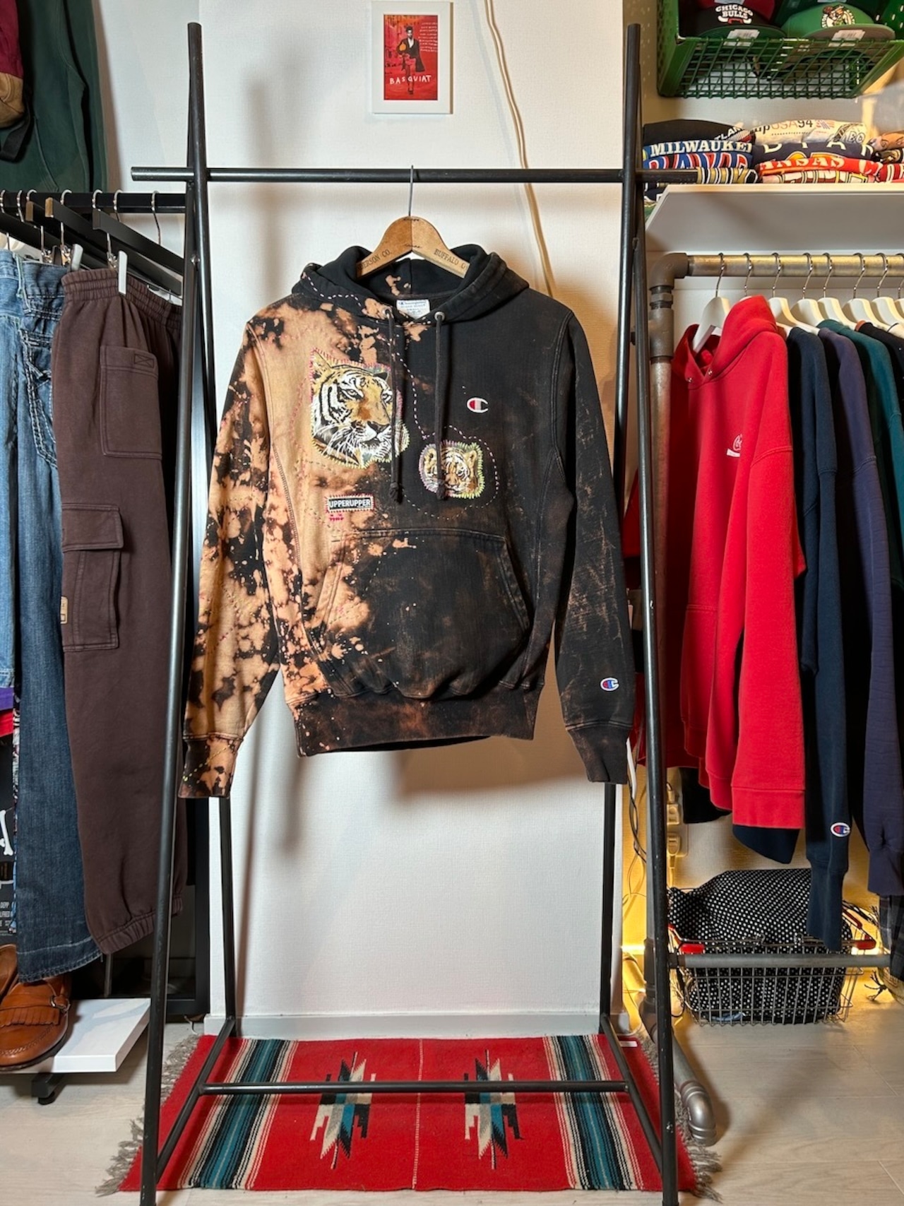 ご覧いただきありがとうございます!こちらのUPRUPR upcycle hoodie Sは、2010年代製のチャンピオンリバースウィーブを使用したアップサイクル品です。ハンドメイドで変色加工を施し、ビンテージ生地の虎の親子イラストアートを手縫いで装飾し、カラフルな刺繍ステッチでポップな印象を与える一着に仕上げました!
