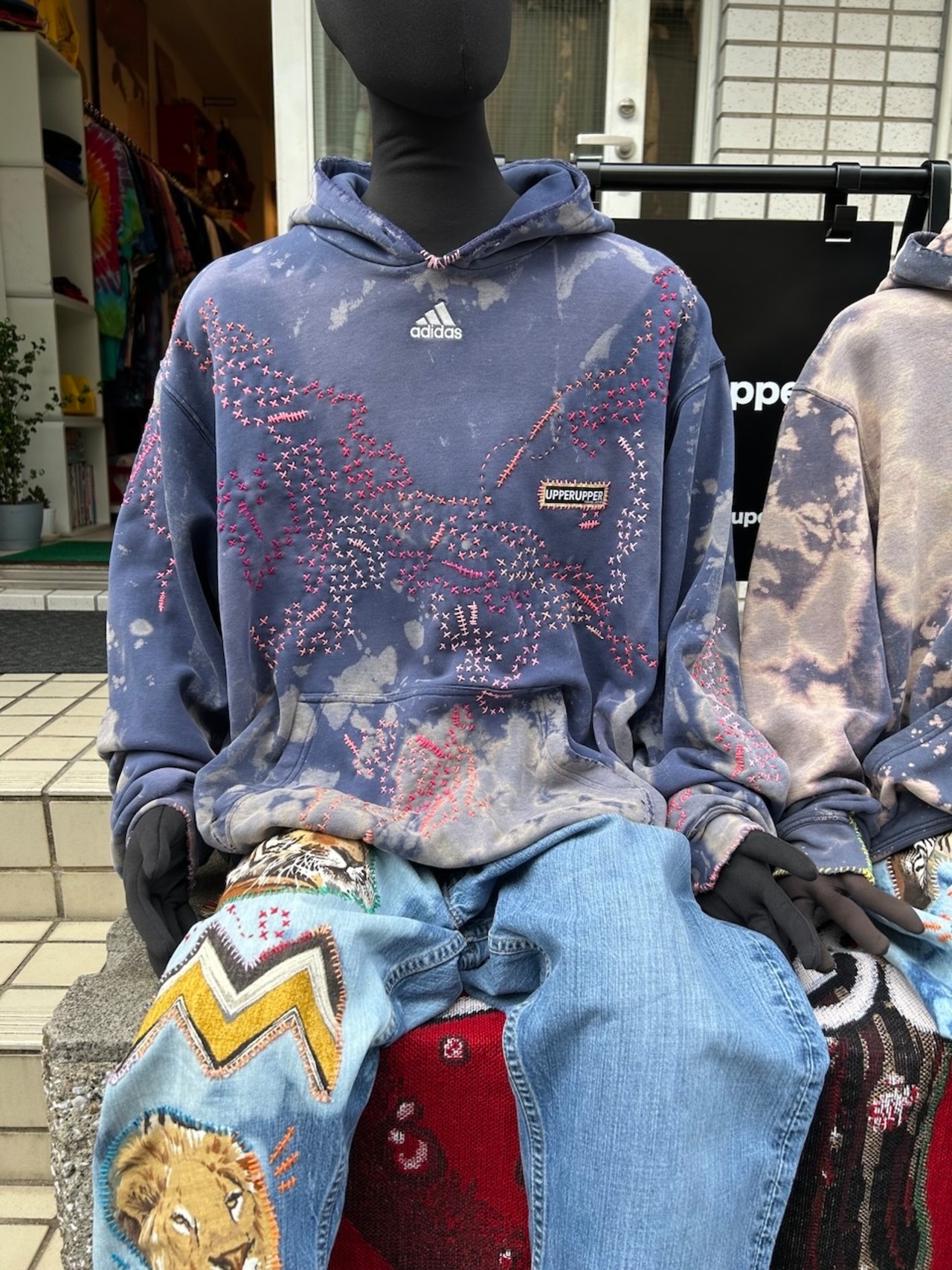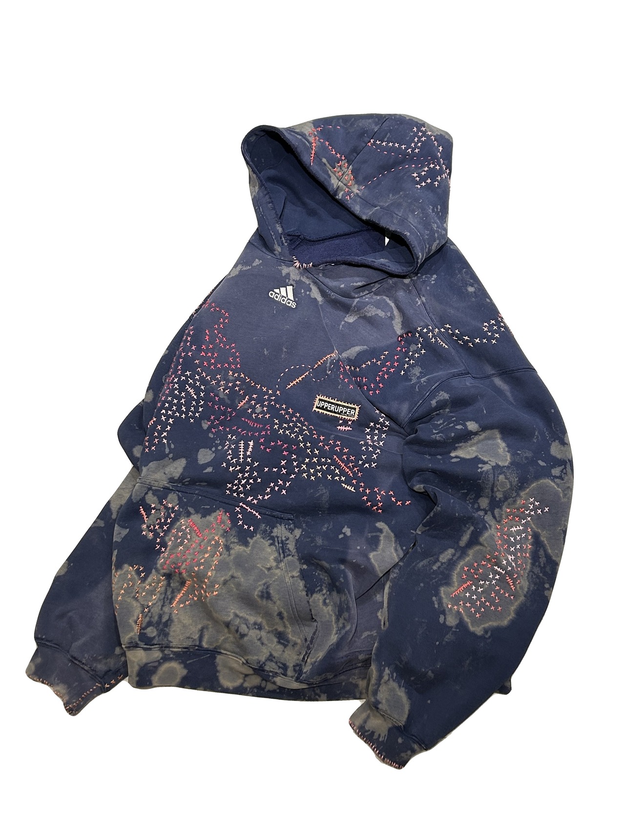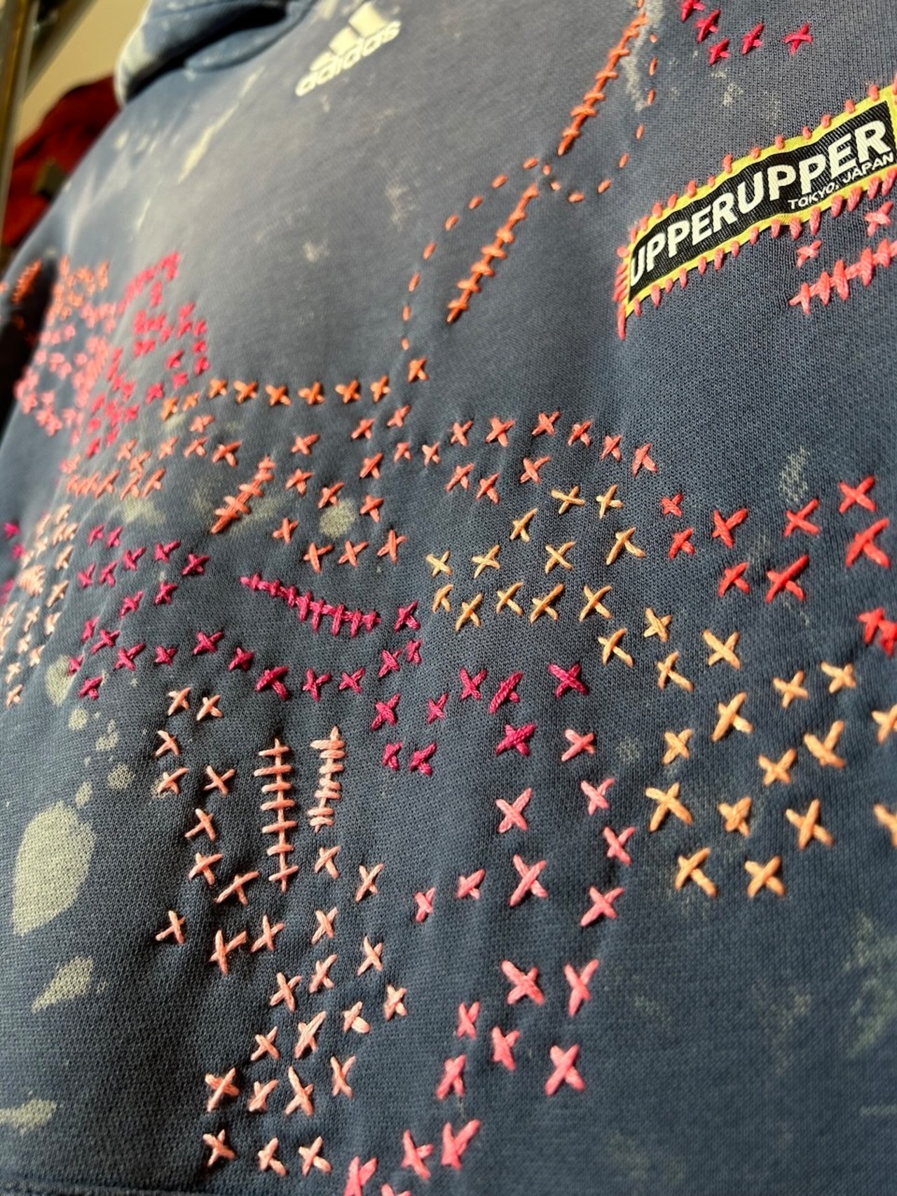 ご覧いただきありがとうございます!こちらのUPRUPR upcycle hoodie Lは、2000年代製のアディダスパーカーを使用したアップサイクル品です。ハンドメイドで変色加工を施し、刺し子を独自にアレンジした鮮やかな刺繍ステッチを散りばめ、ダメージ補修もカラフルに仕上げた一着。ダメージ感と手縫い感が絶妙に調和し、個性的なデザインとなっています!