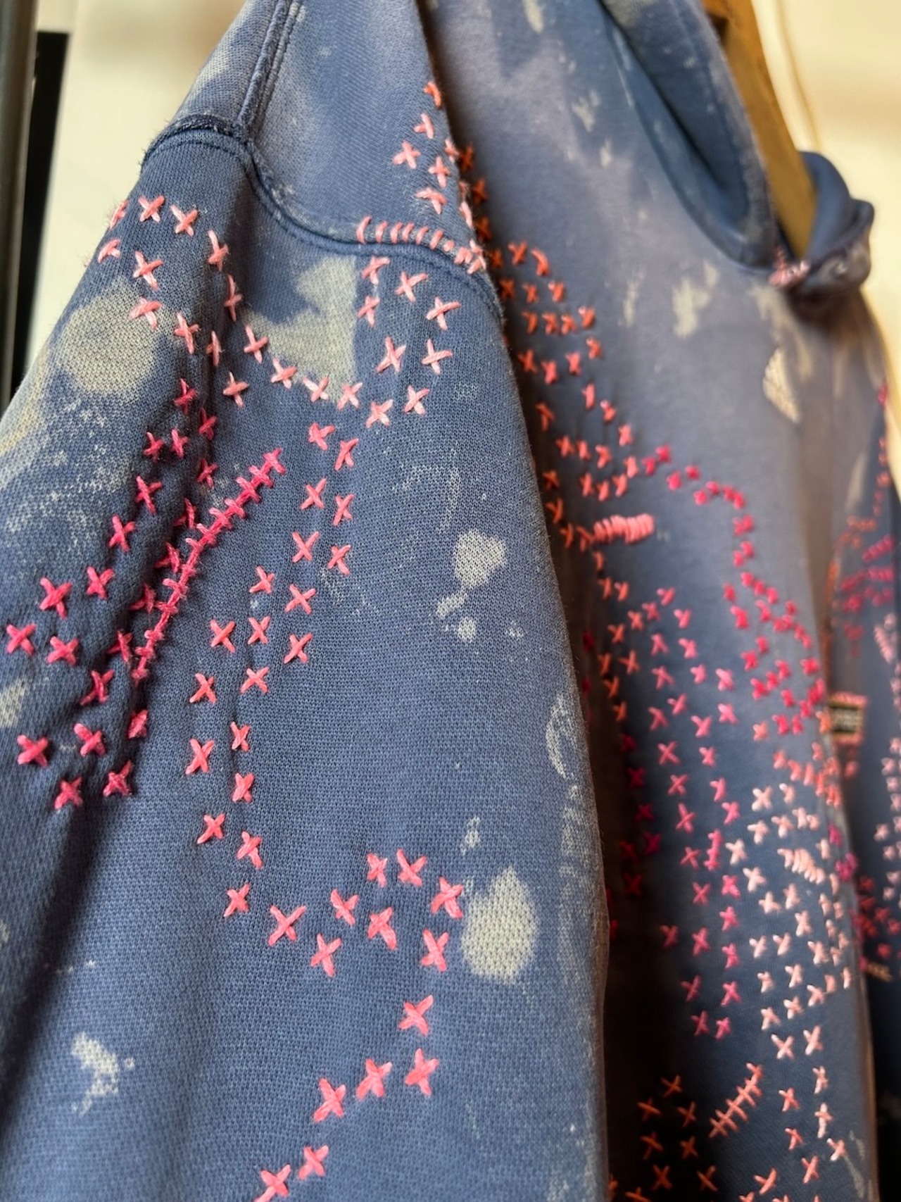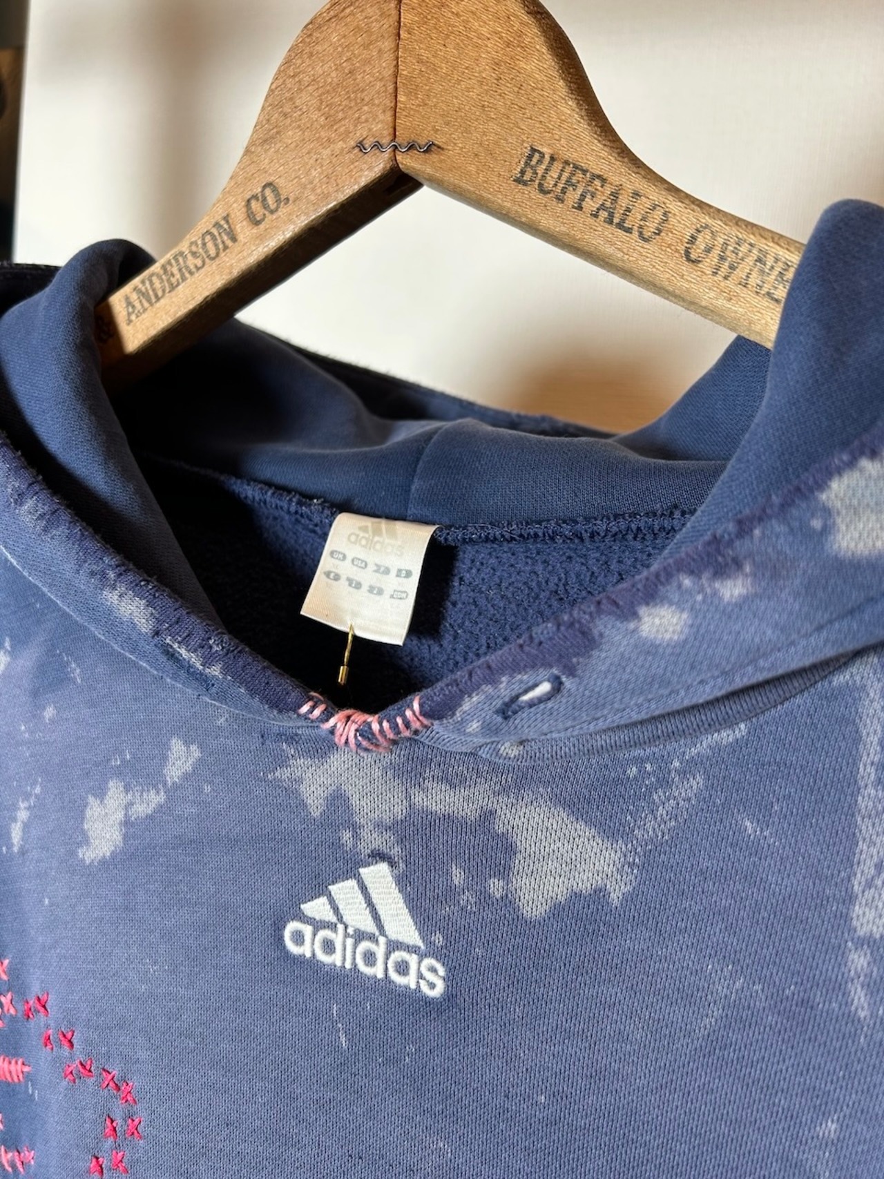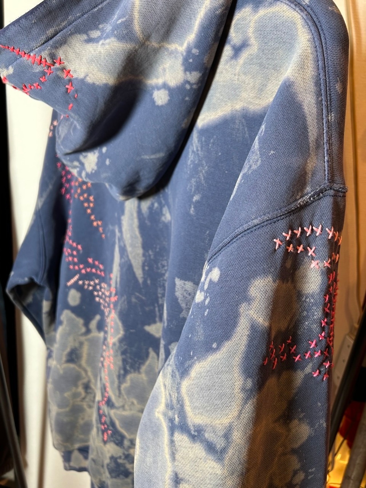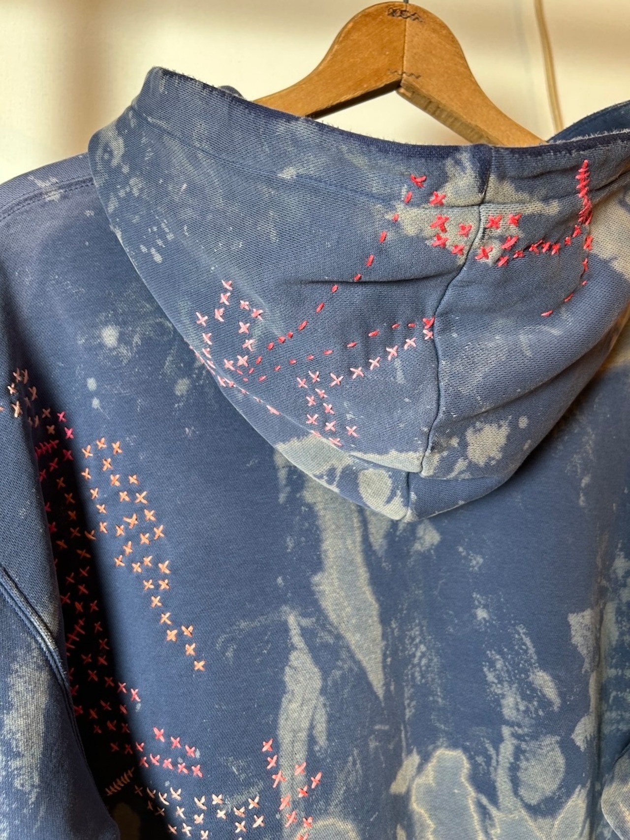 ご覧いただきありがとうございます!こちらのUPRUPR upcycle hoodie Lは、2000年代製のアディダスパーカーを使用したアップサイクル品です。ハンドメイドで変色加工を施し、刺し子を独自にアレンジした鮮やかな刺繍ステッチを散りばめ、ダメージ補修もカラフルに仕上げた一着。ダメージ感と手縫い感が絶妙に調和し、個性的なデザインとなっています!