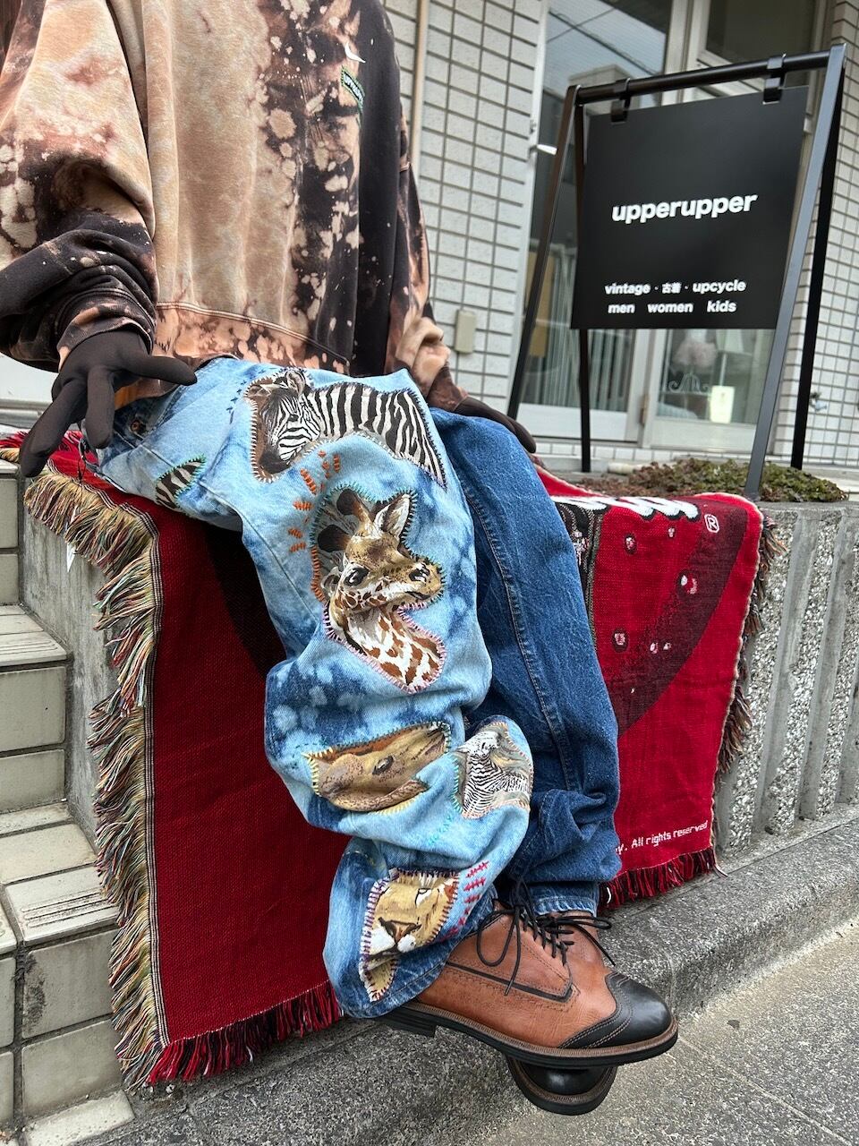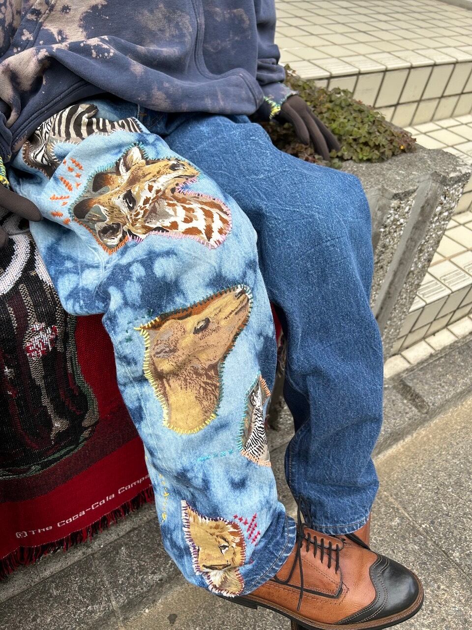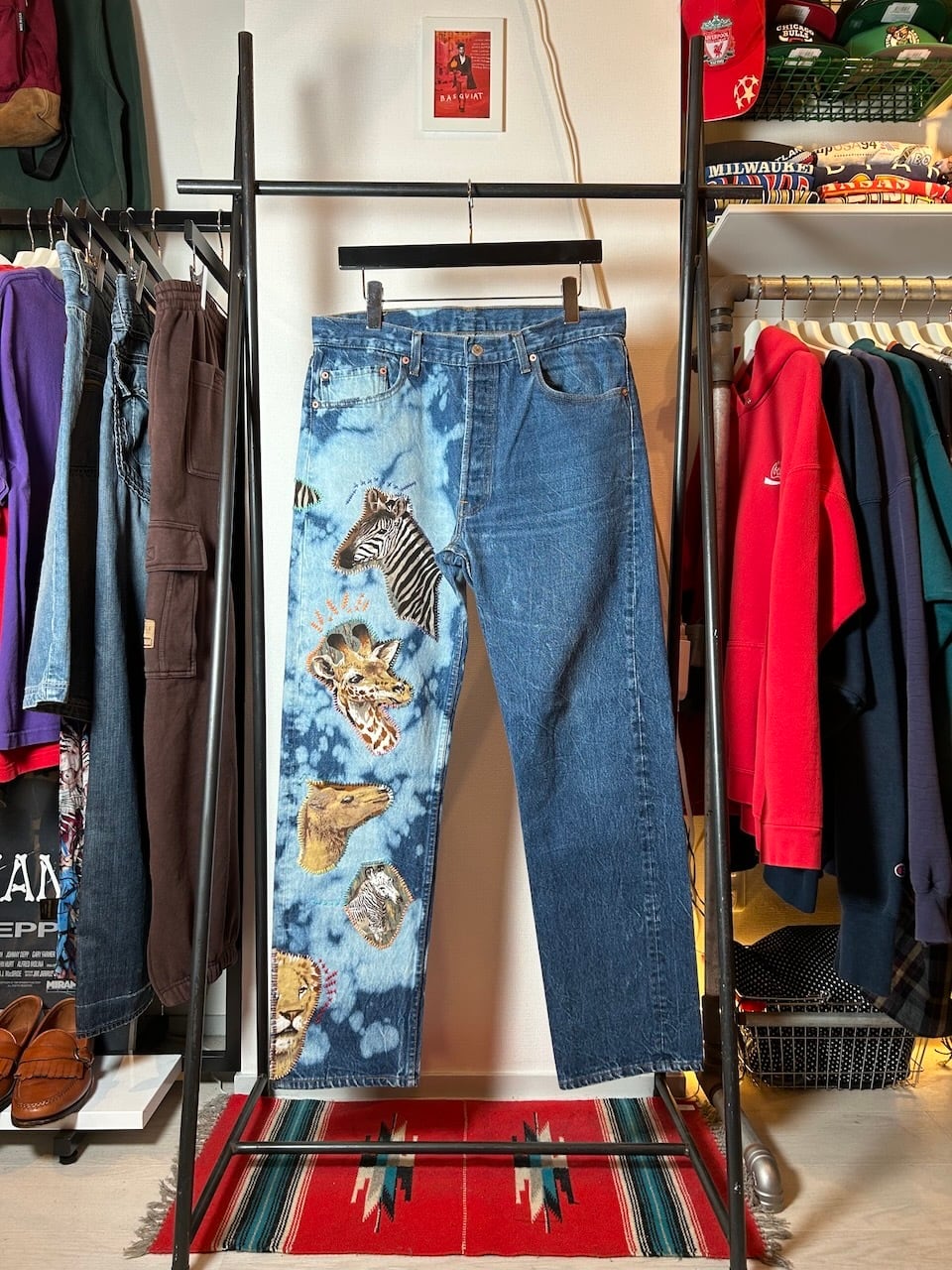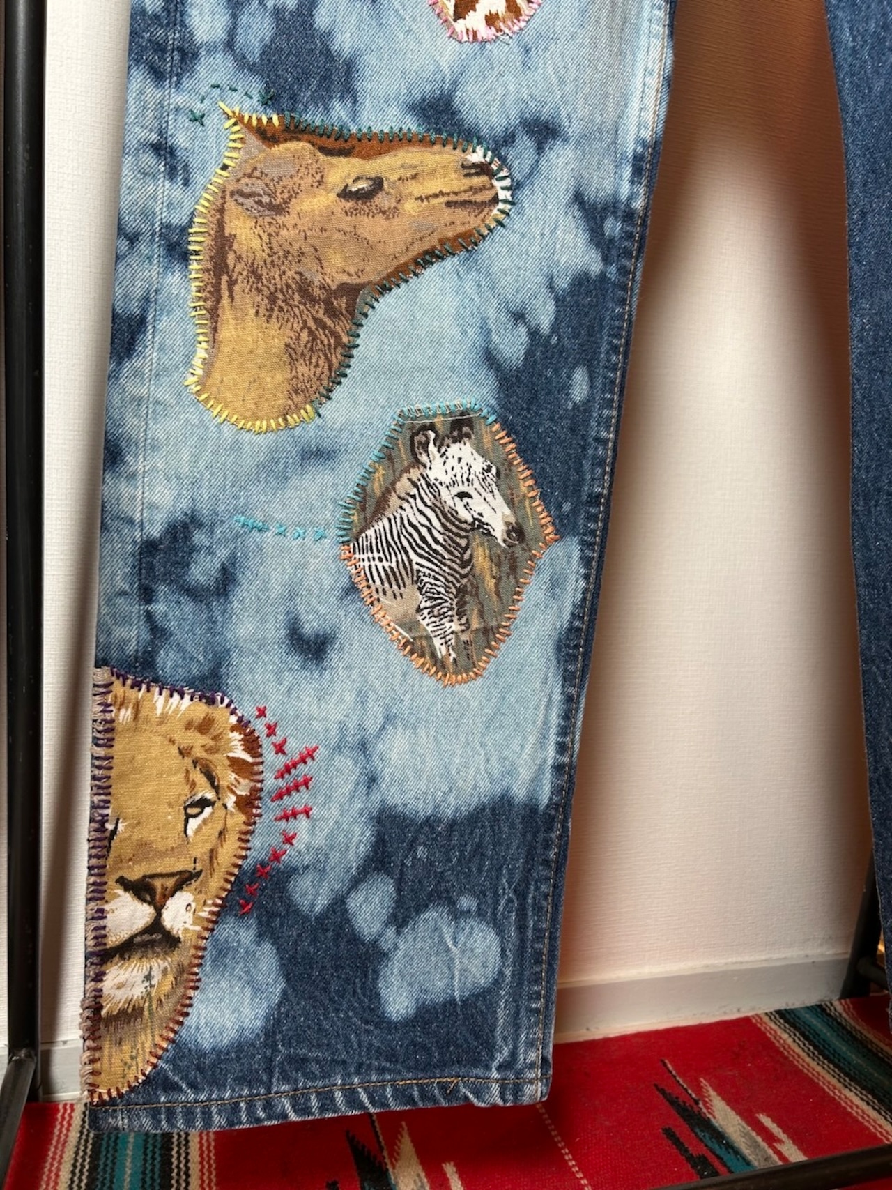 ご覧いただきありがとうございます!こちらのUPRUPR upcycle jeans W36は、90年代アメリカ製のリーバイス501を使用したアップサイクル品です。ハンドメイドで変色加工を主に片側のみ施し、独特の風合いとカラーリングに仕上げました。ビンテージ生地の野生動物イラストアートを手縫い刺繍で施し、美しい草食動物たちを草陰から狙うライオンのデザインや、裏側にひとり佇む熊とそれを取り巻く刺繍ステッチなど魅力溢れる一品です!