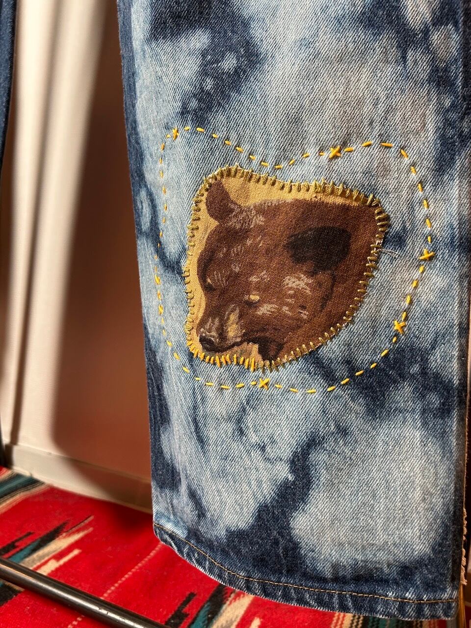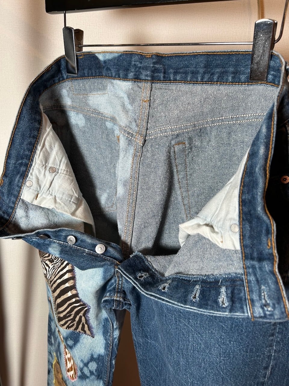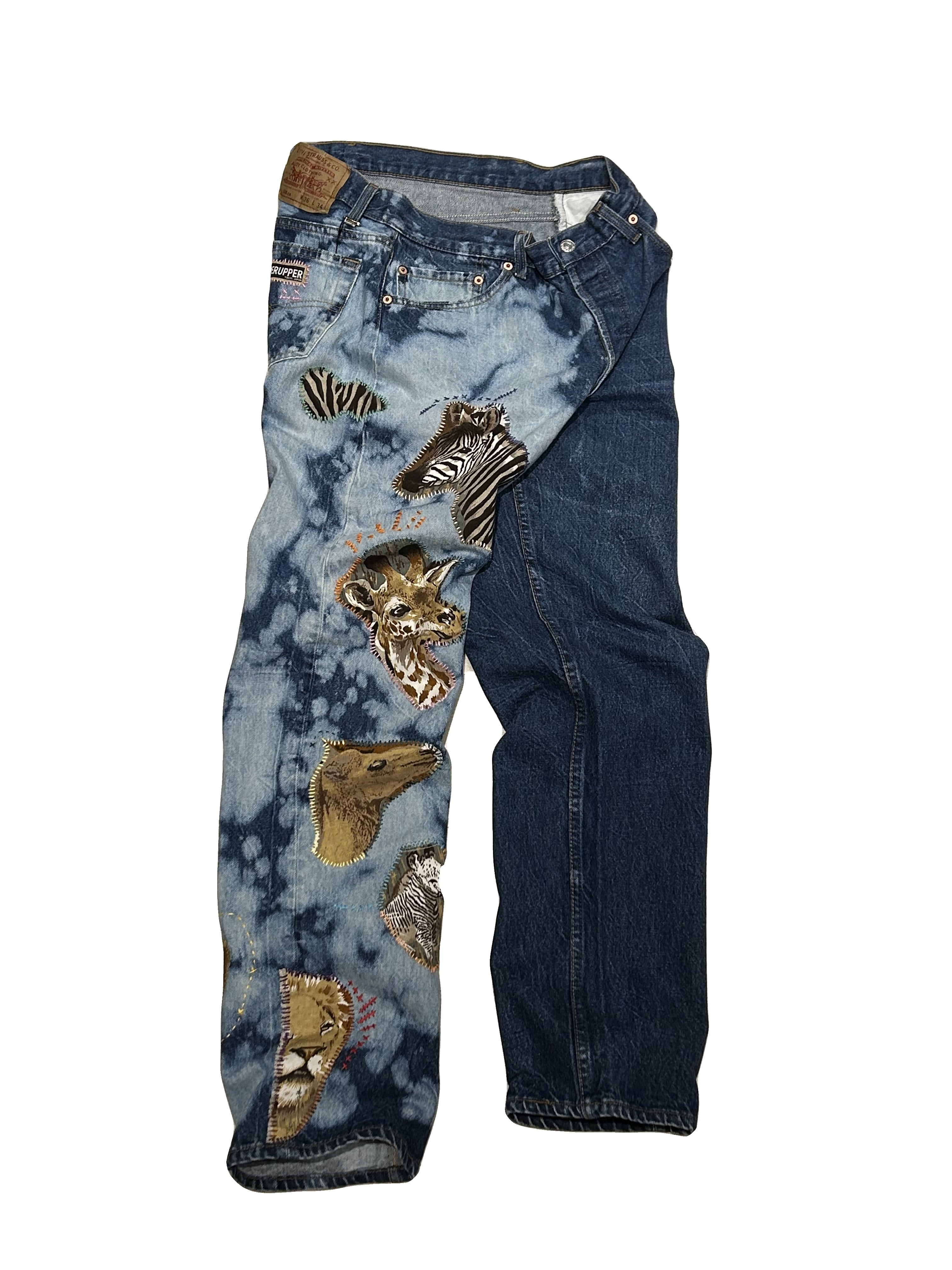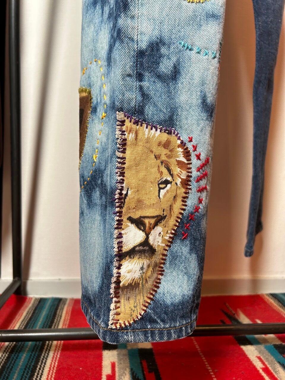 ご覧いただきありがとうございます!こちらのUPRUPR upcycle jeans W36は、90年代アメリカ製のリーバイス501を使用したアップサイクル品です。ハンドメイドで変色加工を主に片側のみ施し、独特の風合いとカラーリングに仕上げました。ビンテージ生地の野生動物イラストアートを手縫い刺繍で施し、美しい草食動物たちを草陰から狙うライオンのデザインや、裏側にひとり佇む熊とそれを取り巻く刺繍ステッチなど魅力溢れる一品です!