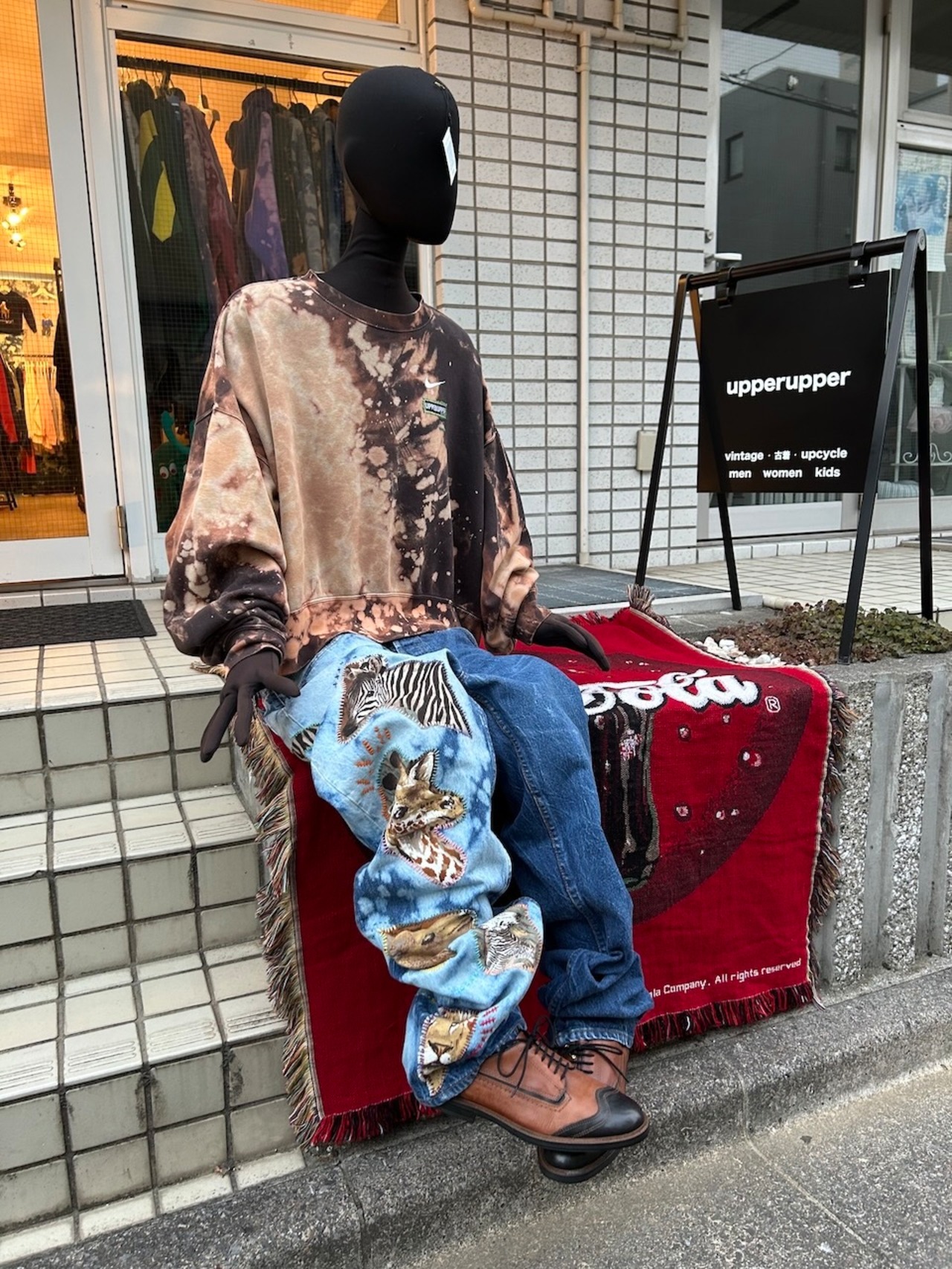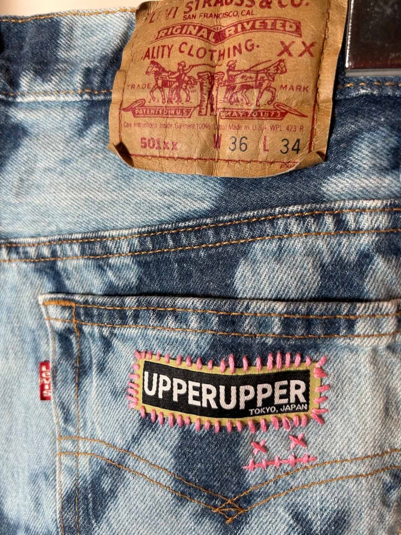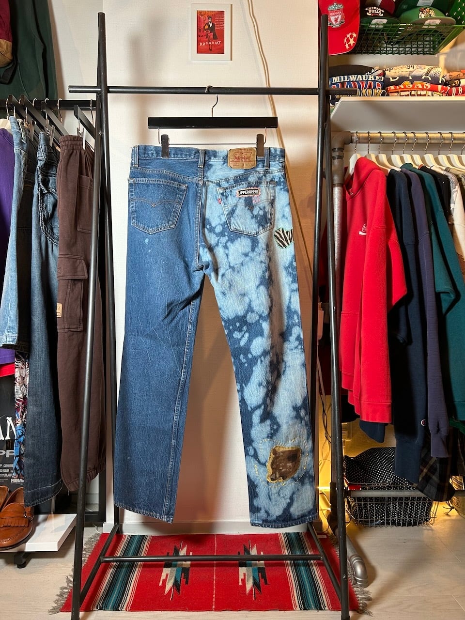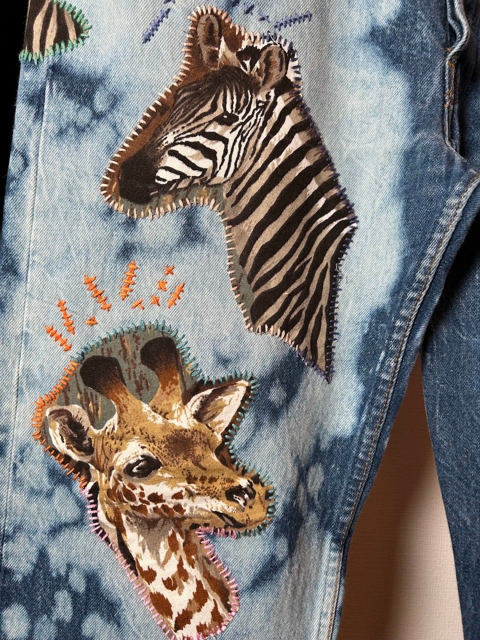 ご覧いただきありがとうございます!こちらのUPRUPR upcycle jeans W36は、90年代アメリカ製のリーバイス501を使用したアップサイクル品です。ハンドメイドで変色加工を主に片側のみ施し、独特の風合いとカラーリングに仕上げました。ビンテージ生地の野生動物イラストアートを手縫い刺繍で施し、美しい草食動物たちを草陰から狙うライオンのデザインや、裏側にひとり佇む熊とそれを取り巻く刺繍ステッチなど魅力溢れる一品です!