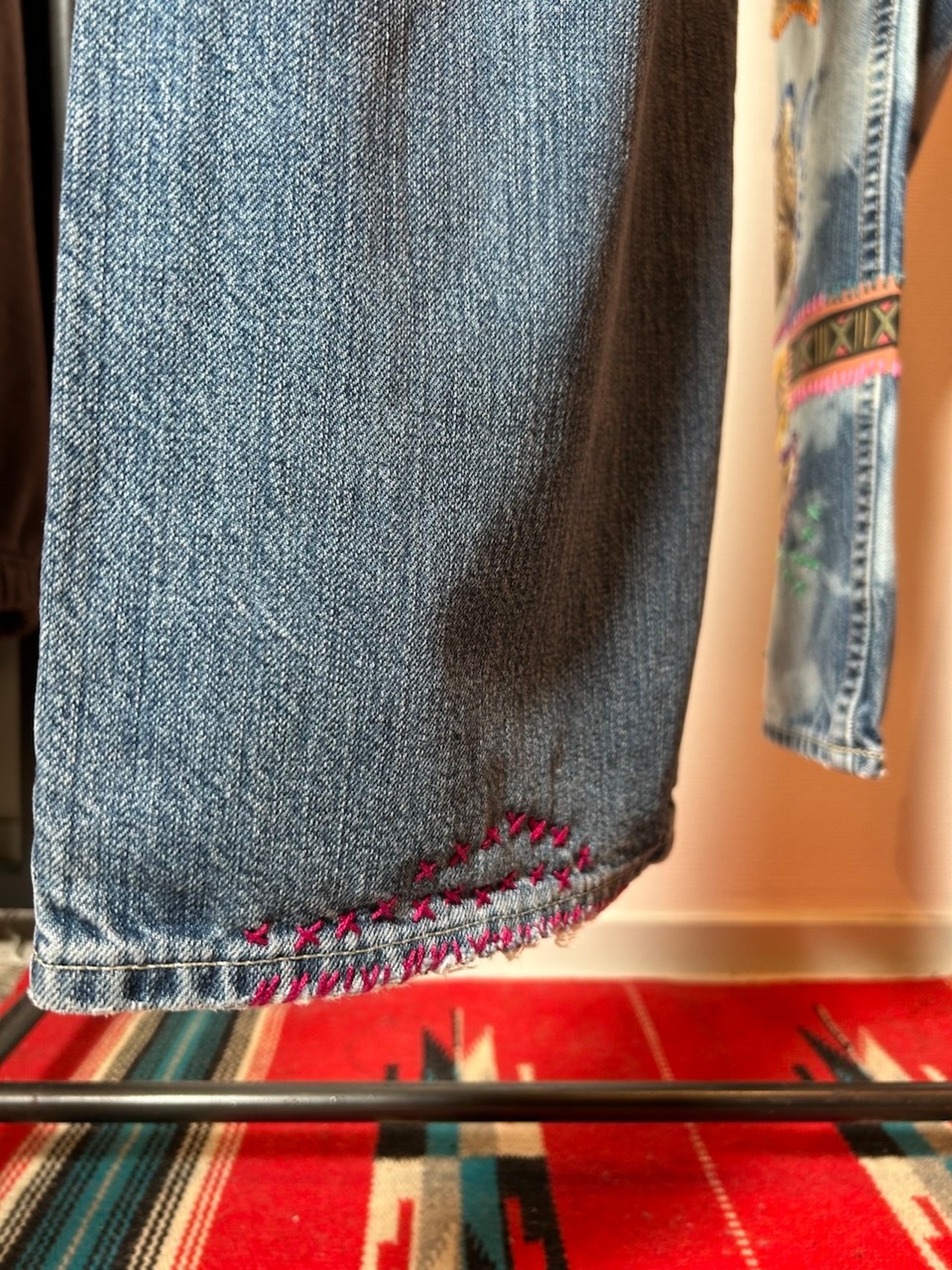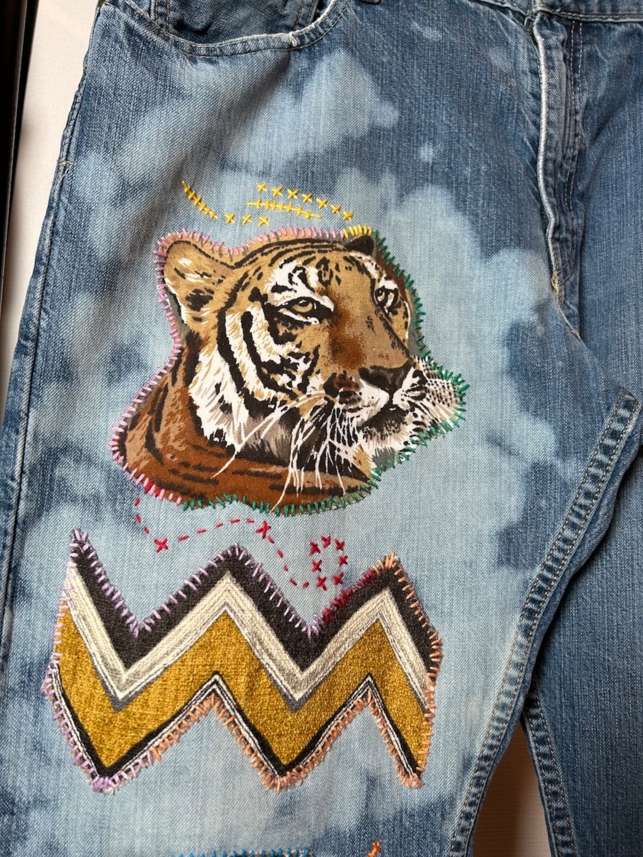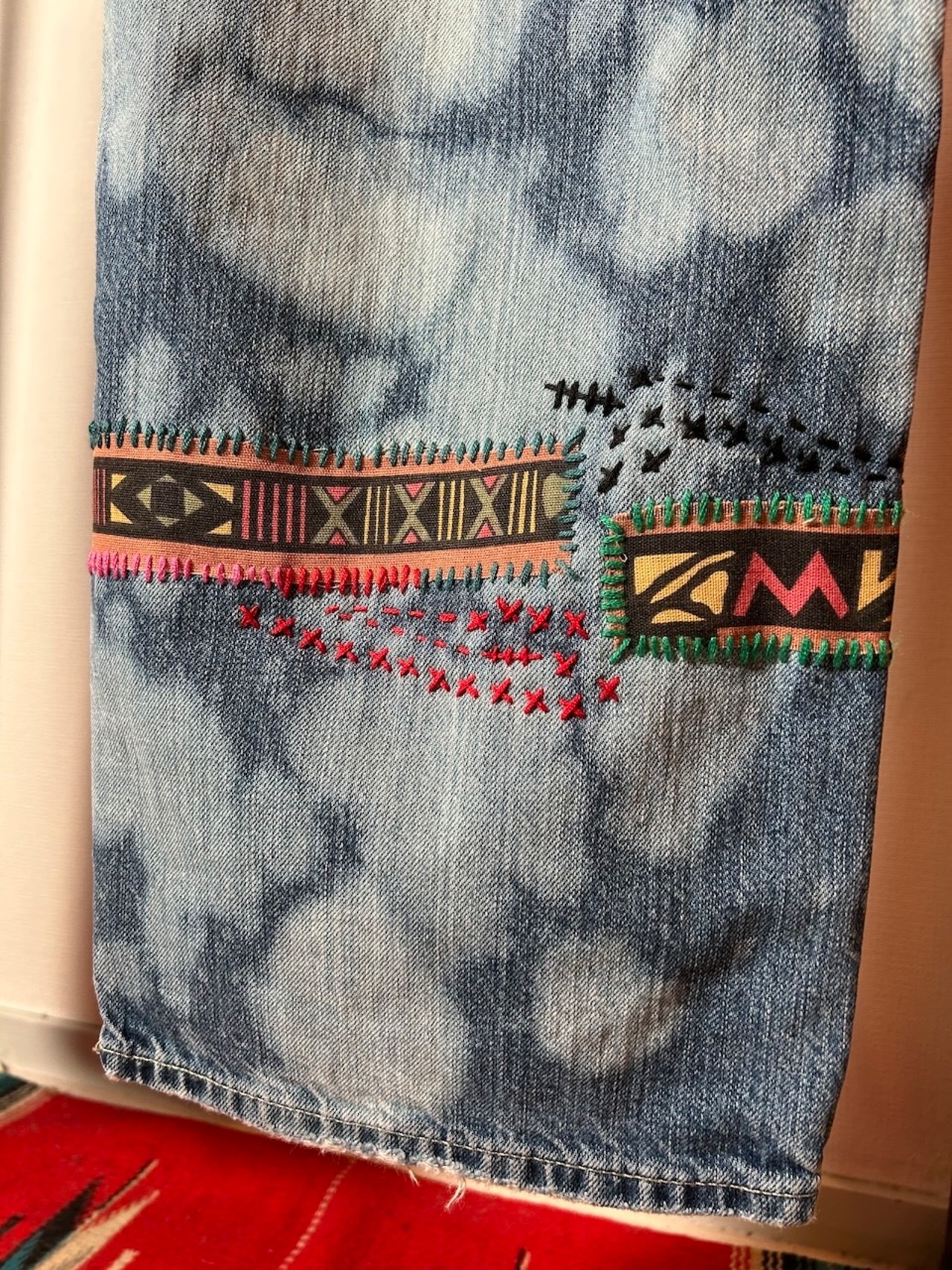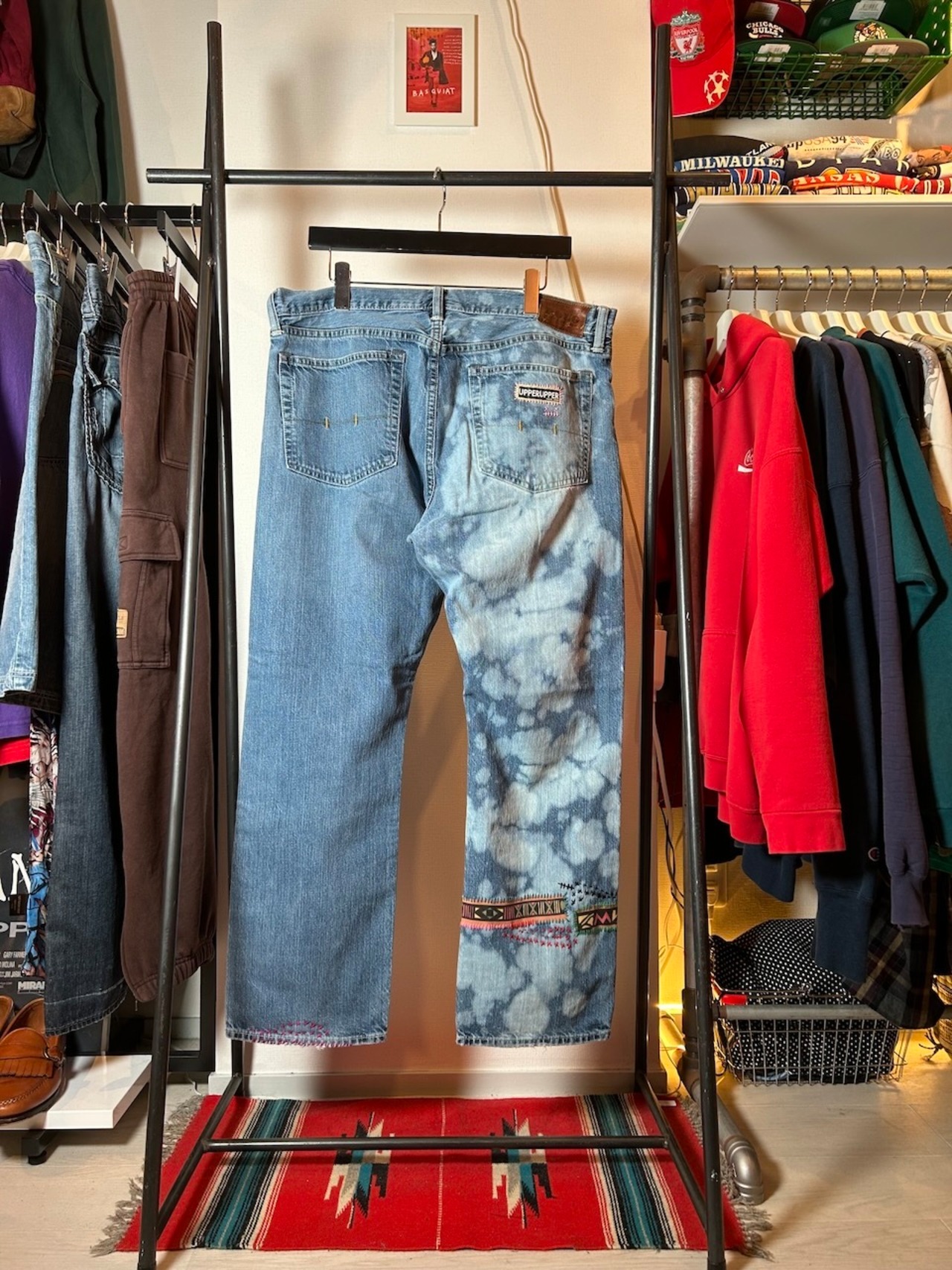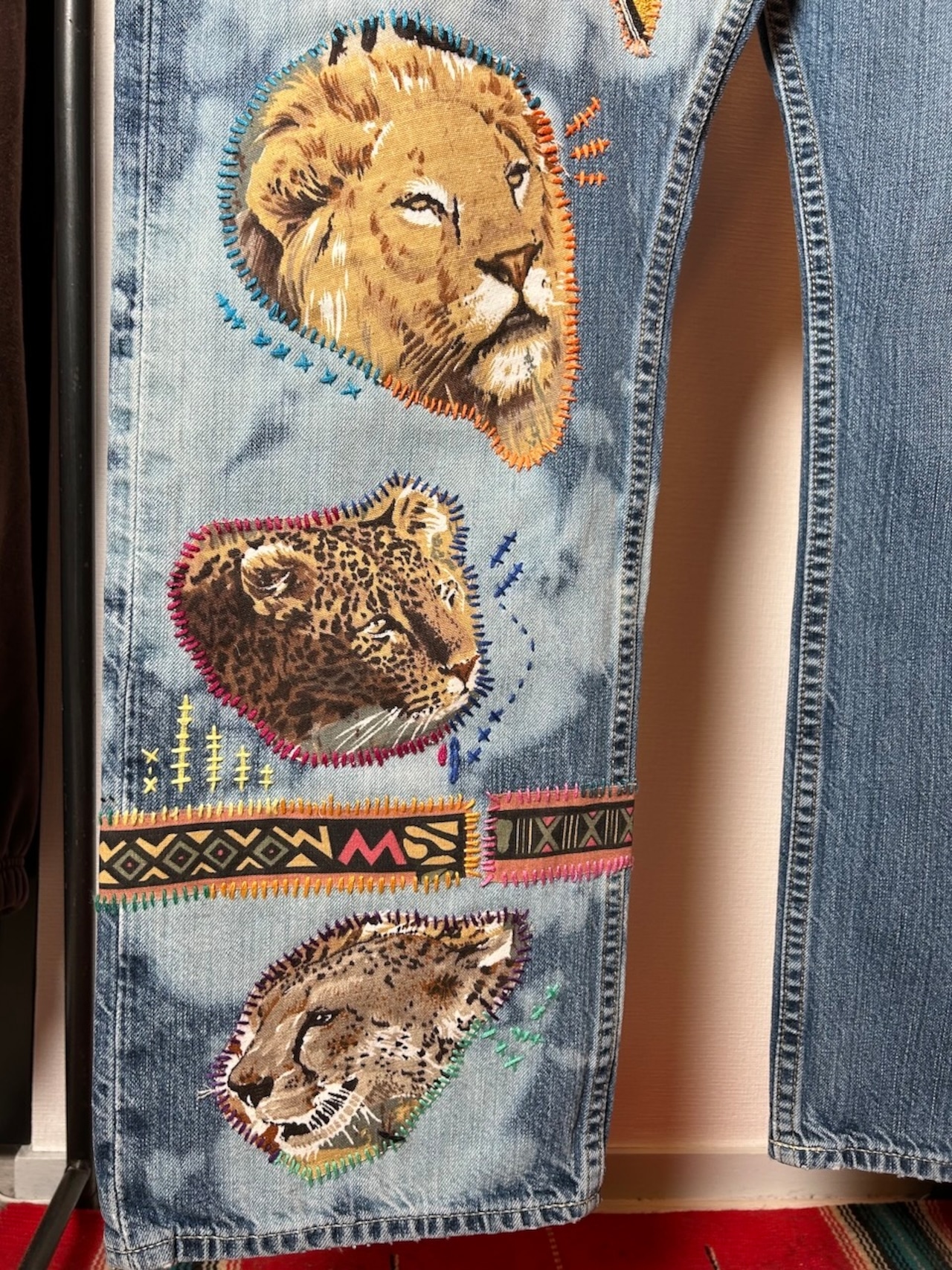 ご覧いただきありがとうございます!こちらのUPRUPR upcycle jeans W36は、2000年代製のポロラルフローレンのジーンズを使用したアップサイクル品です。ハンドメイドで変色加工を施し、ユニークなカラーリングに仕上げました。ビンテージの野生動物イラストなどのアート生地を手縫いで装飾し、ワイルドな印象を持たせました。