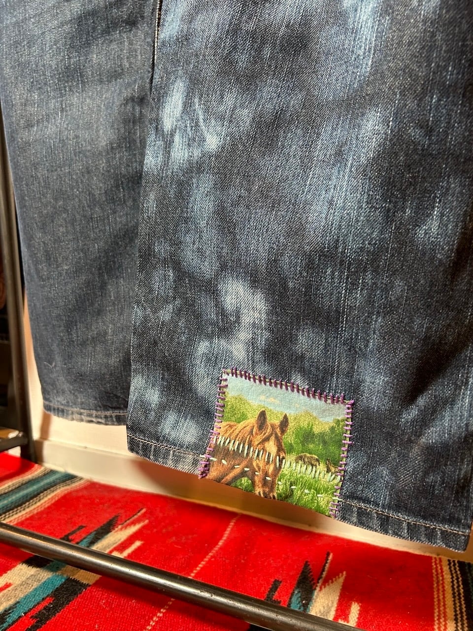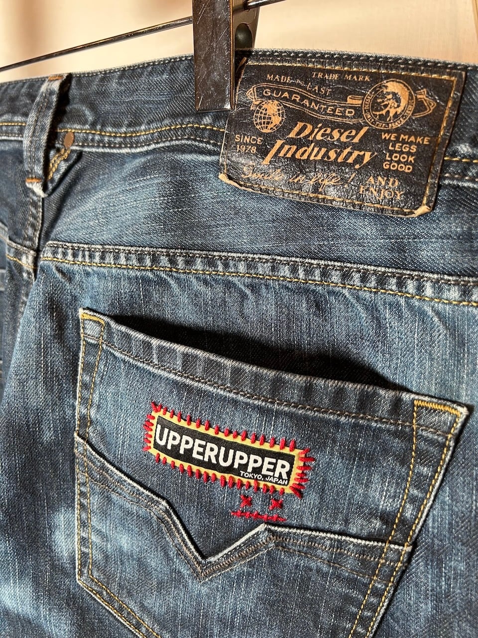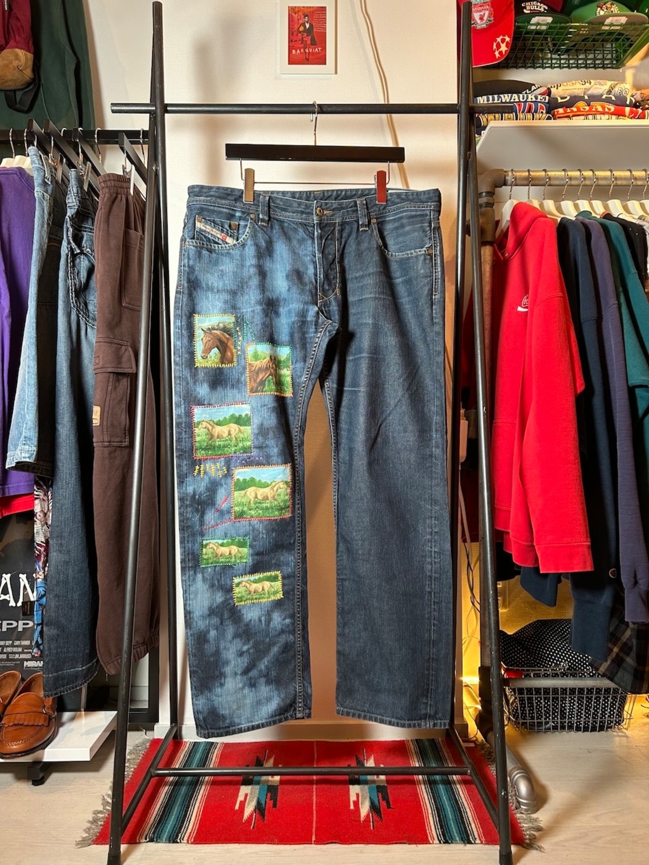 ご覧いただきありがとうございます!こちらのUPRUPR upcycle jeans W38は、2000年代後期イタリア製のDieselジーンズを使用したアップサイクル品です。ハンドメイドで変色加工を施し、ビンテージ感溢れる野生馬のイラストアート生地を手縫いで装飾しました。上質なデニムに個性的なデザインが映える、一点物の魅力的が詰まった一本です!