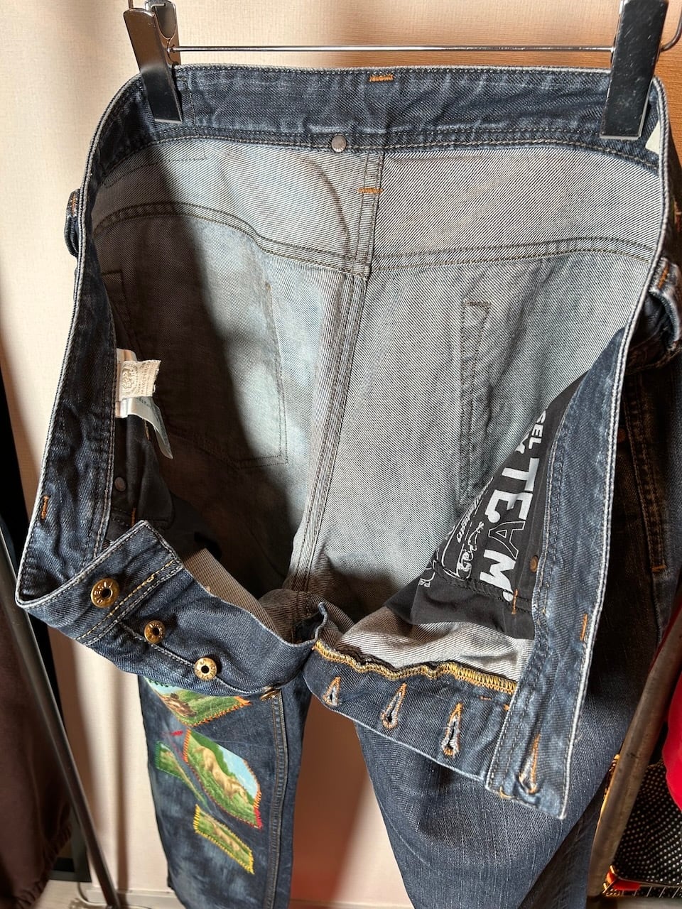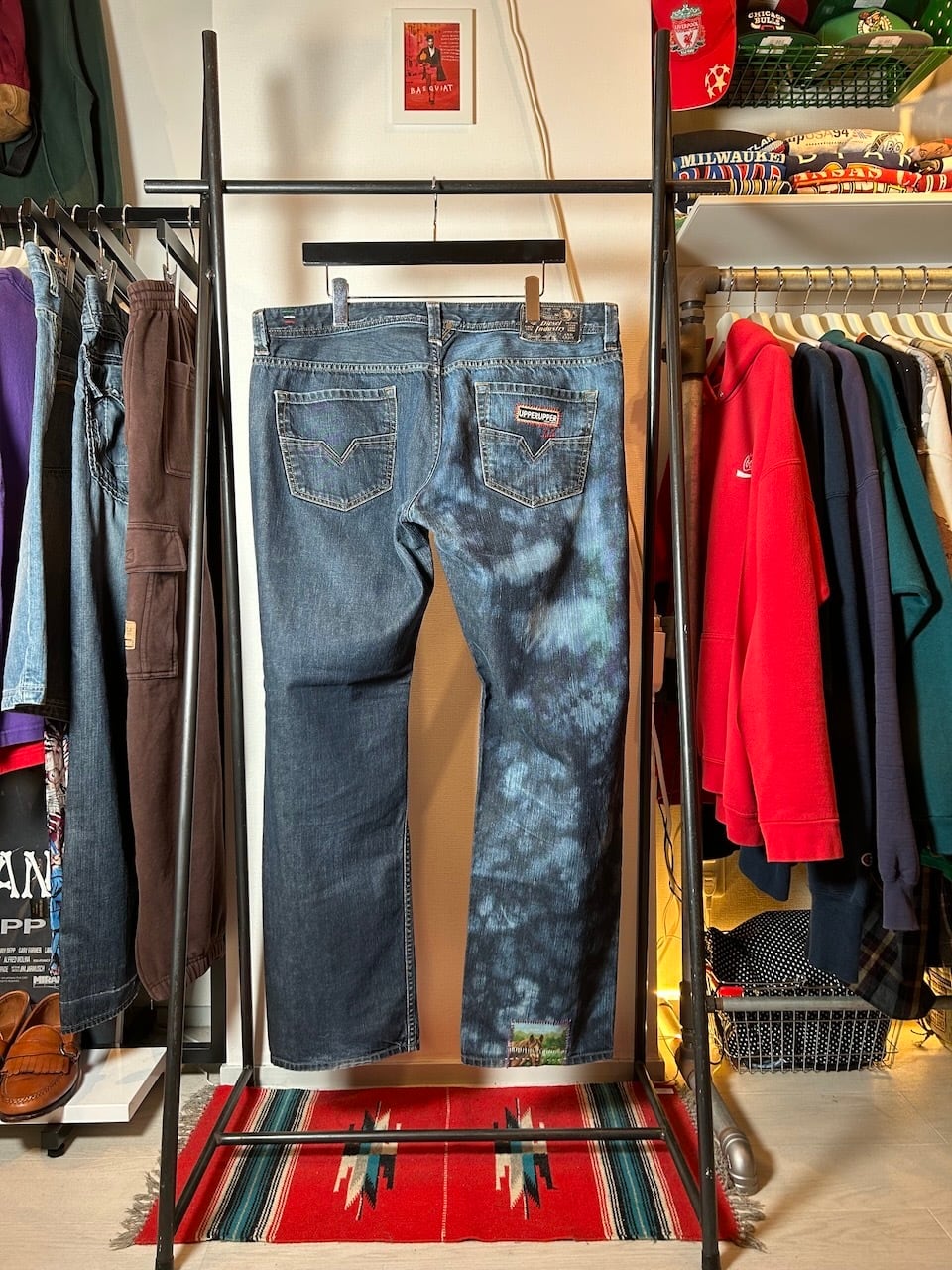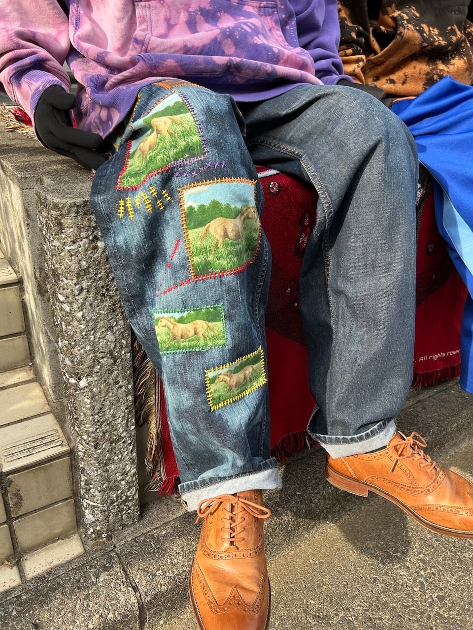 ご覧いただきありがとうございます!こちらのUPRUPR upcycle jeans W38は、2000年代後期イタリア製のDieselジーンズを使用したアップサイクル品です。ハンドメイドで変色加工を施し、ビンテージ感溢れる野生馬のイラストアート生地を手縫いで装飾しました。上質なデニムに個性的なデザインが映える、一点物の魅力的が詰まった一本です!