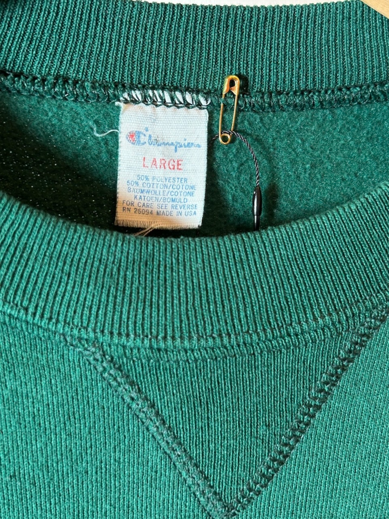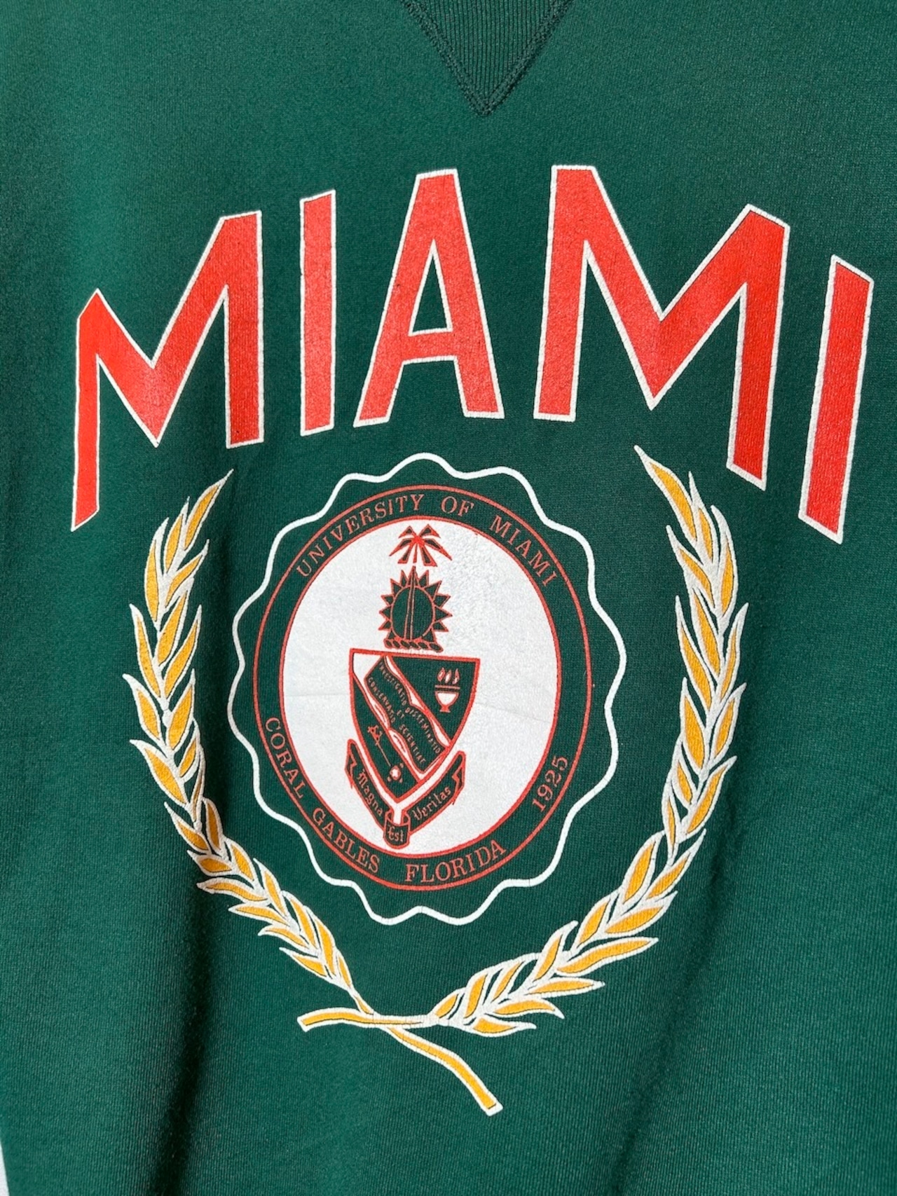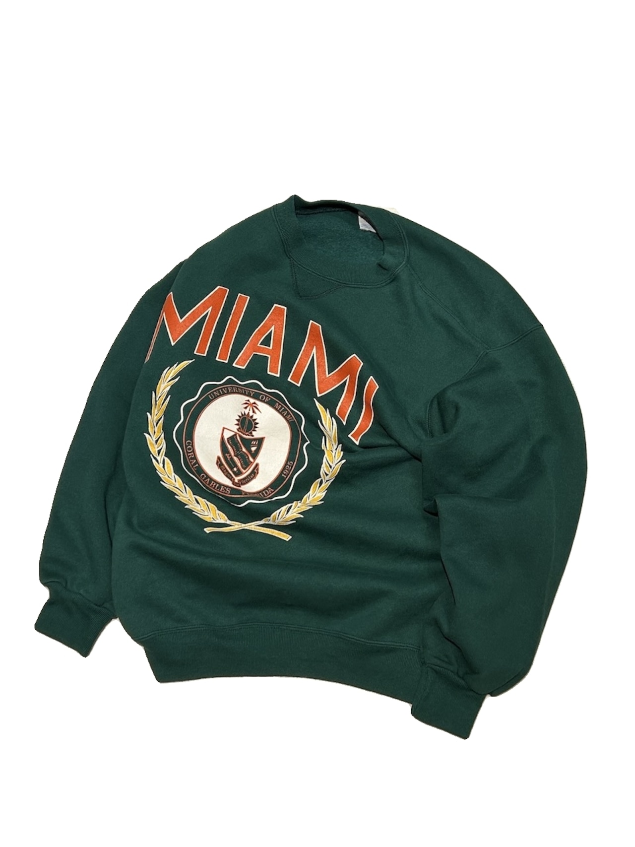 ご覧いただきありがとうございます!こちらの90's Champion Miami sweatshirt Lは、90年代初期アメリカ製のChampionスウェットで、マイアミ大学のデザインが施されています。ボディカラーとプリントの配色が魅力的で、当時のアメカジを代表するカレッジスウェットの一着です。
