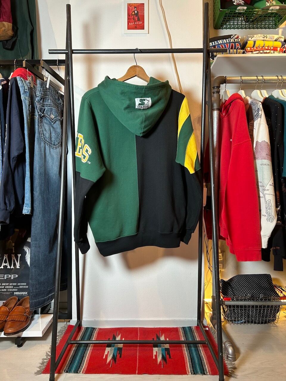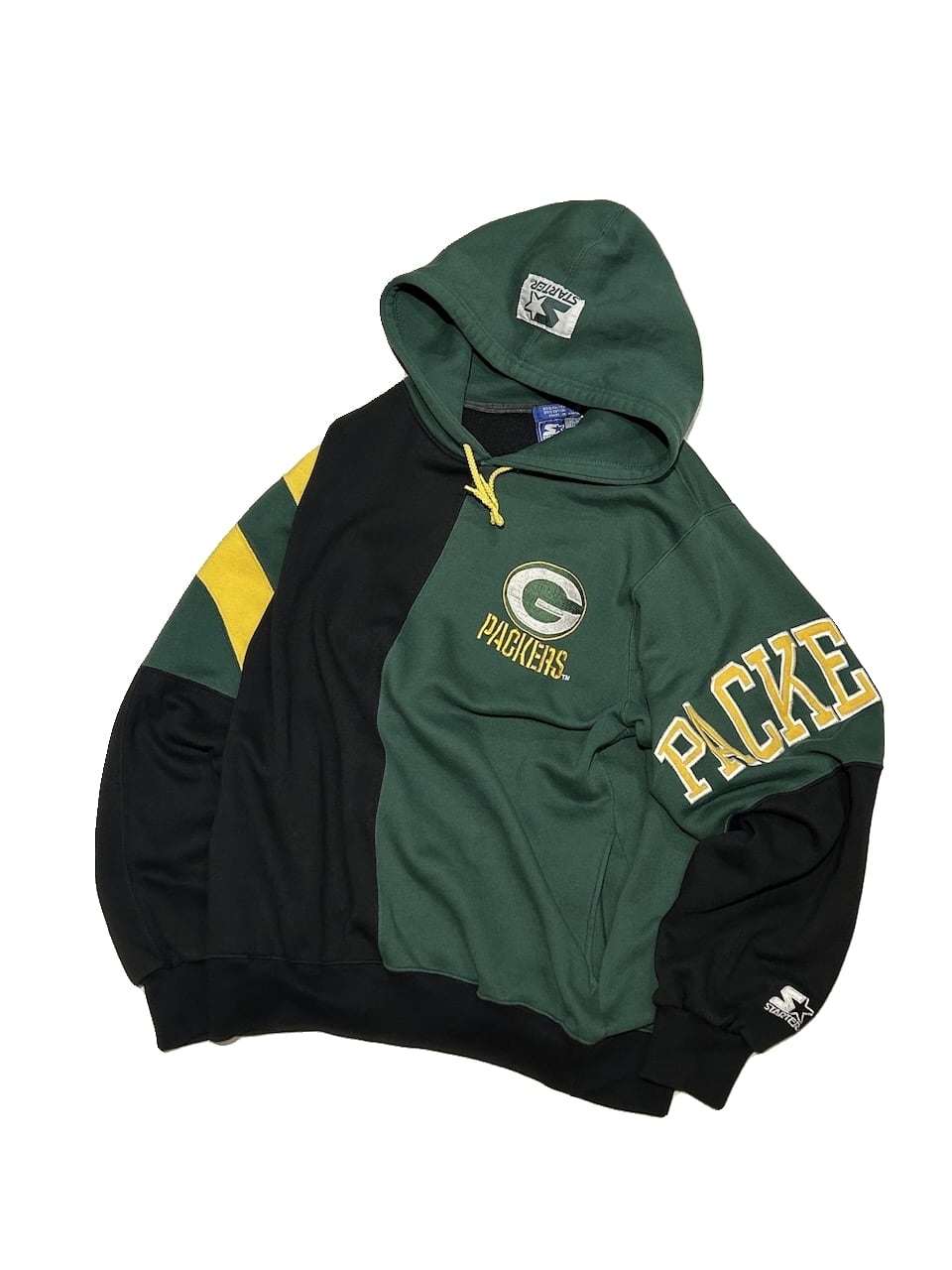 ご覧いただきありがとうございます!こちらの90's Starter Packers hoodie Mは、90年代製のStarterによるグリーンベイパッカーズNFLパーカーです。切替のカラーブロックが特徴的で、胸と袖にはロゴ刺繍が施された特別な一着です。