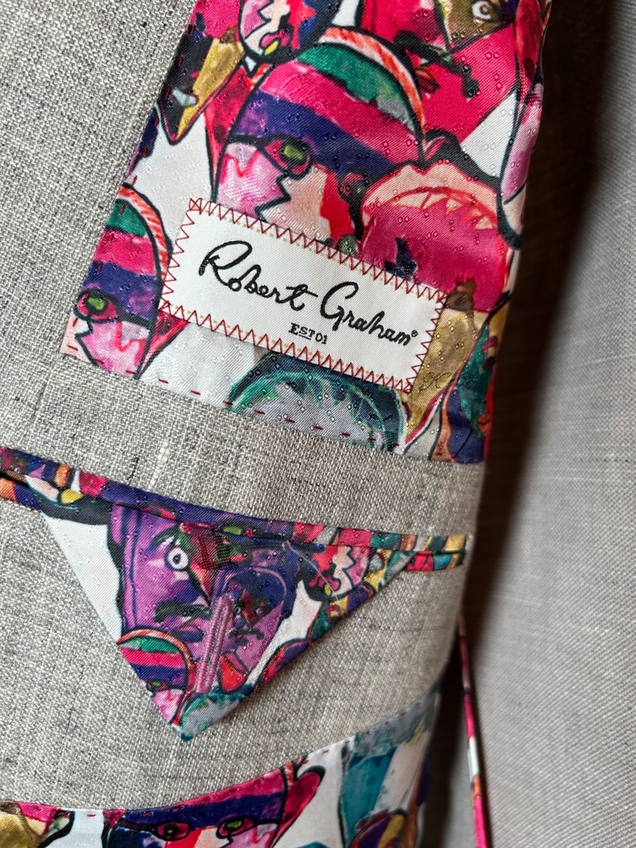 ご覧いただきありがとうございます!こちらの10's Robert Graham blazer Lは、2010年代製のロバート・グラハムによるテーラードジャケットです。リネンとコットンを使用した爽やかな生地感と、裏地に施されたピカソを彷彿とさせるアートなイラストが特徴的な一着です!二つボタンでクラシックなスタイルが、カジュアルなインナーやボトムスとの相性もグッド。