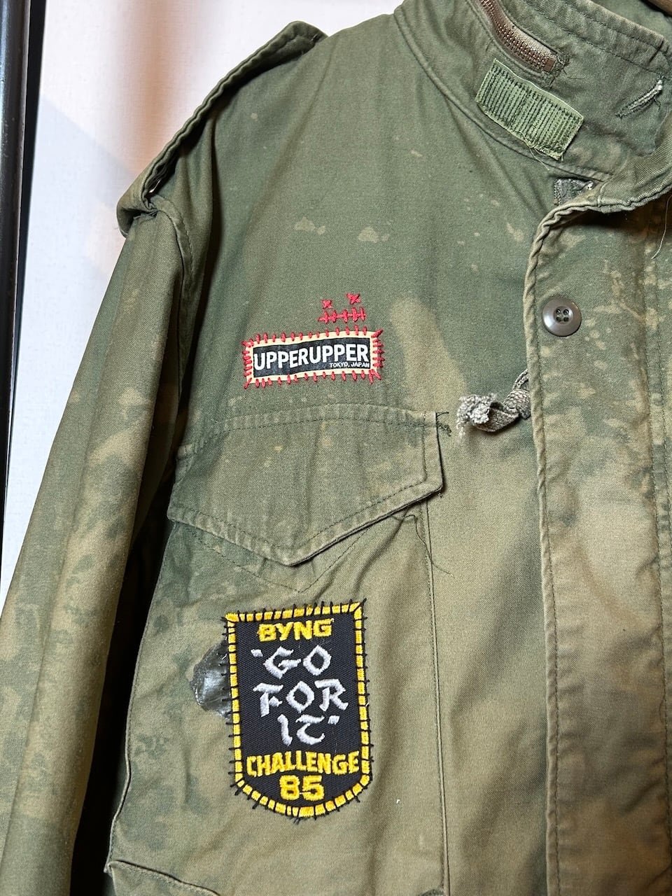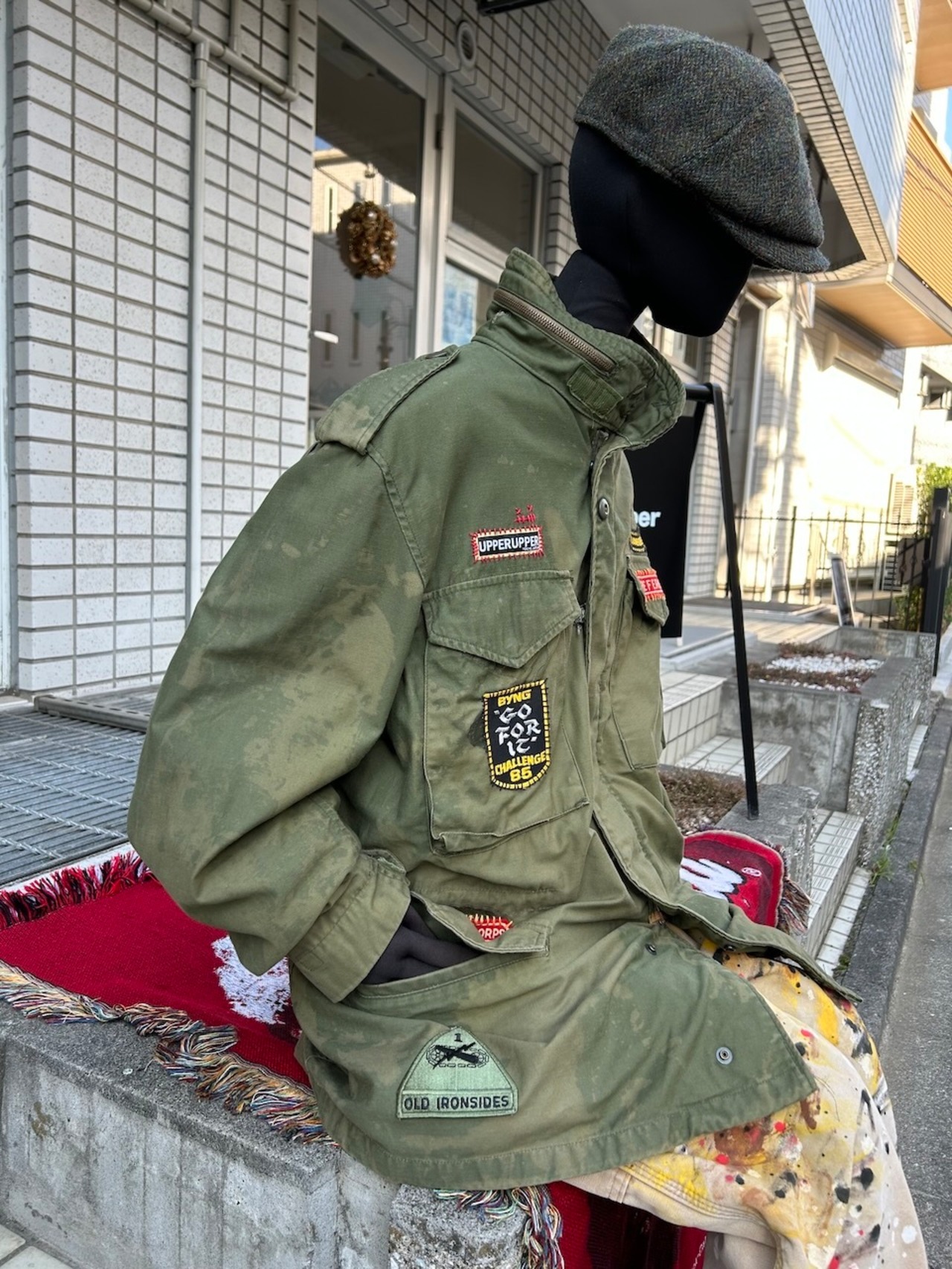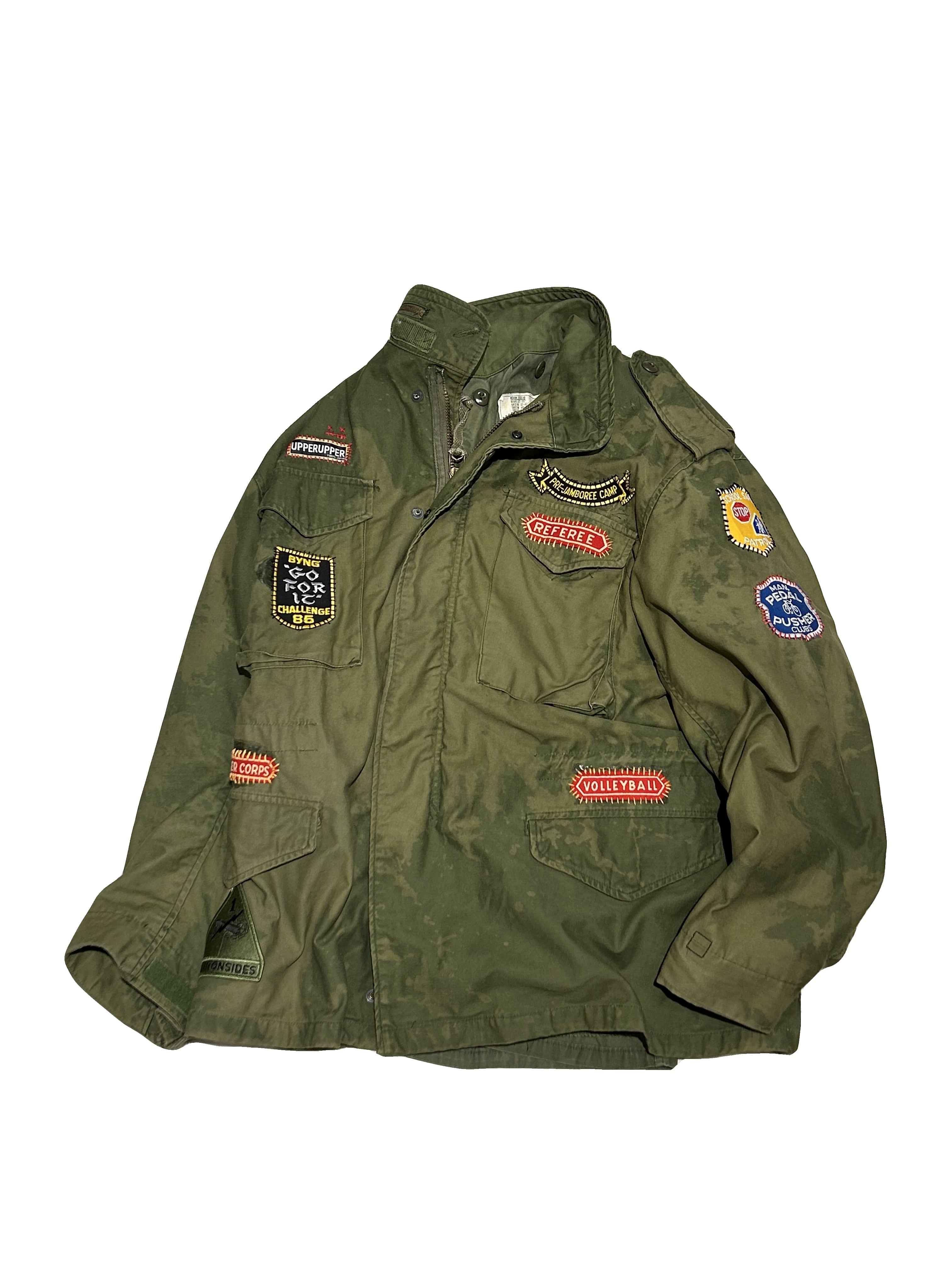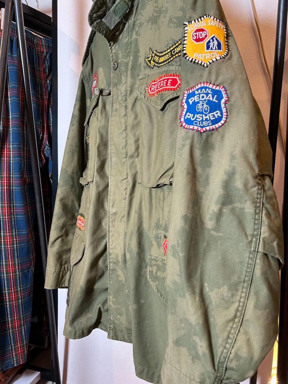 ご覧いただきありがとうございます!こちらの1980 US Army M-65 Mは、1980年製の米軍M-65ジャケットをベースにしたアップサイクルアイテムです。変色加工を施し、独特の色むらを表現。さらに、50~80年代のPEACEな雰囲気を持つビンテージワッペンを複数使い、手縫いステッチで装飾した特別な一着となっています!