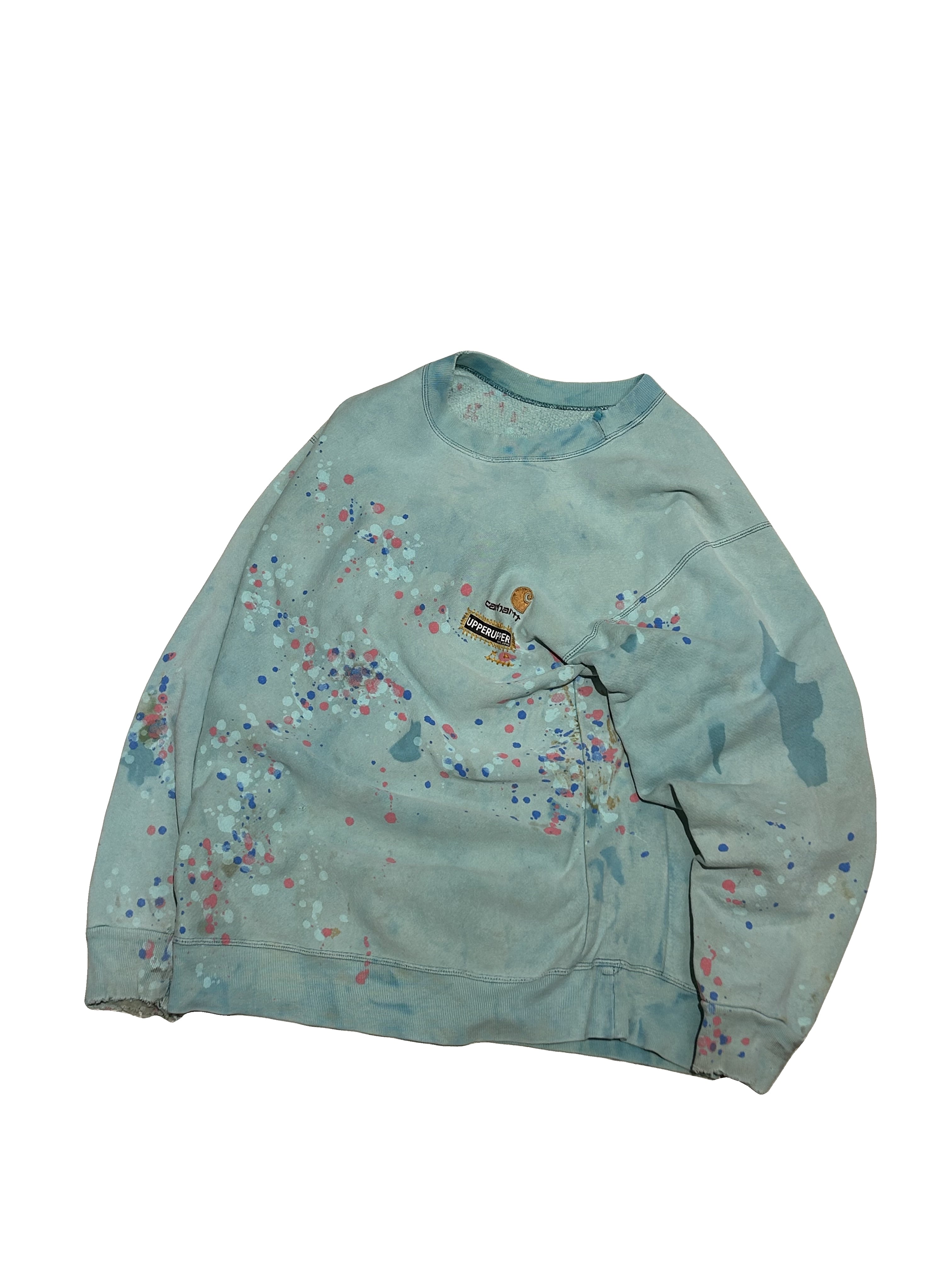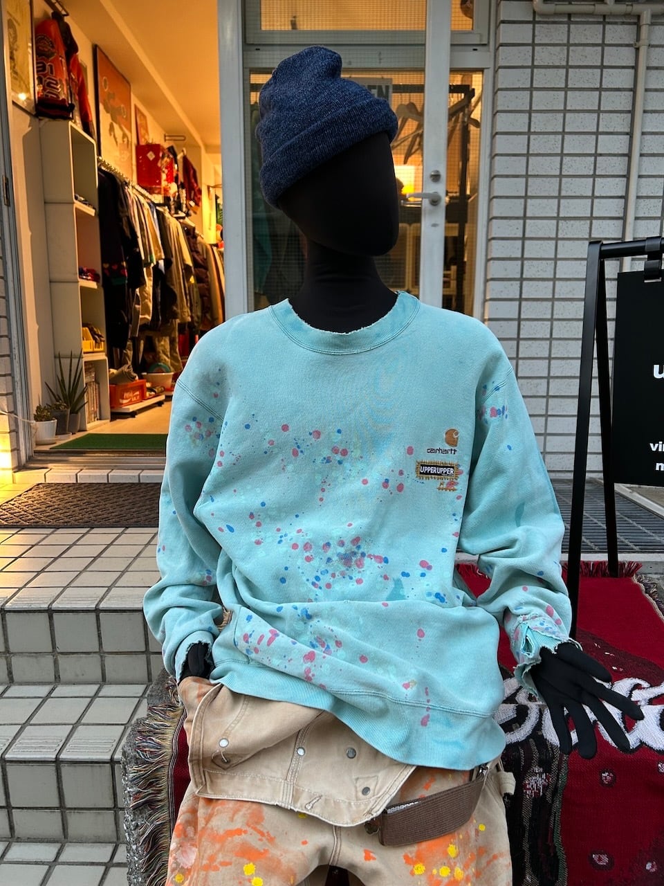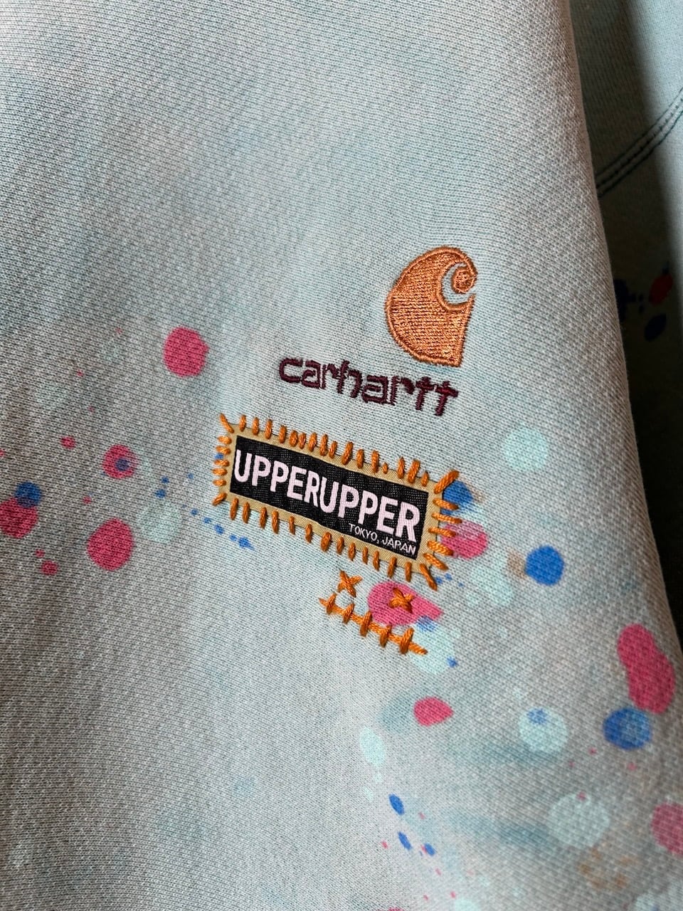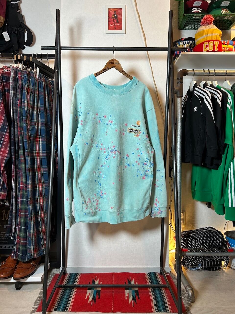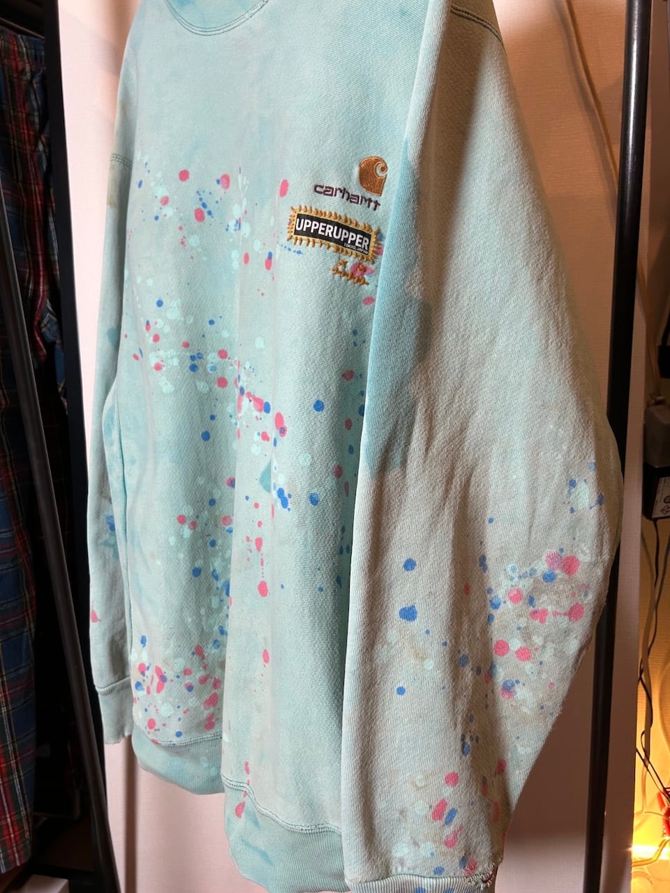 ご覧いただきありがとうございます!こちらのUPRUPR upcycle sweatshirt XLは、1990年頃のCarharttリバースウィーブスウェットを使用したアップサイクル品です。元々のダメージとそのボロい雰囲気を活かし、変色加工により独特の色むらを作り出し、発色の良いペイントを散りばめ独特なアート感溢れる一着に仕上げました。