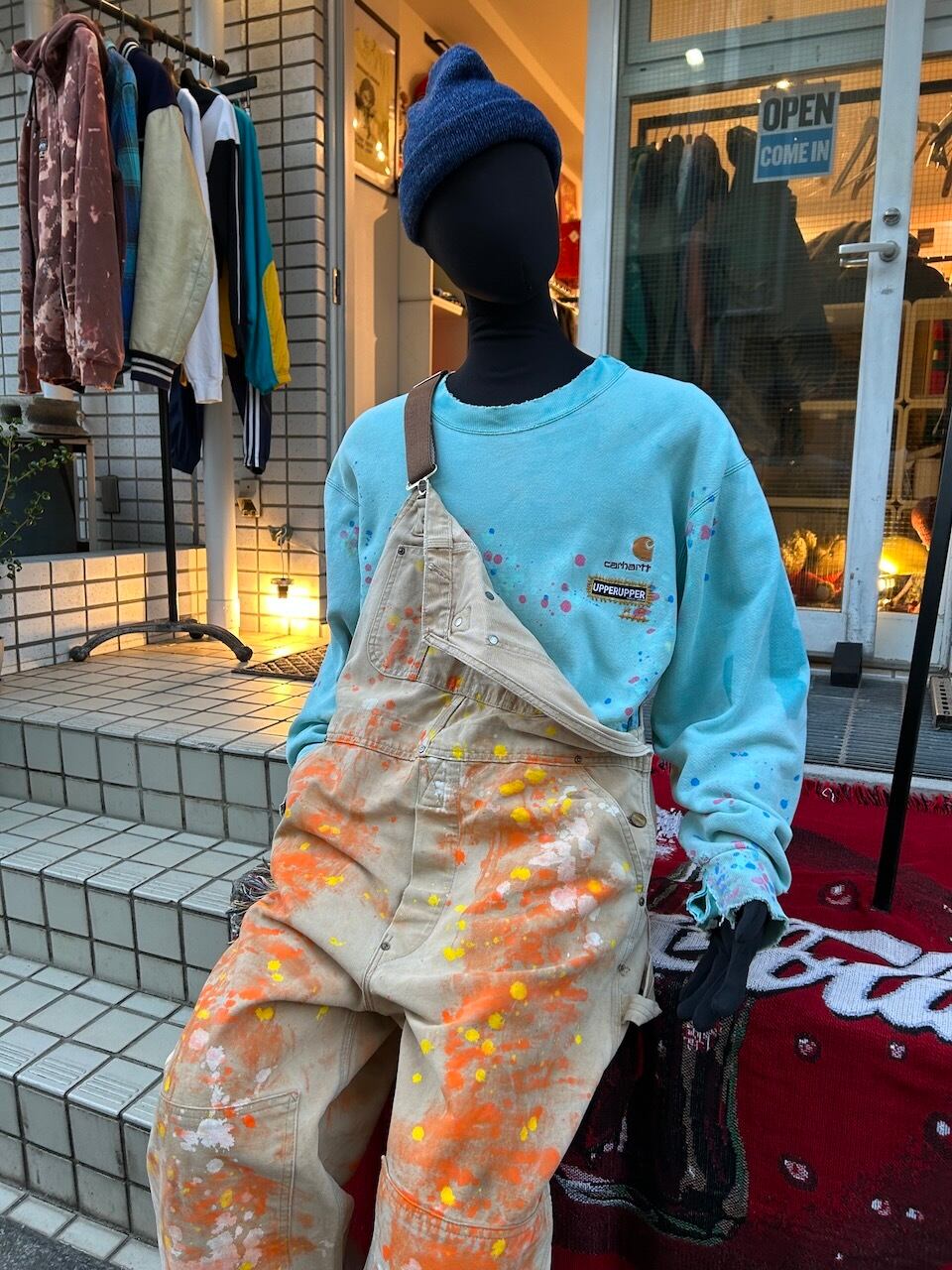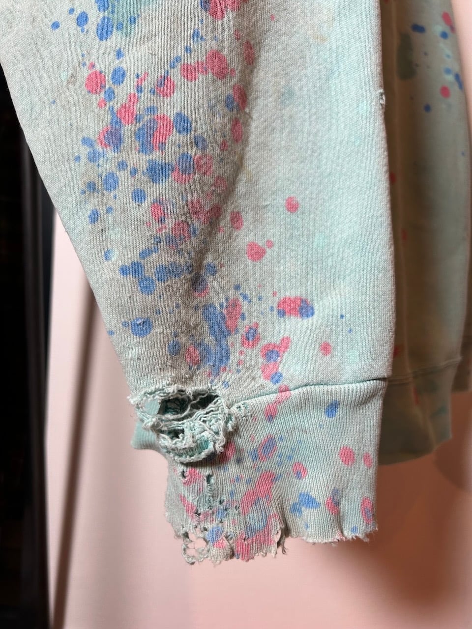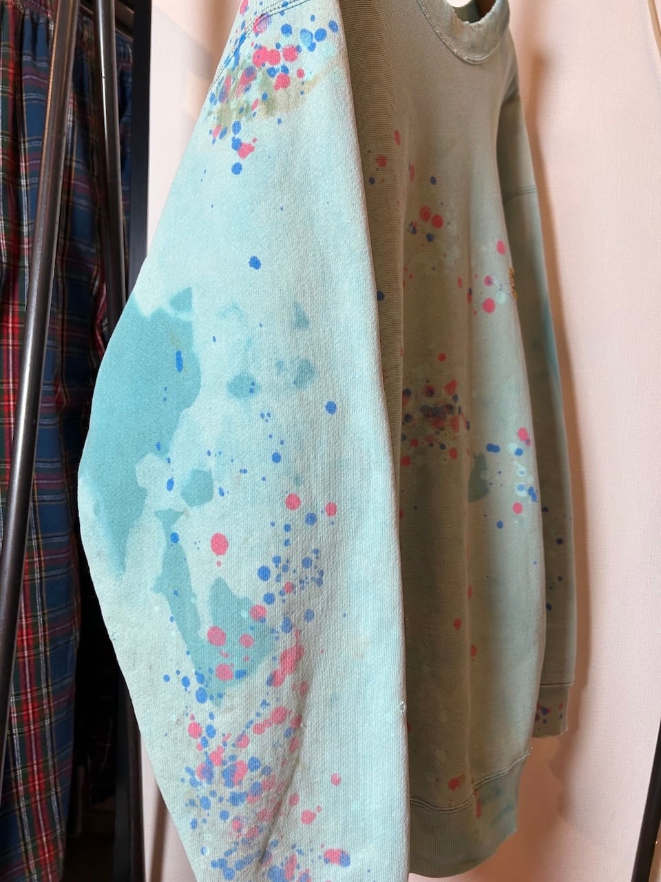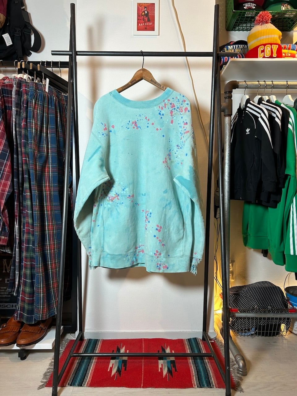 ご覧いただきありがとうございます!こちらのUPRUPR upcycle sweatshirt XLは、1990年頃のCarharttリバースウィーブスウェットを使用したアップサイクル品です。元々のダメージとそのボロい雰囲気を活かし、変色加工により独特の色むらを作り出し、発色の良いペイントを散りばめ独特なアート感溢れる一着に仕上げました。