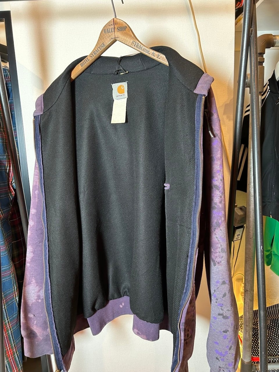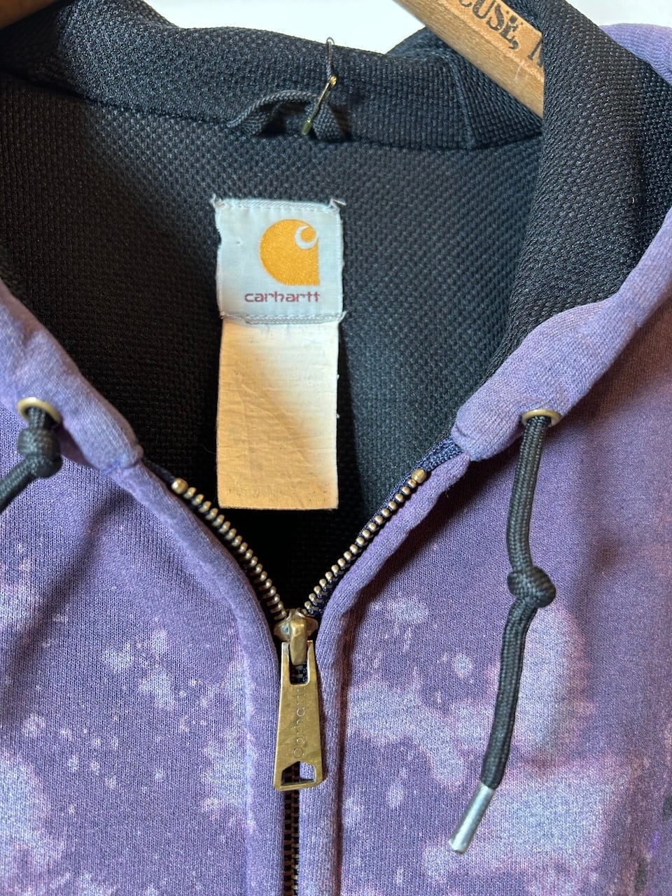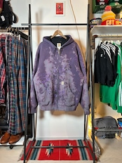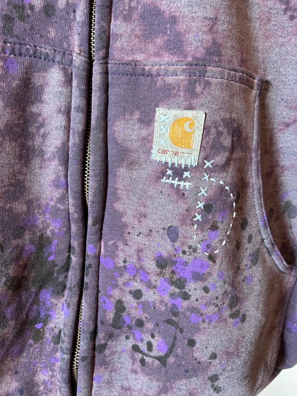 ご覧いただきありがとうございます!こちらのUPRUPR upcycle zip hoodie XLは、1990年代後期のCarharttジップパーカーをベースにしたアップサイクル品です。変色加工によって独特な色むらを生み出し、同系色のペイントを散りばめ美しい一着に仕上げました。全体的に暗めの色味ですが、明るく優しい水色の刺繍ステッチがアクセントとなり柔らかな風合いを作り出しています。メッシュ裏地付きで機能性も搭載!