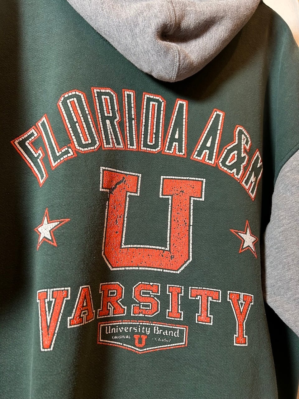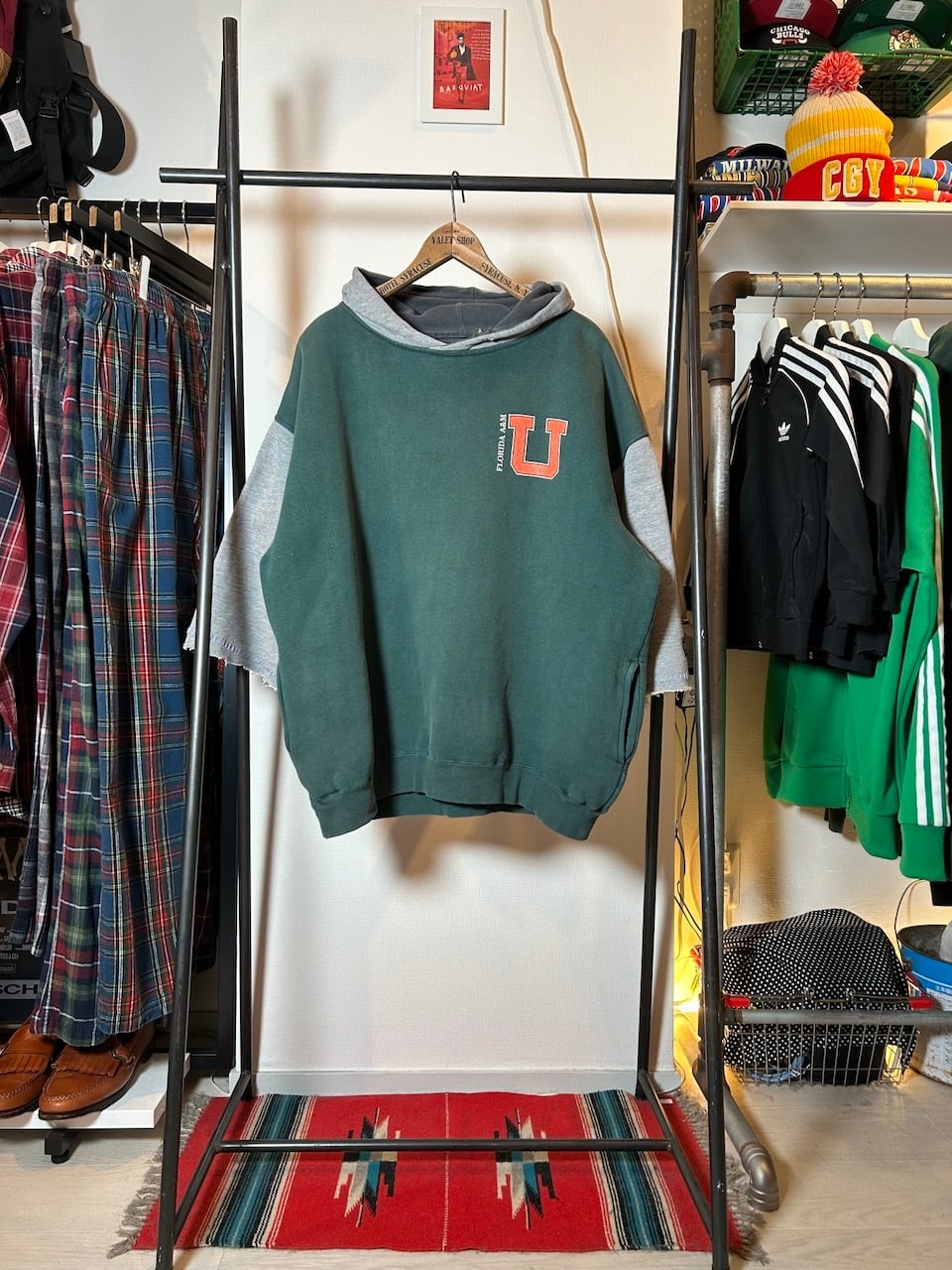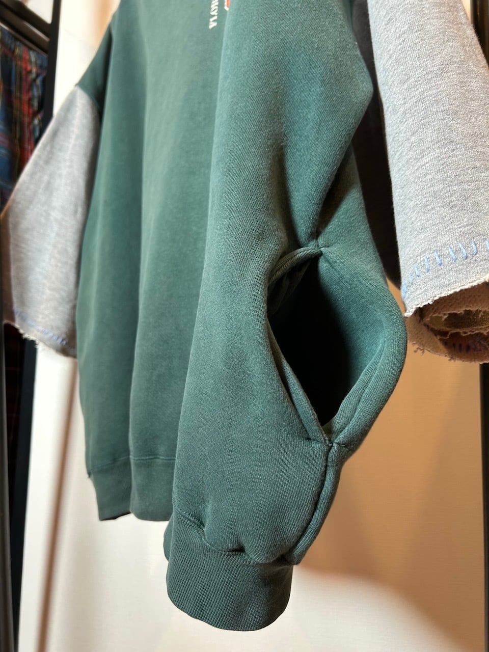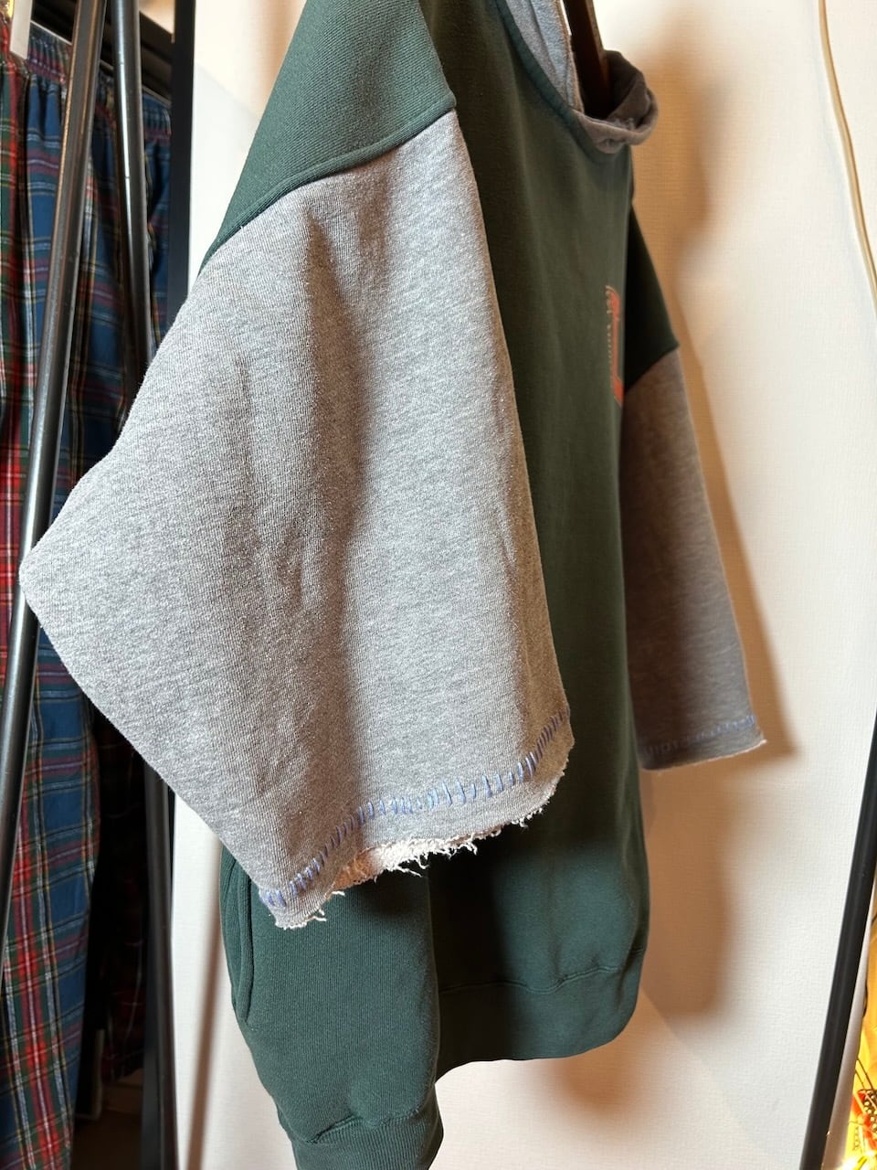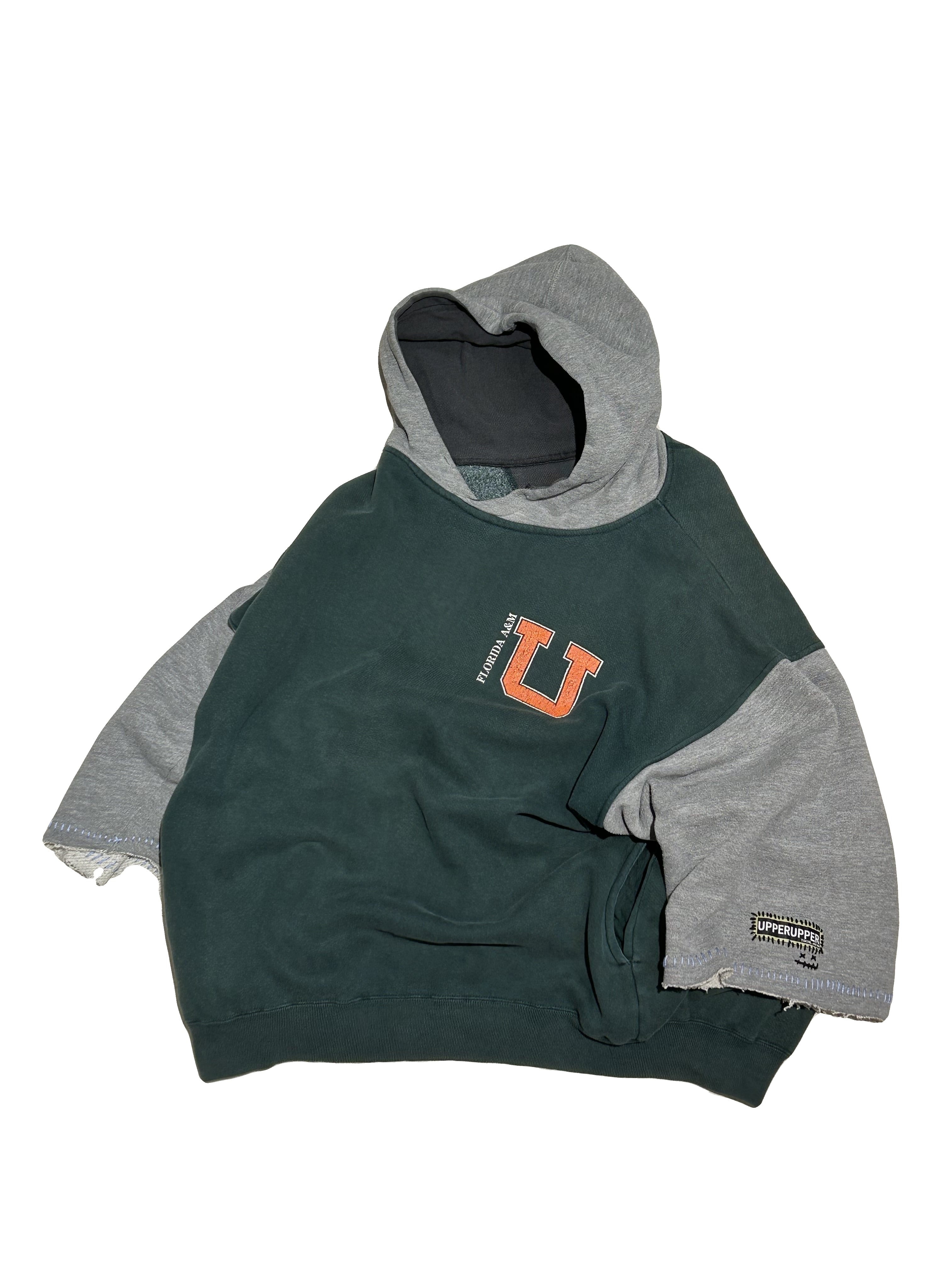 ご覧いただきありがとうございます!こちらのUPRUPR upcycle hoodie Lは、90年代製フロリダ農工大のパーカーをベースに作成した特別なアップサイクル品です。ワイドな袖を活かし、大胆にハーフ丈に切断しているため、ユニークで個性的なスタイルを実現。手縫い刺繍ステッチが袖口を飾り、洗練された印象を与えています。肩幅の広さも相まって、着用すると絶妙なシルエットが生まれます!サイドポケットも嬉しい一着。