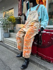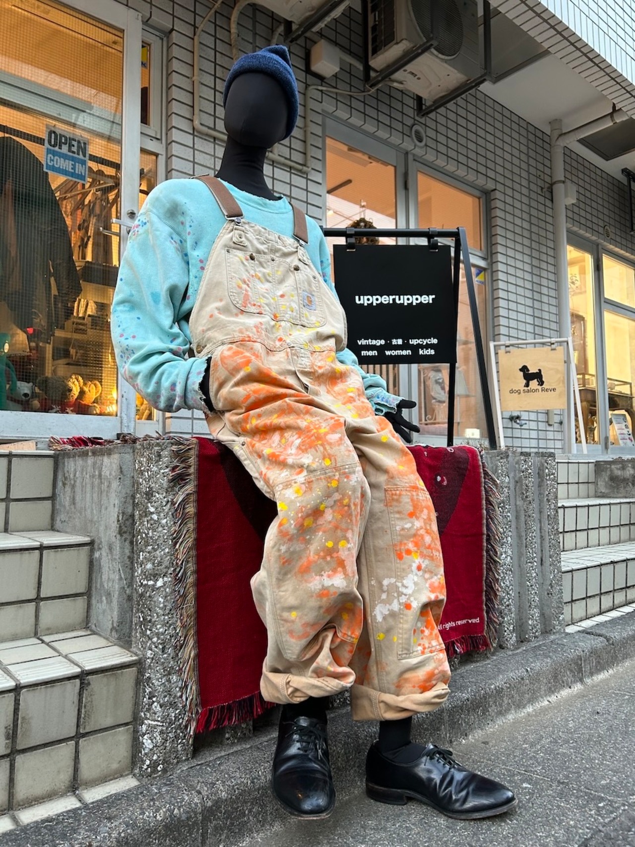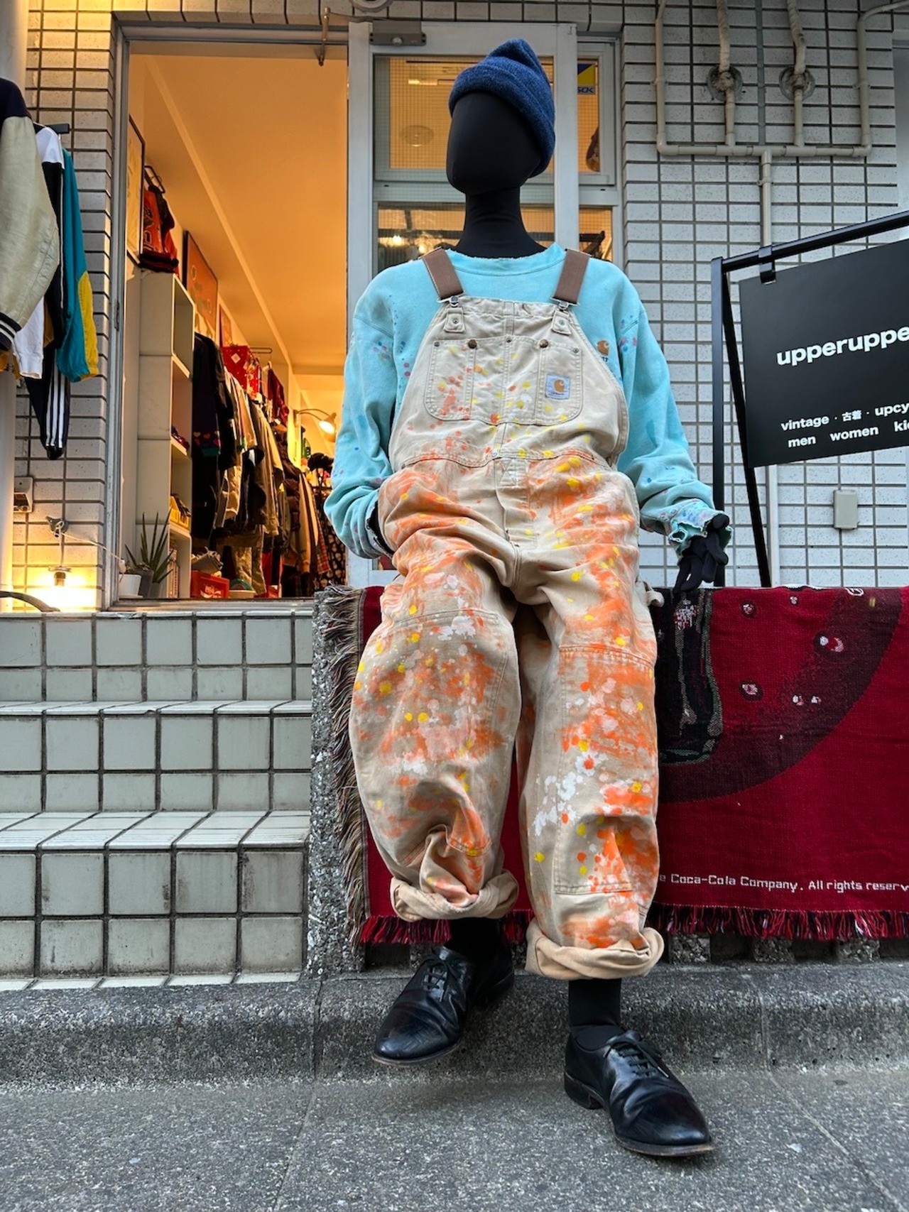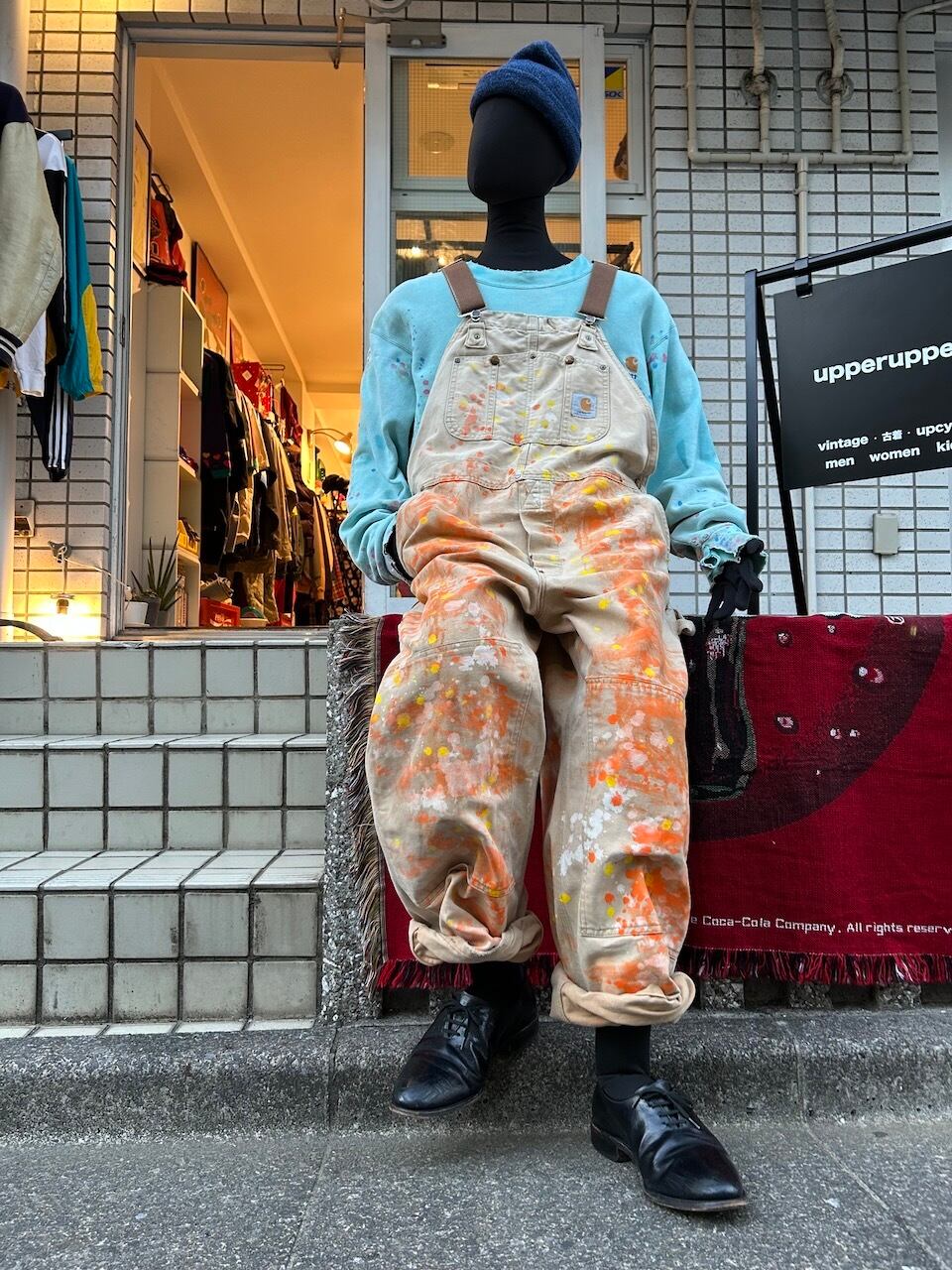ご覧いただきありがとうございます!こちらのUPRUPR upcycle overalls W39は、90年代US製Carharttのクラシックなダックオーバーオールを使用したアップサイクル品です。元々の色落ちと古びた雰囲気を活かしながら、ペイントデザインを施しました。これを着て誰がどこでどんなサイズのどんな絵を描いたらこのオーバーオールがこうなるか、を想像しながらデザインしました。当時の労働階級の象徴でもあるアイテムにアートを融合させた一着です。