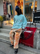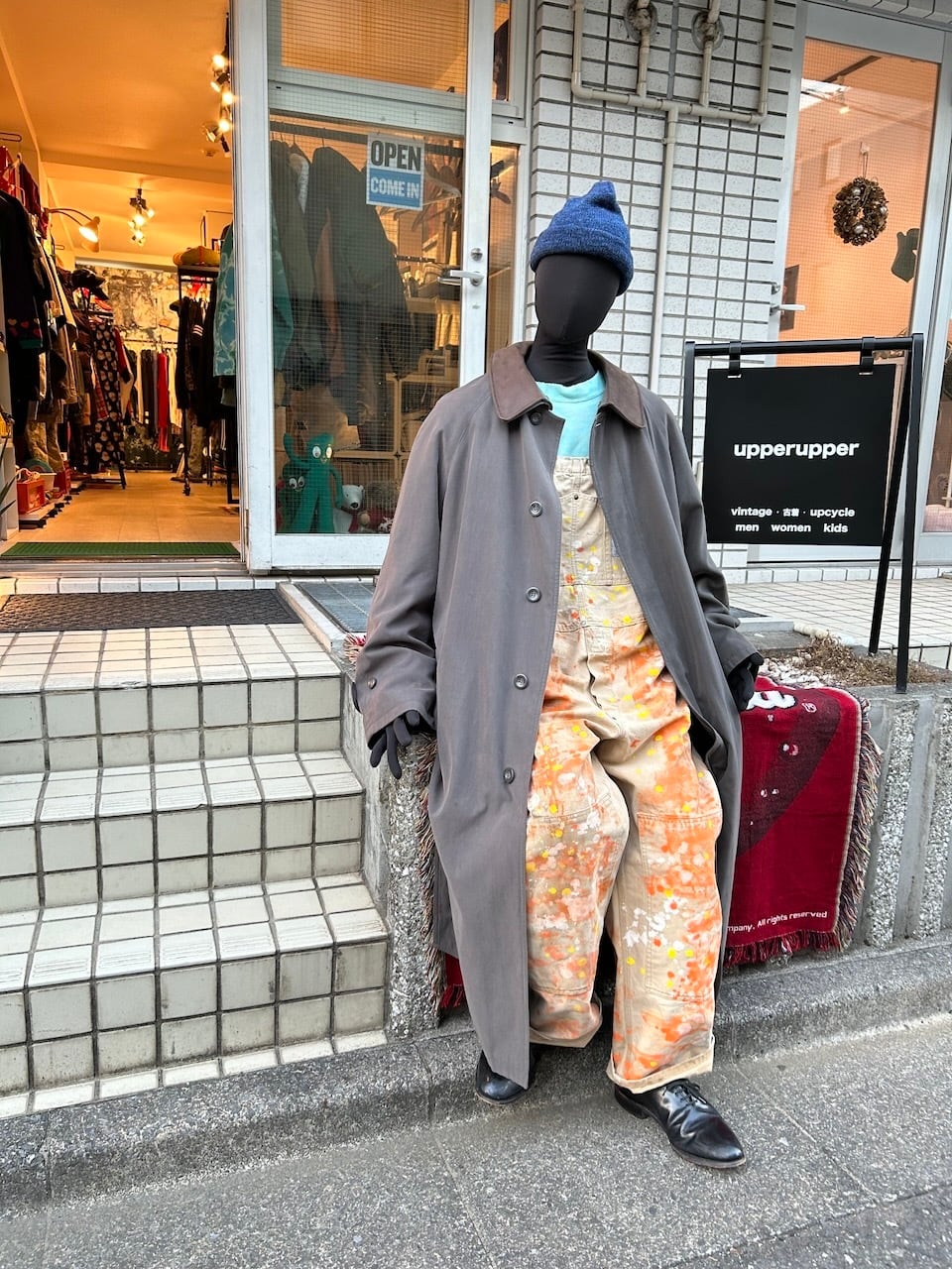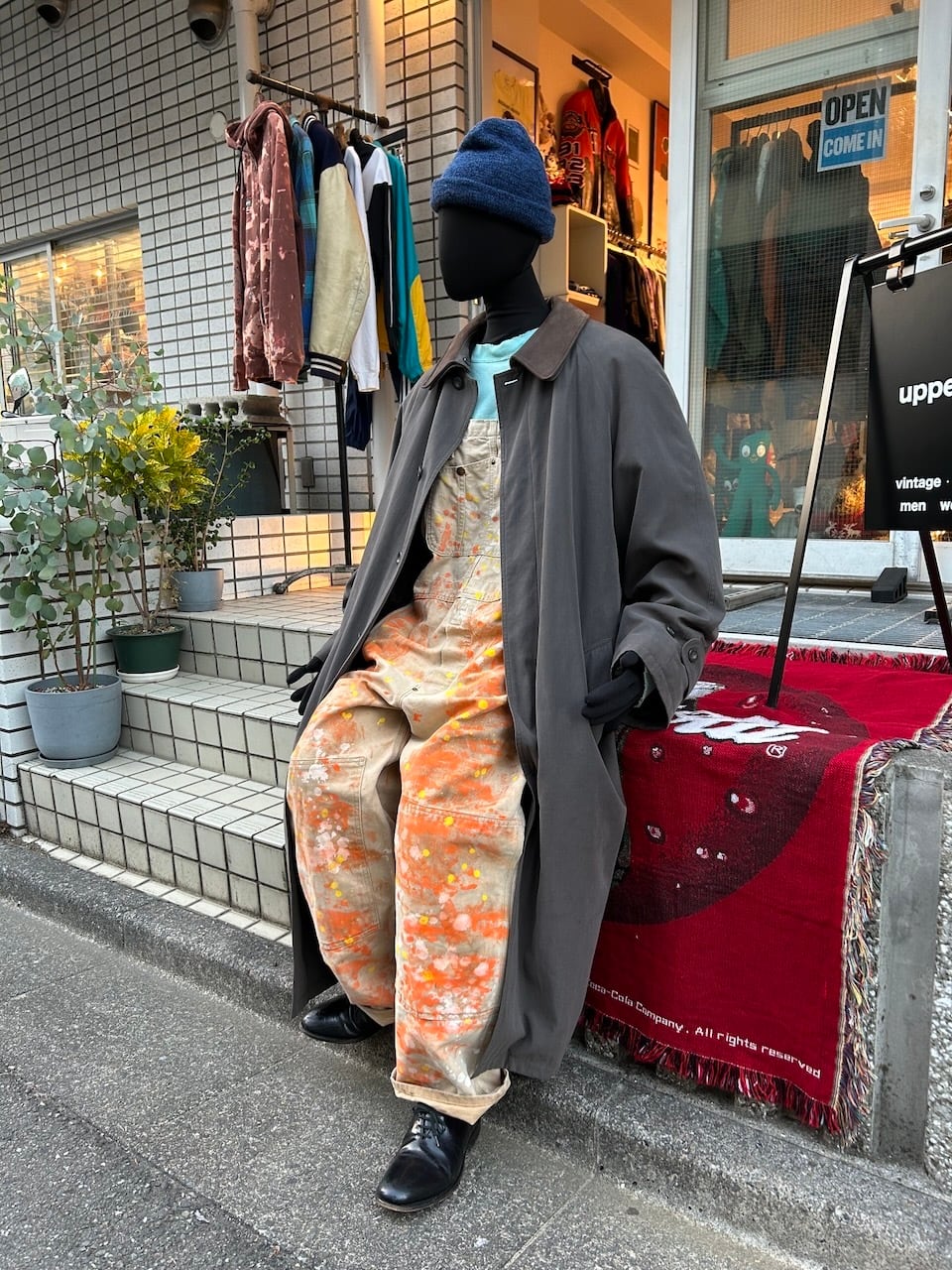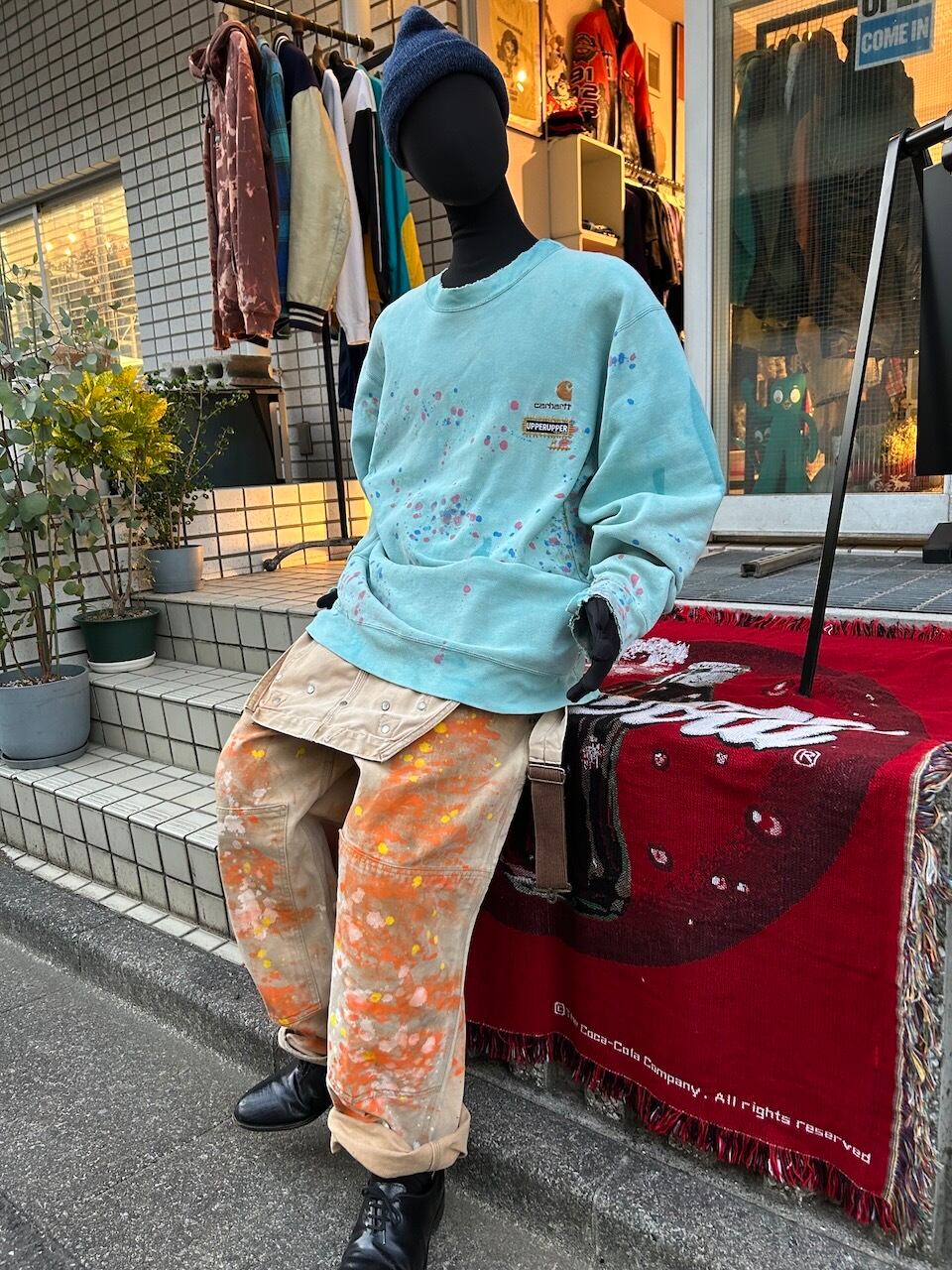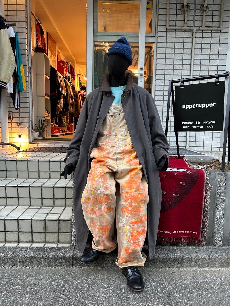 ご覧いただきありがとうございます!こちらのUPRUPR upcycle overalls W39は、90年代US製Carharttのクラシックなダックオーバーオールを使用したアップサイクル品です。元々の色落ちと古びた雰囲気を活かしながら、ペイントデザインを施しました。これを着て誰がどこでどんなサイズのどんな絵を描いたらこのオーバーオールがこうなるか、を想像しながらデザインしました。当時の労働階級の象徴でもあるアイテムにアートを融合させた一着です。
