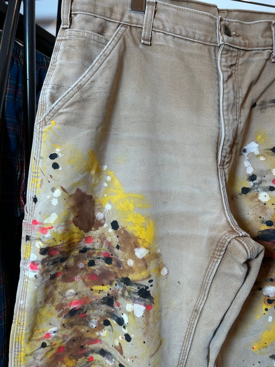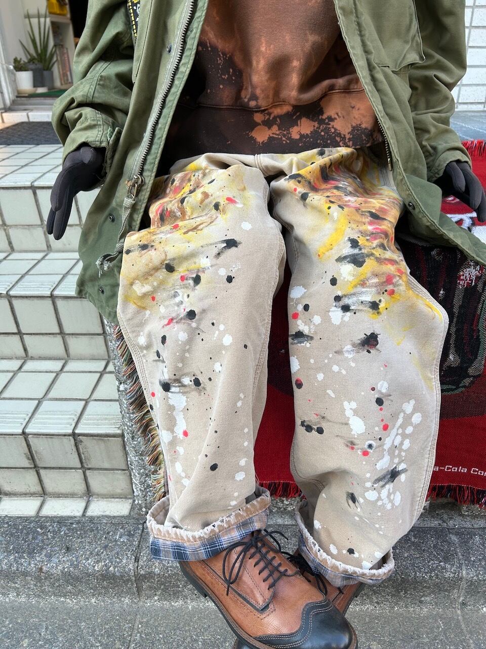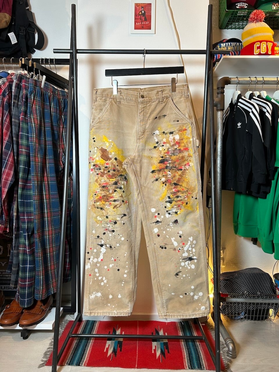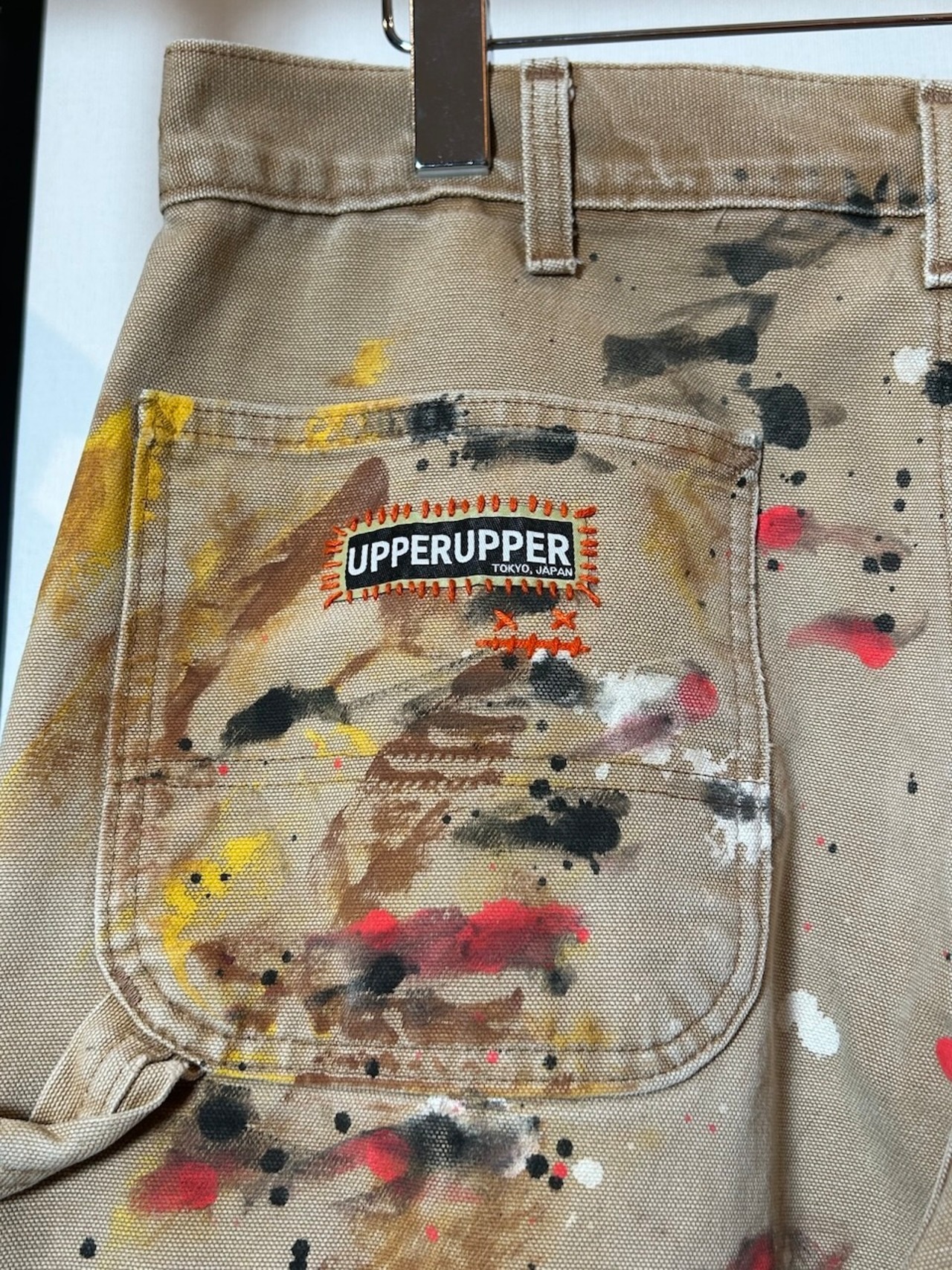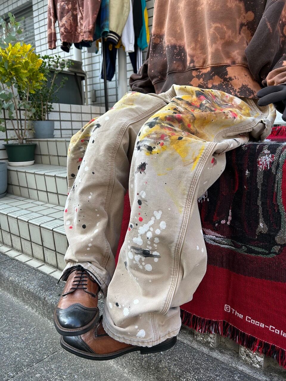 ご覧いただきありがとうございます!こちらのUPRUPR upcycle pants W34は、2008年製のCarharttネル裏地ダックパンツを使用した独自のアップサイクル品です。「冬場の倉庫で夜な夜な絵画活動に熱中する労働階級の画家」をイメージし、元々の色落ちやダメージ感を活かしつつ、ペイントデザインを施しました。仕事とアートにまみれたライフスタイルを表現した一着です。