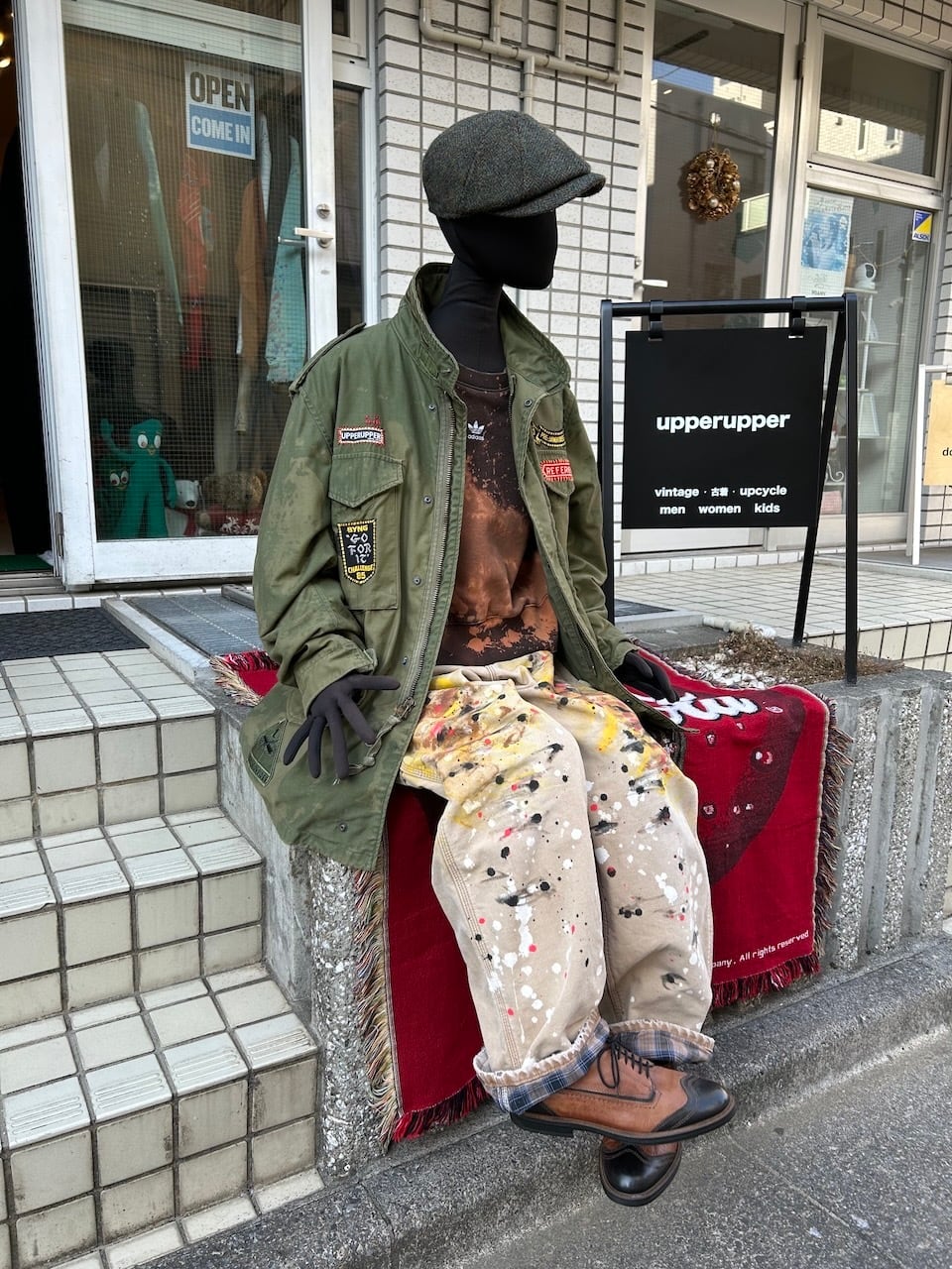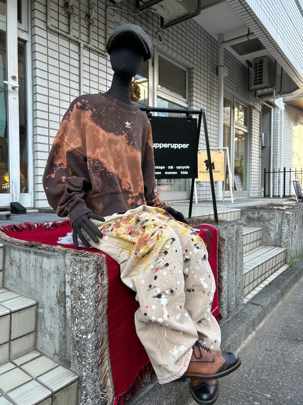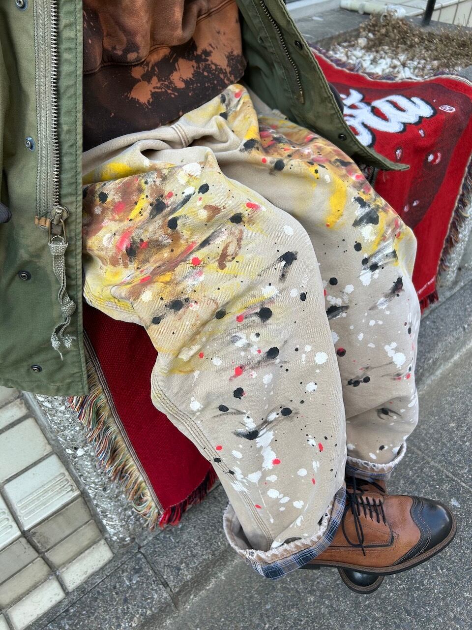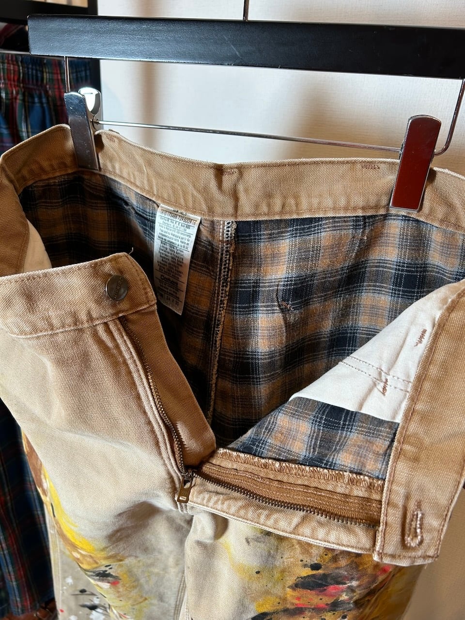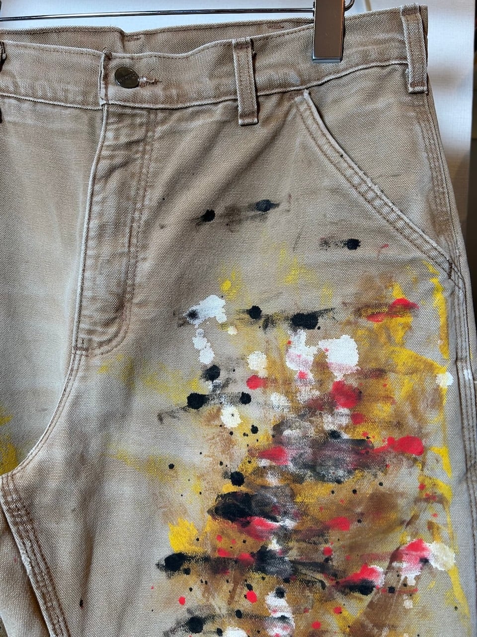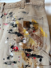 ご覧いただきありがとうございます!こちらのUPRUPR upcycle pants W34は、2008年製のCarharttネル裏地ダックパンツを使用した独自のアップサイクル品です。「冬場の倉庫で夜な夜な絵画活動に熱中する労働階級の画家」をイメージし、元々の色落ちやダメージ感を活かしつつ、ペイントデザインを施しました。仕事とアートにまみれたライフスタイルを表現した一着です。