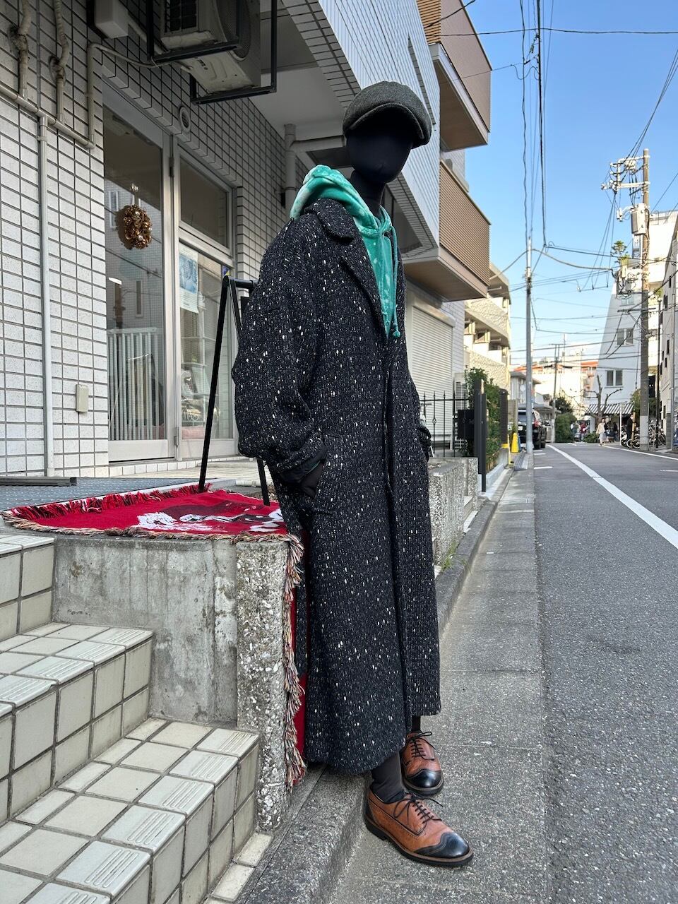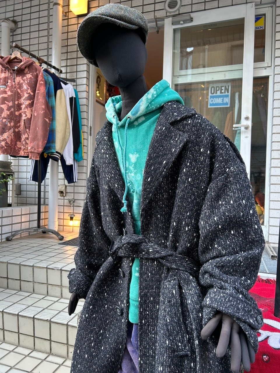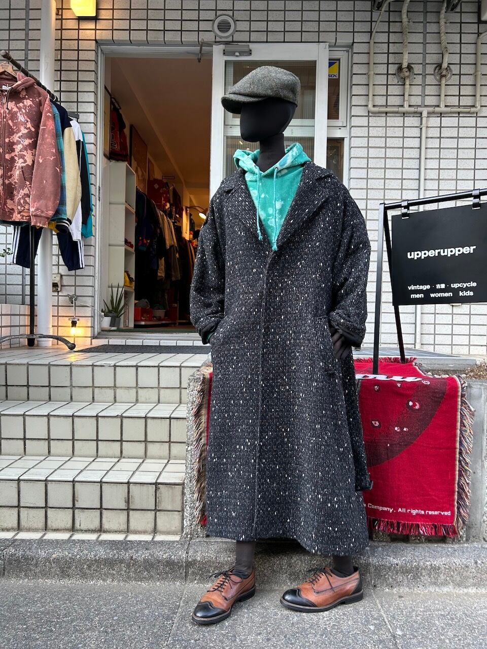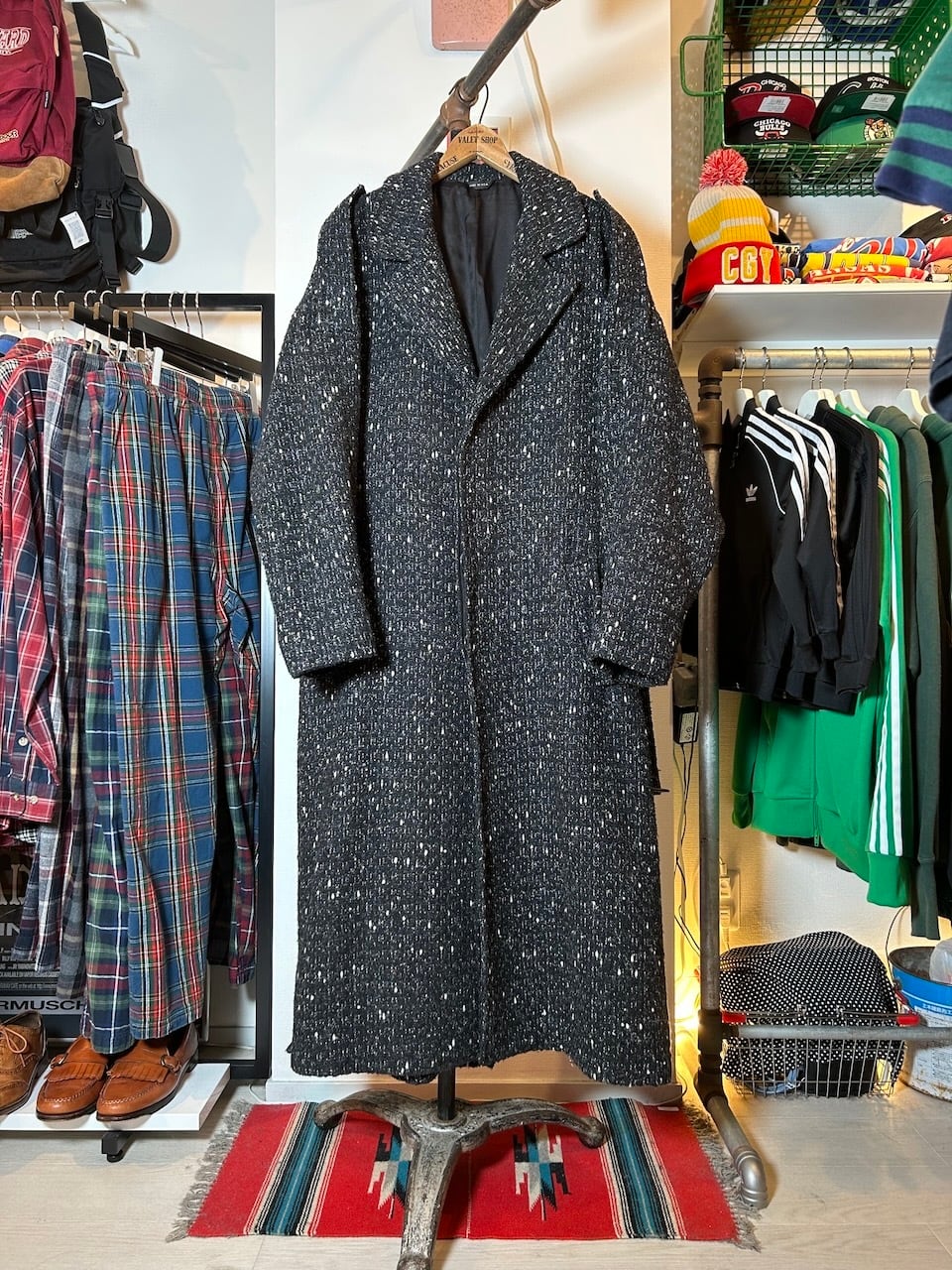 ご覧いただきありがとうございます!こちらの80's knit coat Lは、1980年代のUS製American Maleによるウールニットコートです。肩幅広めで袖はやや短めで、肩が張らずに綺麗に落ちるシルエットと生地感のため、オーバーサイズとしても使えます。バックプリーツによる立体感と、ネップ編みのデザインがさりげない美しさを演出。パーカーやスウェパンとの相性も非常に良いです!