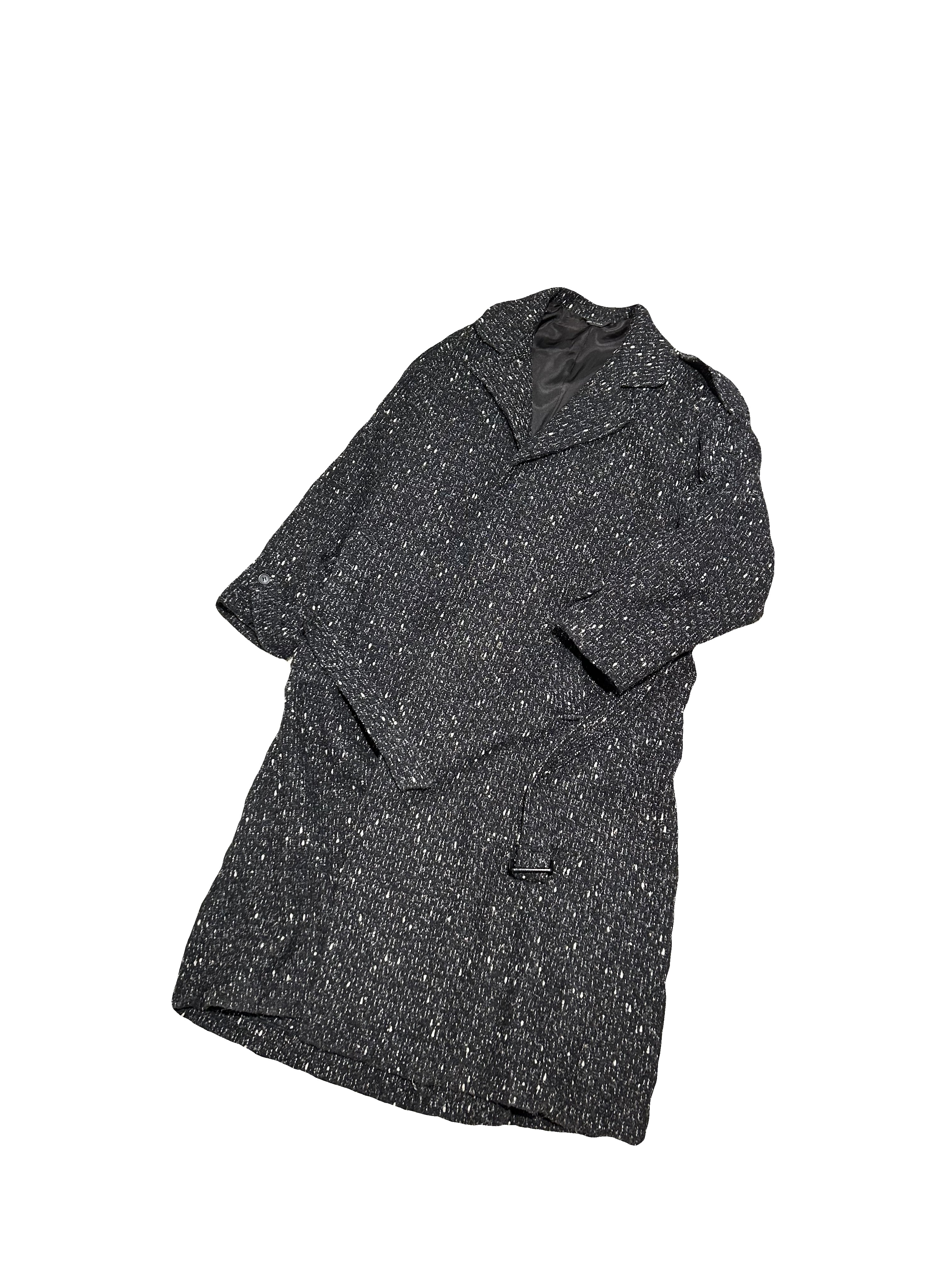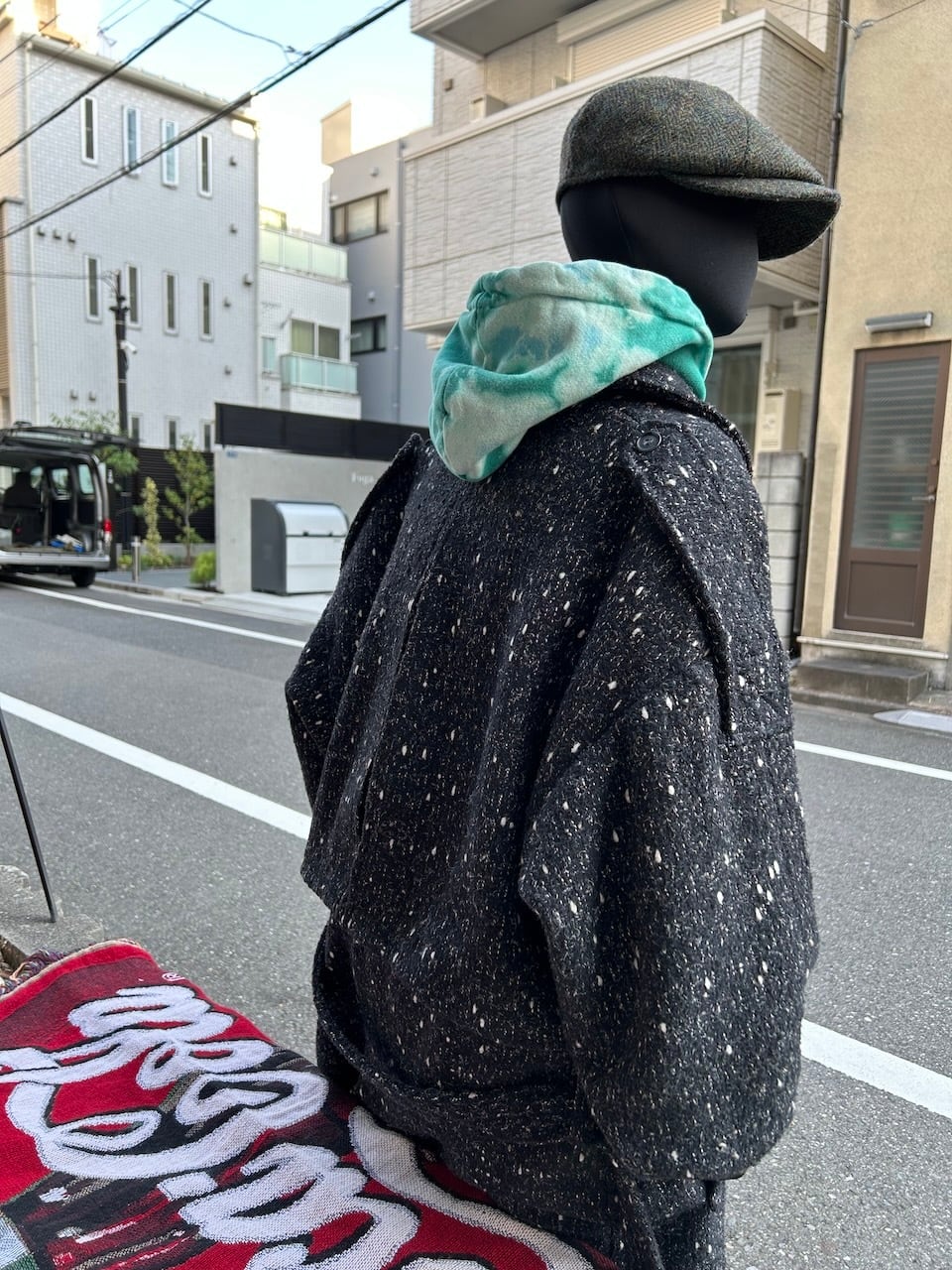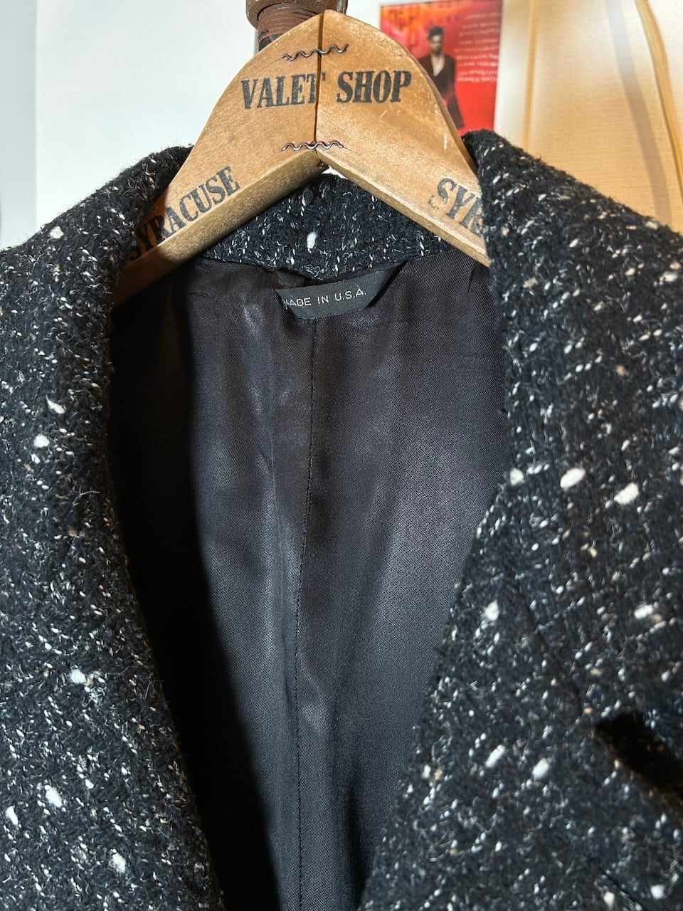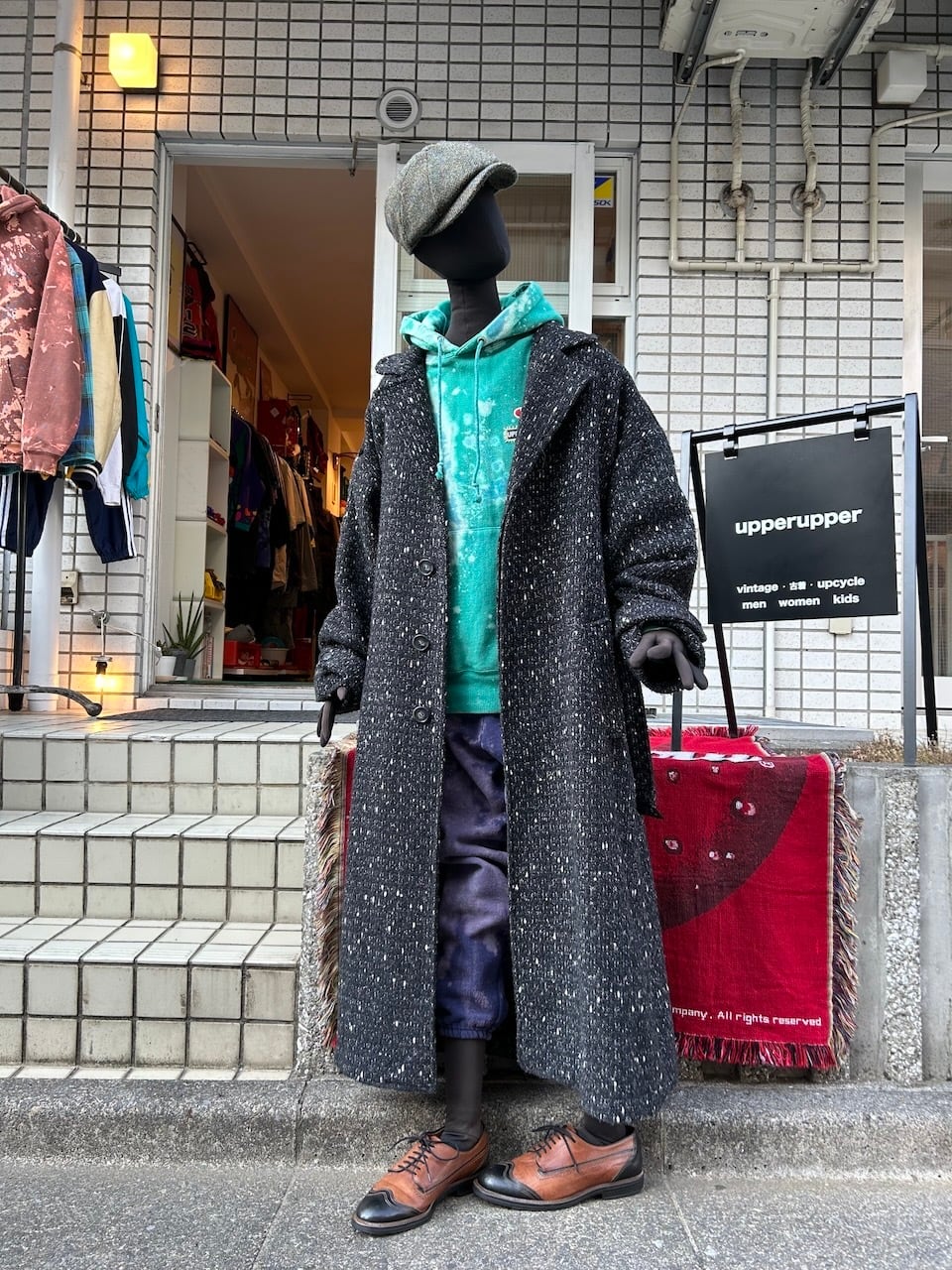 ご覧いただきありがとうございます!こちらの80's knit coat Lは、1980年代のUS製American Maleによるウールニットコートです。肩幅広めで袖はやや短めで、肩が張らずに綺麗に落ちるシルエットと生地感のため、オーバーサイズとしても使えます。バックプリーツによる立体感と、ネップ編みのデザインがさりげない美しさを演出。パーカーやスウェパンとの相性も非常に良いです!