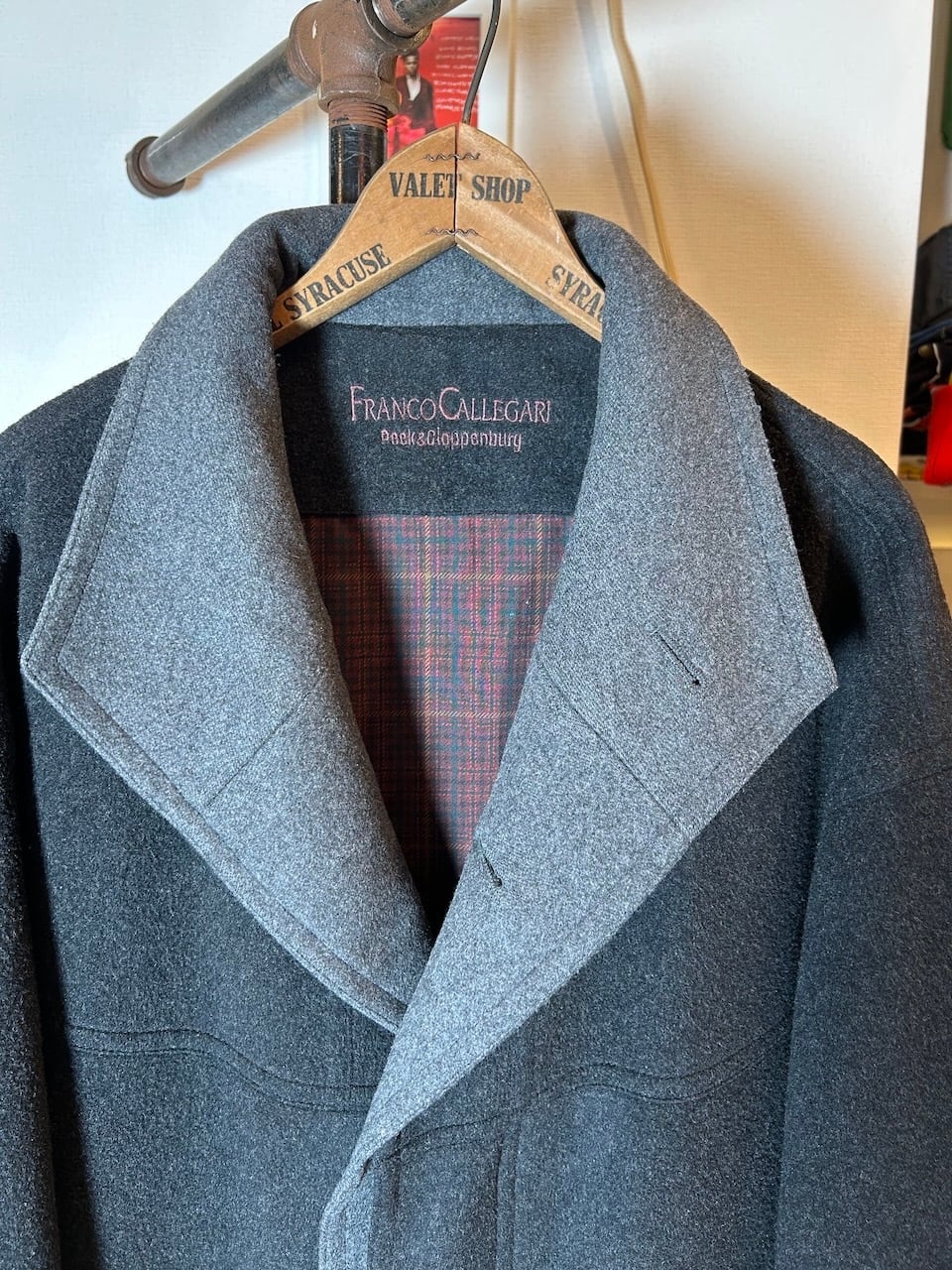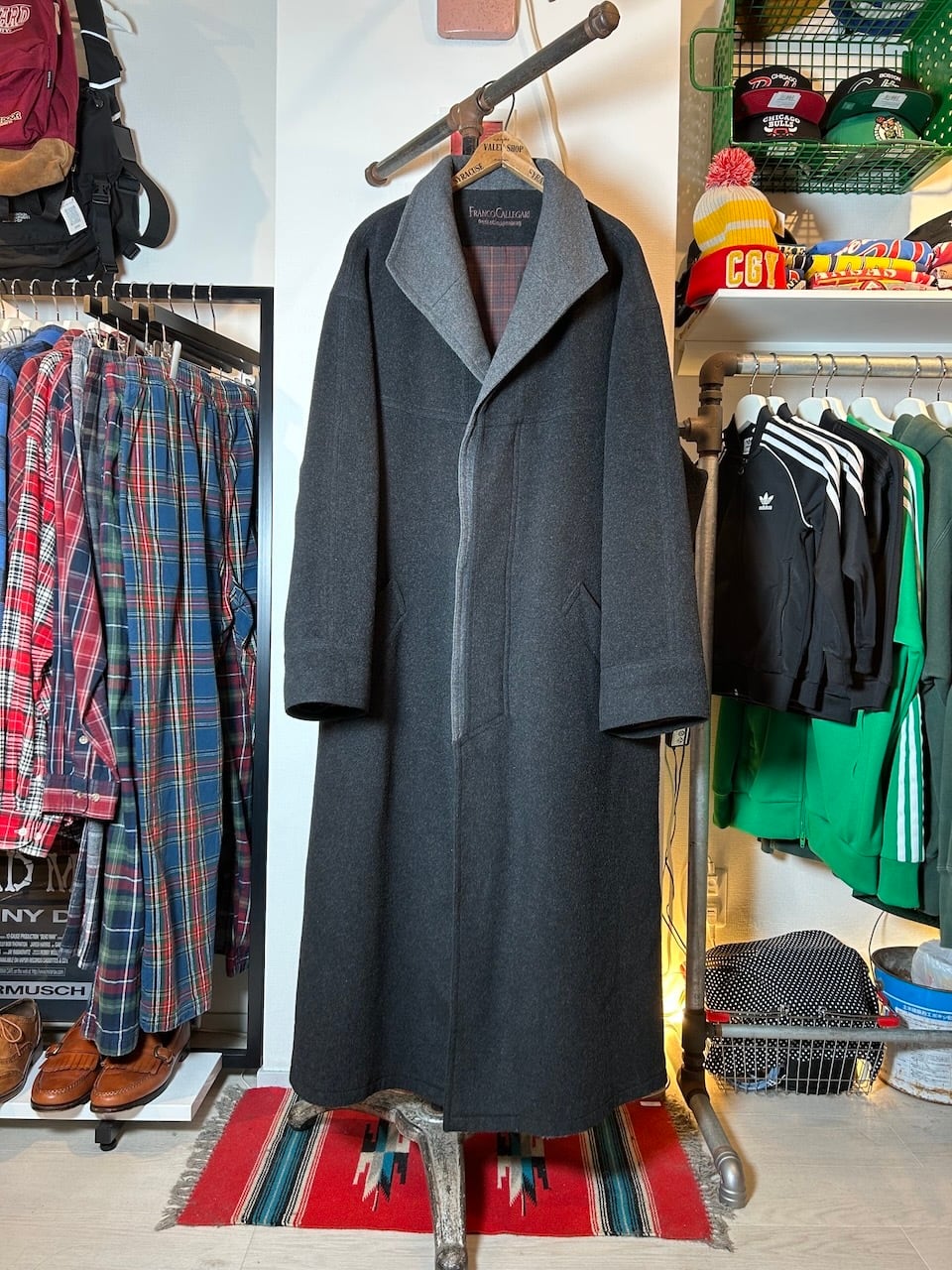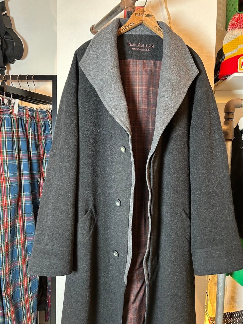 ご覧いただきありがとうございます!こちらの00's cashmere coat XLは、2000年代ドイツ製のFranco Callegariデザインによるカシミアコートです。ツートンのダブルレイヤー仕様の襟元がデザインの特徴で、広めの袖ぐりと袖幅により、ゆとりあるシルエットを実現しています。20%はカシミアを使用しており、上質な肌触りと温かさが感じられる一着です。生地感も柔らかく肩も綺麗に落ちるのでオーバーサイズでも使えます。シンプル、スタイリッシュで高品質。ミニマルなスタイルにピッタリなコートですね!
