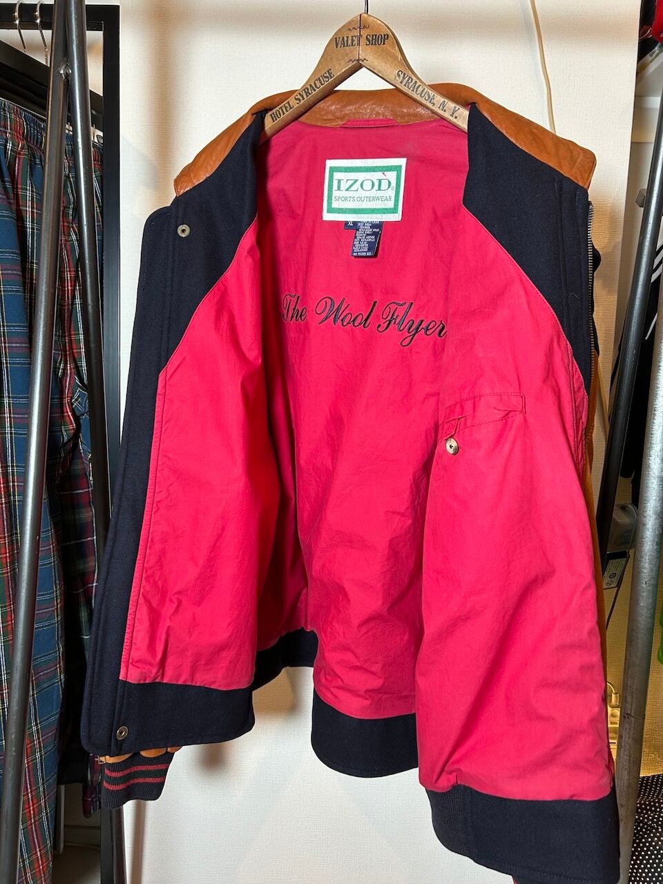 ご覧いただきありがとうございます!こちらの90's IZOD sport jacket XLは、90年代IZOD製のスタイリッシュなスポーツジャケットです。肩のプリーツ部分がツートン仕様になっていて、レーヨン入りの柔らかなメルトンウールボディはリラックスした着心地。襟と袖には立体感を加えた柔らかなラムレザーを使用しており、スポーティーな紳士の印象を与えます。裏地には鮮やかな赤地に刺繍が施されており、内側まで気を配ったデザインが特徴です。フロントジッパーには比翼も装備するなど細部にこだわりが見られます。アクティブな大人にピッタリの一着です!