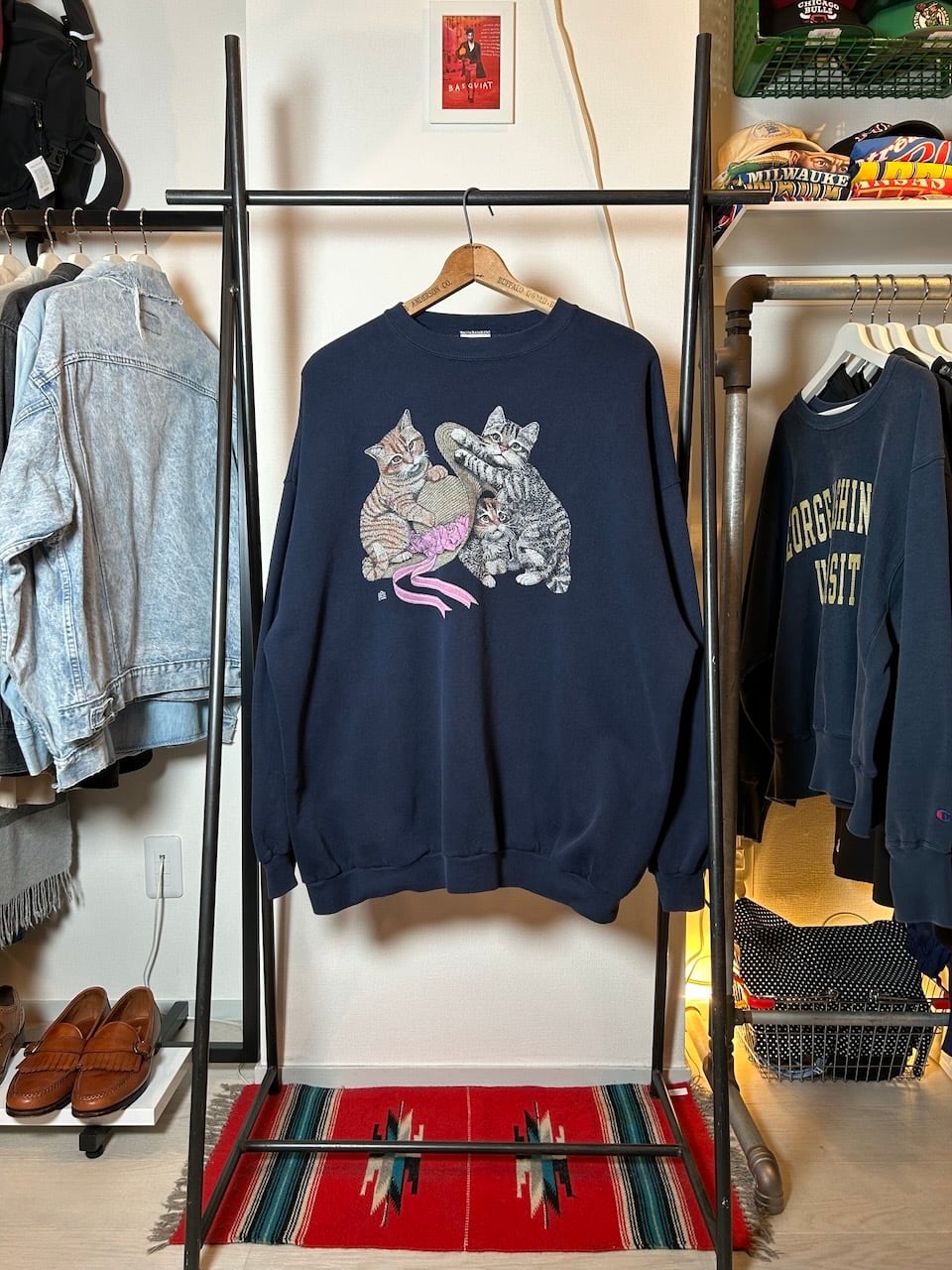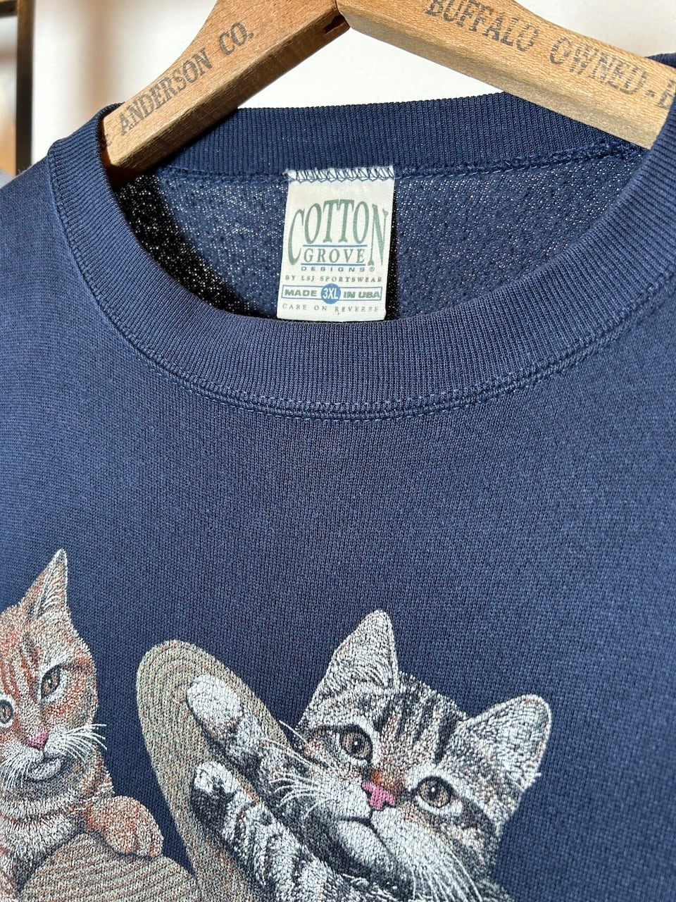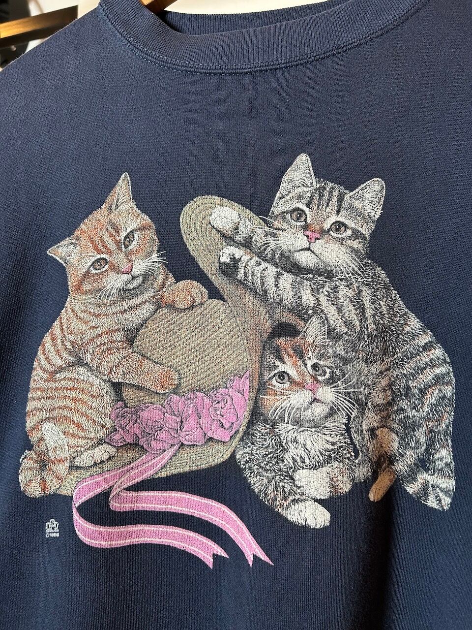 ご覧いただきありがとうございます!こちらの90's cat sweatshirt 3XLは、90年代アメリカ製のネコイラストが愛らしいスウェットです。麦わら帽子はレトロ感を感じさせ、三匹の子猫たちにはリアルな愛らしさしかありません。3XLビッグサイズのゆったりとしたシルエットで抜群のゆるさです。