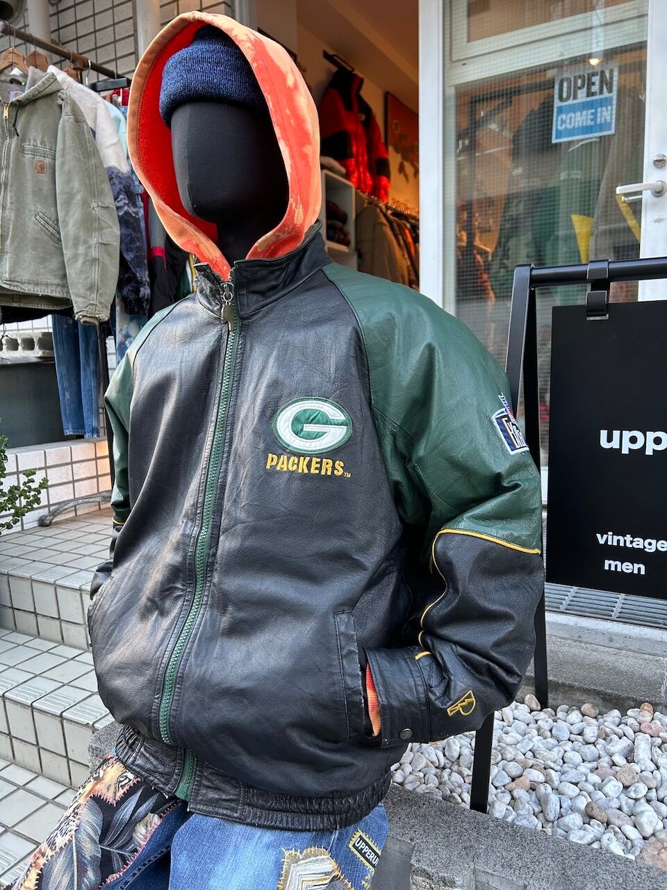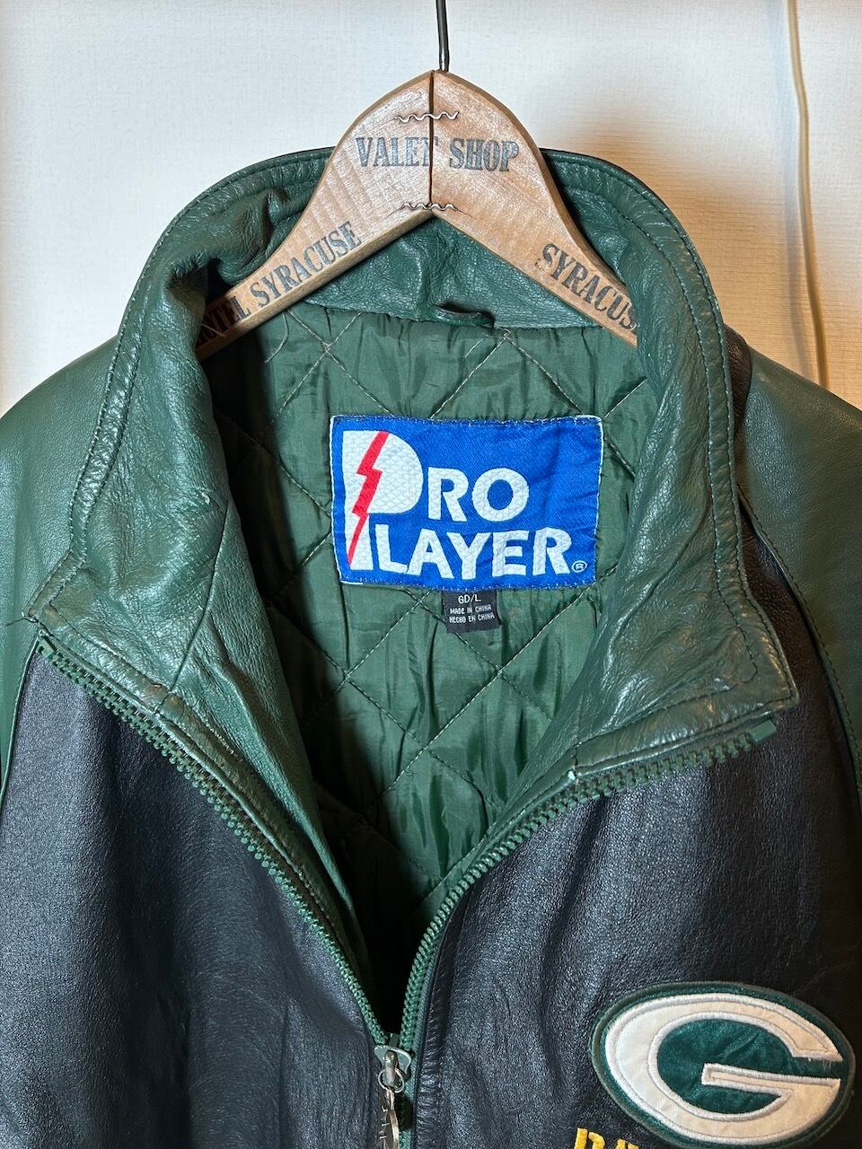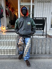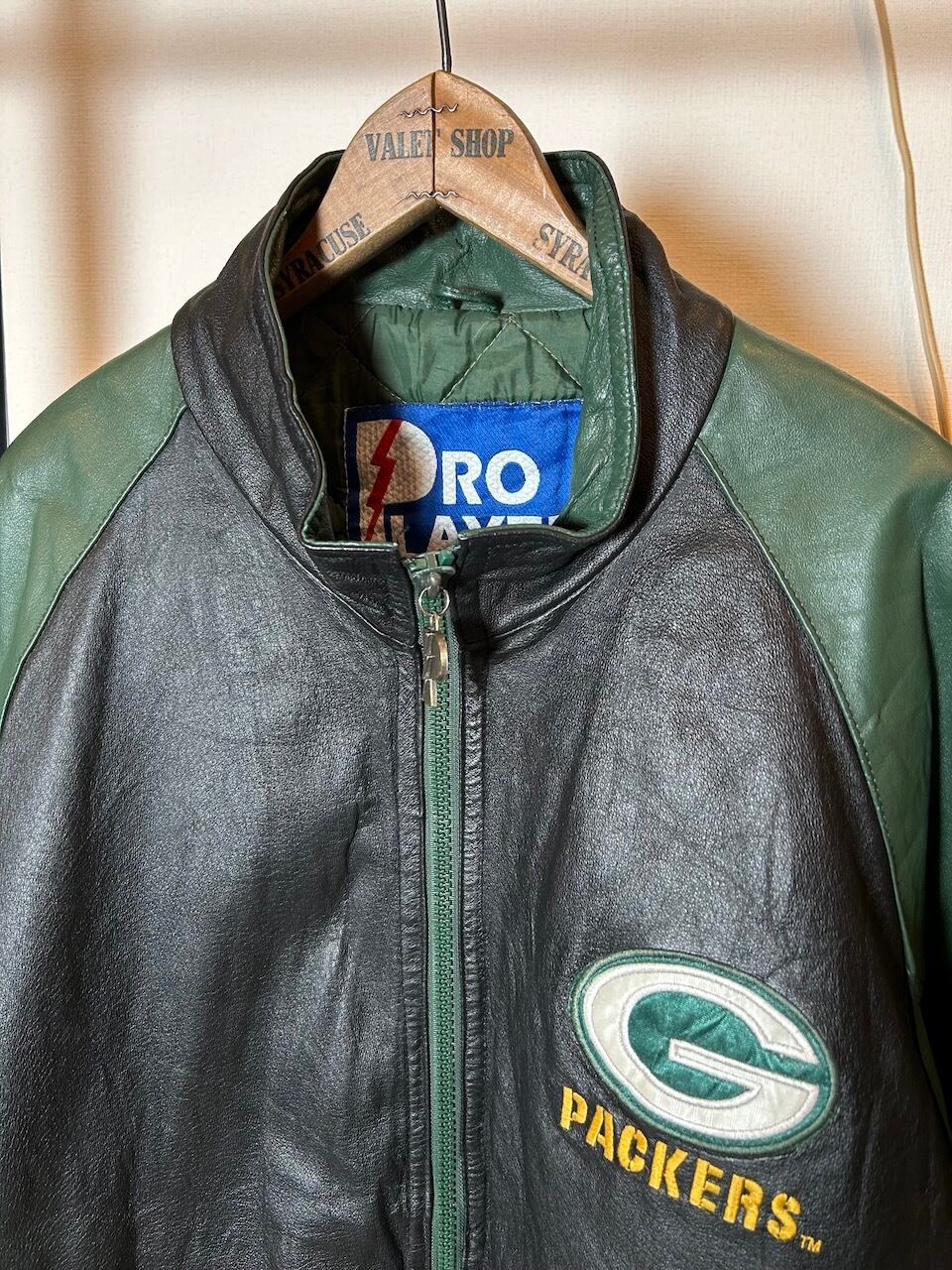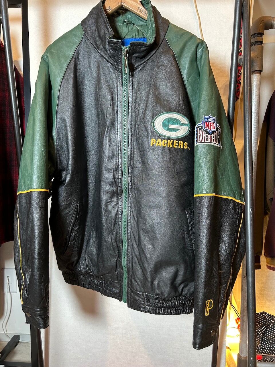 ご覧いただきありがとうございます!こちらの90's Packers leather jacket Lは、90年代のプロプレイヤー製NFLグリーンベイパッカーズレザージャケットです。しっかりとしたレザー素材に、ナイロンのキルティング裏地が施されているので保温性は高く、デザインや配色は非常に洗練されています。パッカーズのチームカラーが魅力的で、ファッション性も高いので活躍間違いなし。