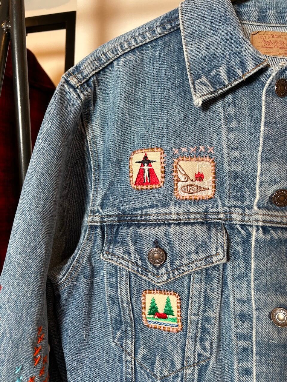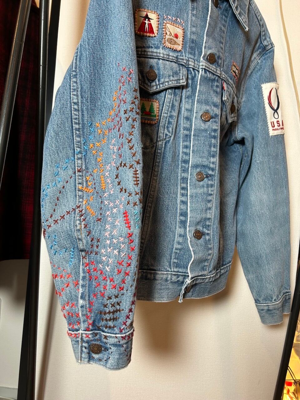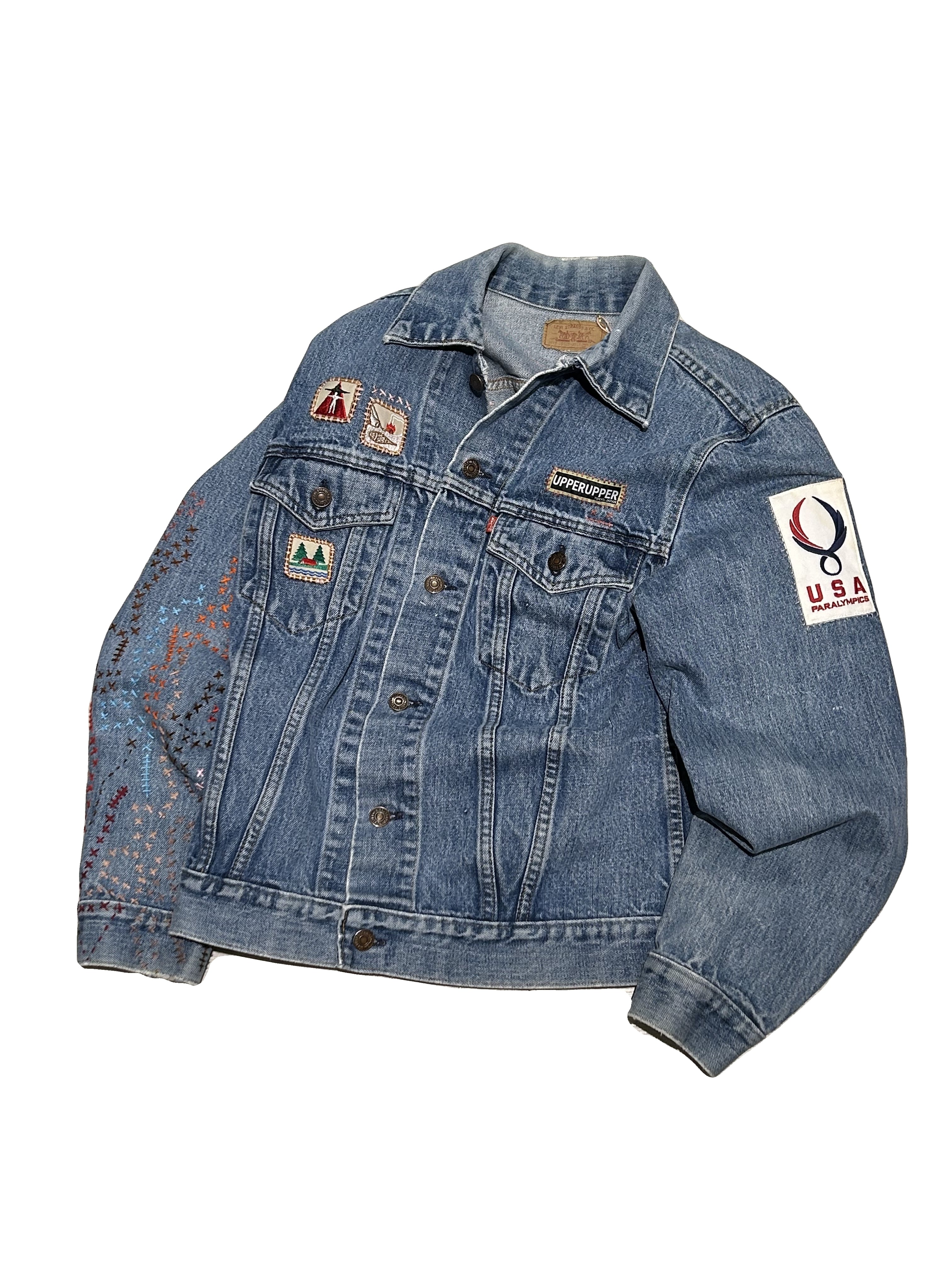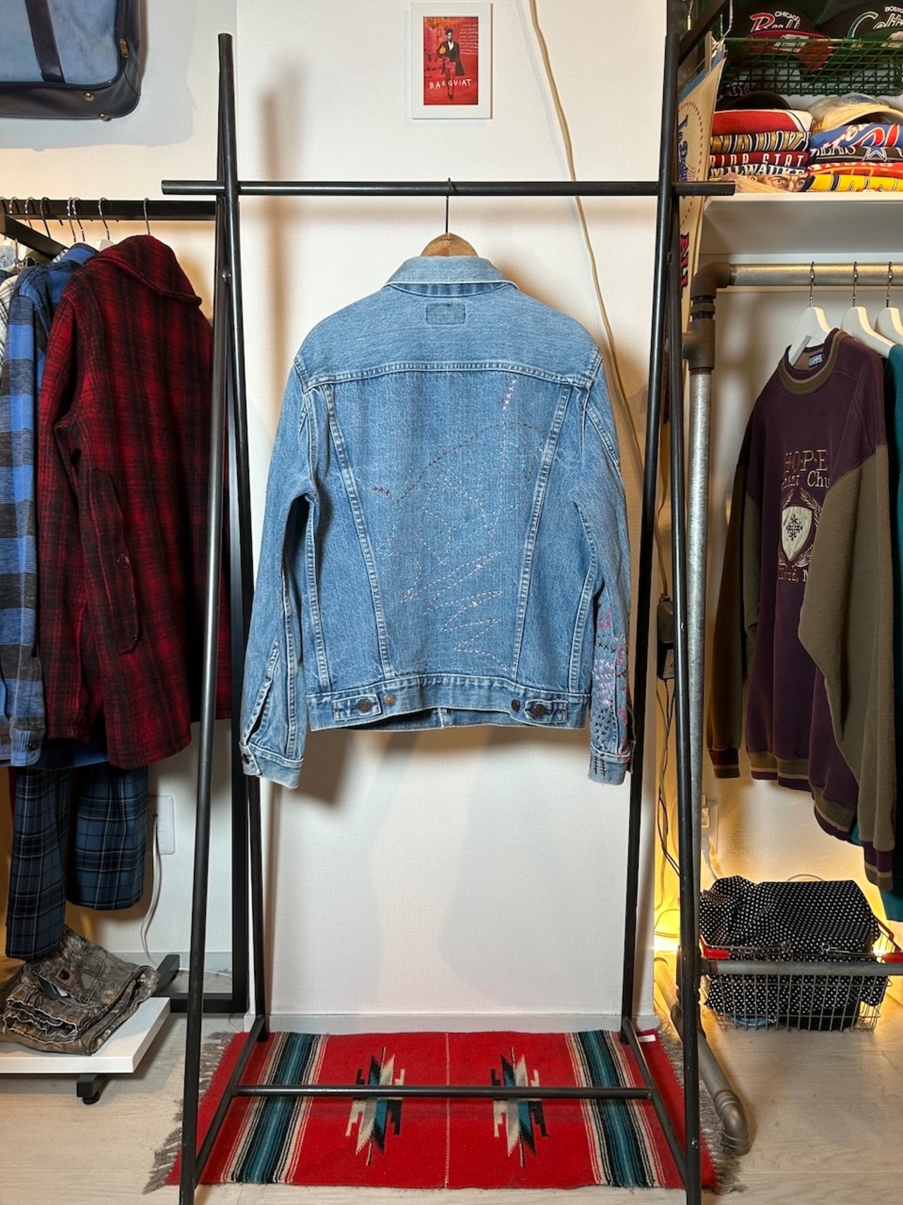 ご覧いただきありがとうございます!こちらのUPRUPR upcycle jacket Mは、80年代カナダ製のリーバイス75505デニムトラッカージャケットを使用したアップサイクル品です。程よい色落ちのライトブルーボディにピースなビンテージワッペンを複数装飾し、フリースタイル刺し子刺繍を部分的に施した、独特なアート感を演出する一品です。定番カジュアルながらも存在感を放つアイテムで、シンプルなコーディネートに華を添えます。