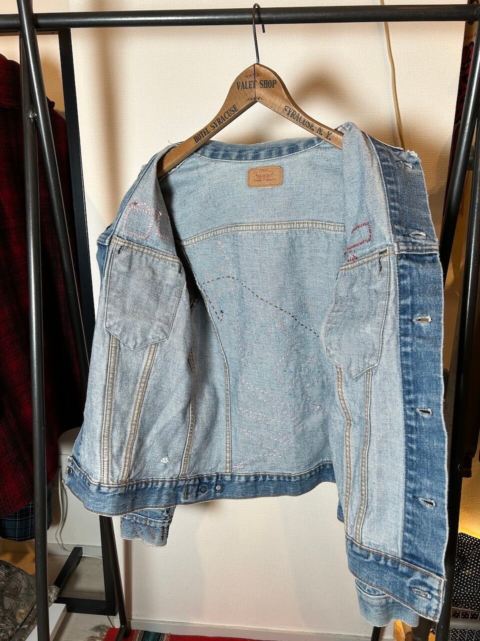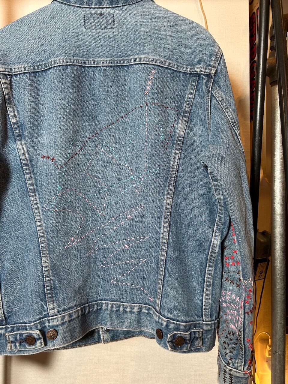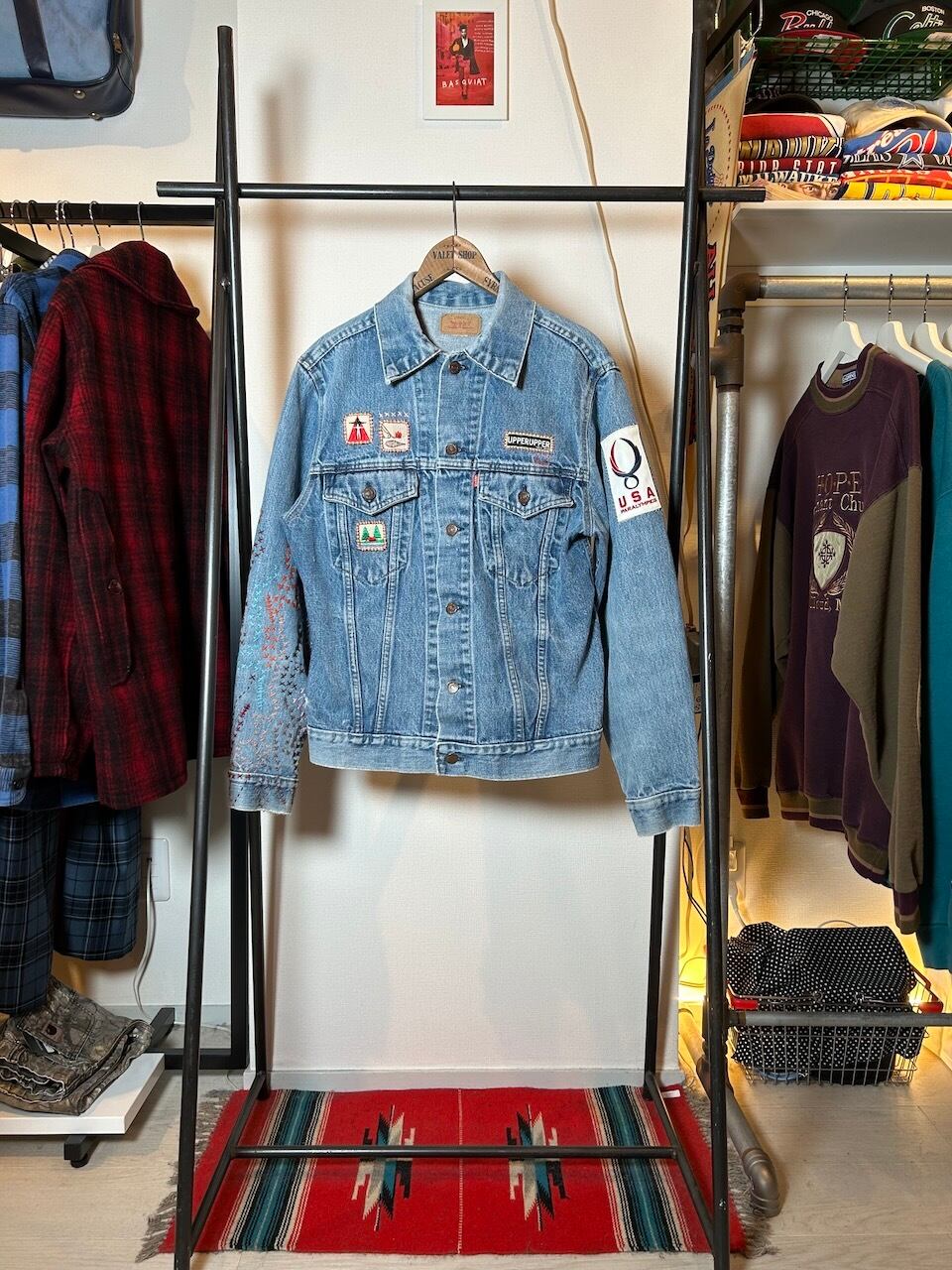 ご覧いただきありがとうございます!こちらのUPRUPR upcycle jacket Mは、80年代カナダ製のリーバイス75505デニムトラッカージャケットを使用したアップサイクル品です。程よい色落ちのライトブルーボディにピースなビンテージワッペンを複数装飾し、フリースタイル刺し子刺繍を部分的に施した、独特なアート感を演出する一品です。定番カジュアルながらも存在感を放つアイテムで、シンプルなコーディネートに華を添えます。