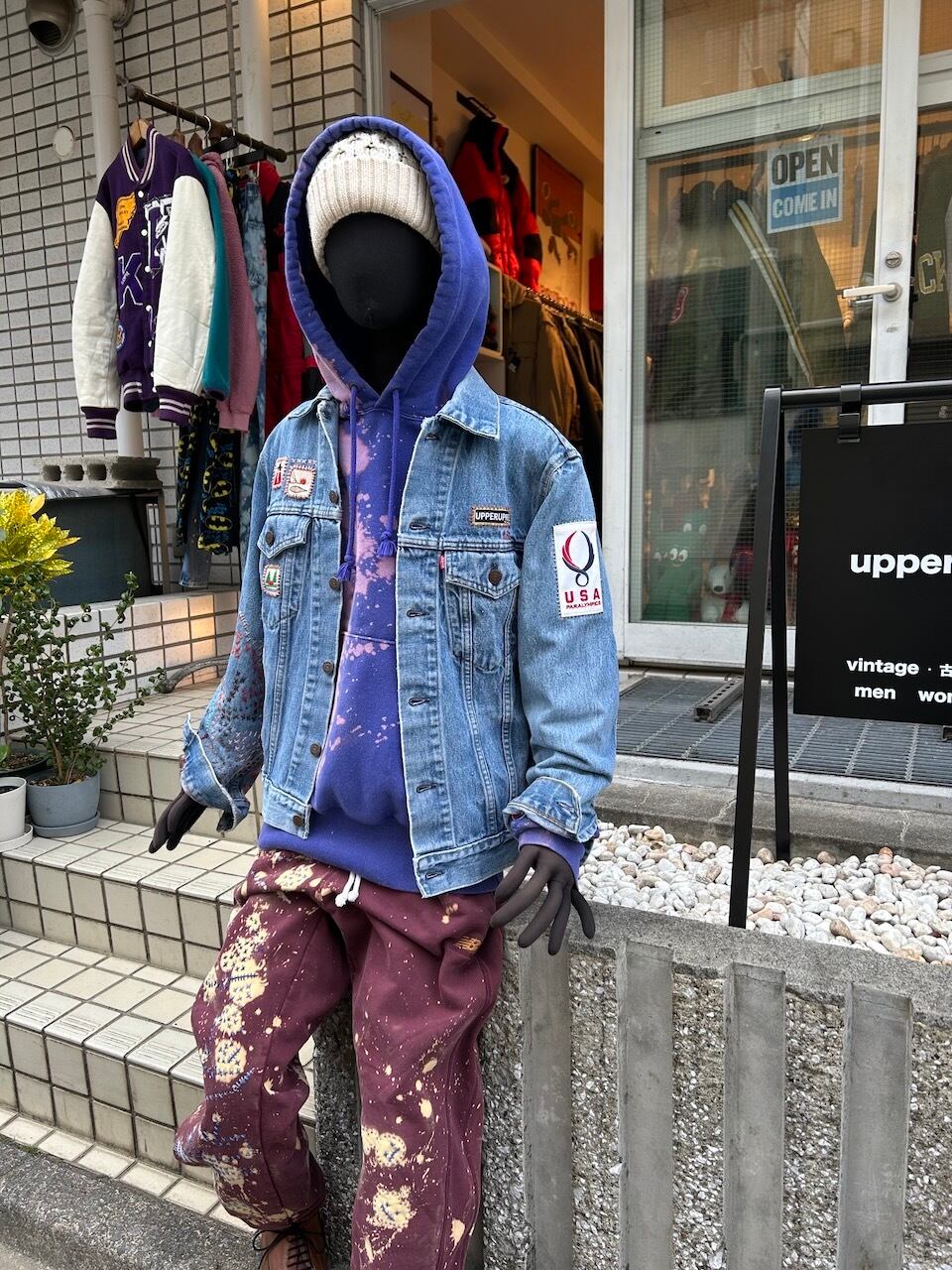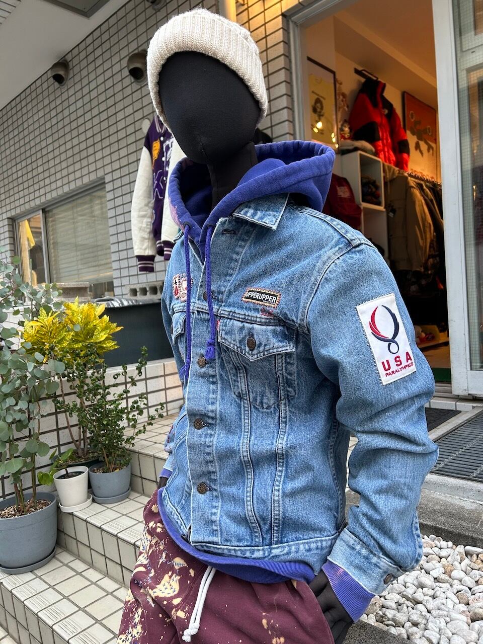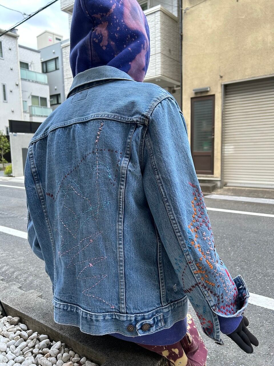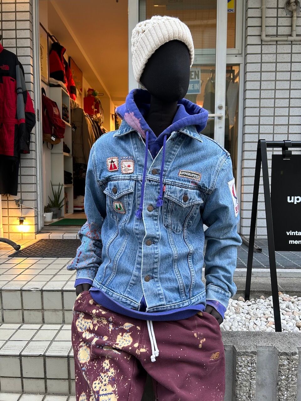 ご覧いただきありがとうございます!こちらのUPRUPR upcycle jacket Mは、80年代カナダ製のリーバイス75505デニムトラッカージャケットを使用したアップサイクル品です。程よい色落ちのライトブルーボディにピースなビンテージワッペンを複数装飾し、フリースタイル刺し子刺繍を部分的に施した、独特なアート感を演出する一品です。定番カジュアルながらも存在感を放つアイテムで、シンプルなコーディネートに華を添えます。