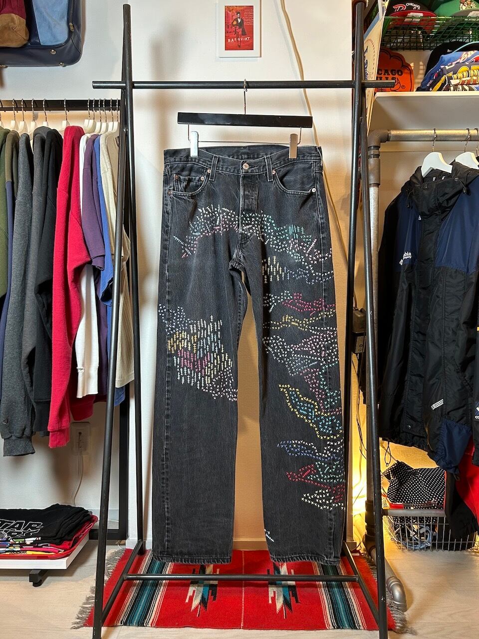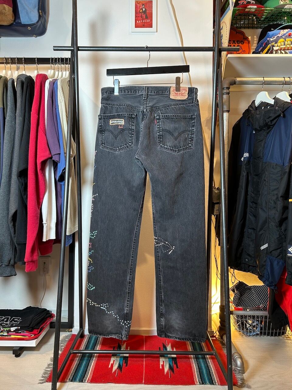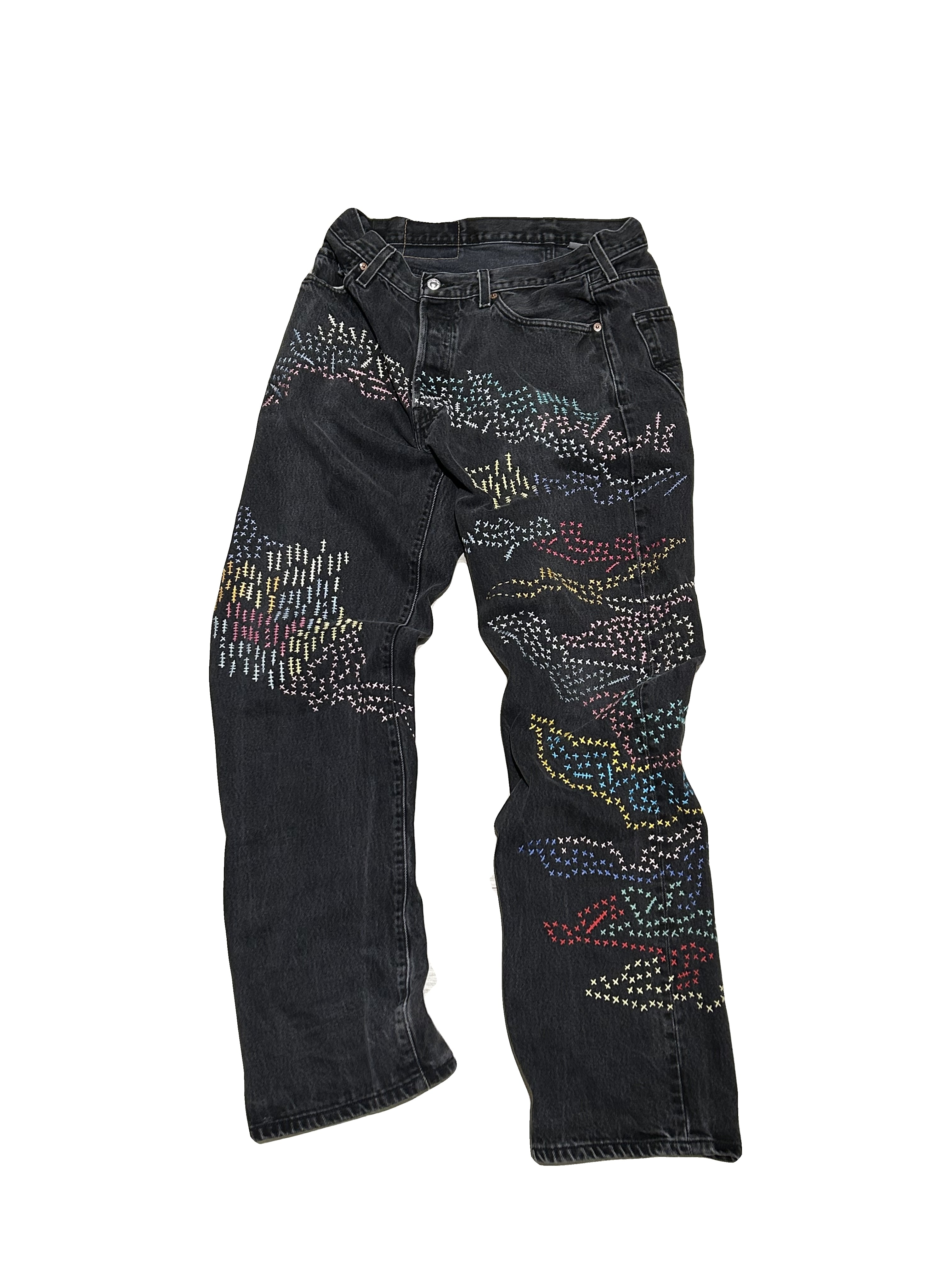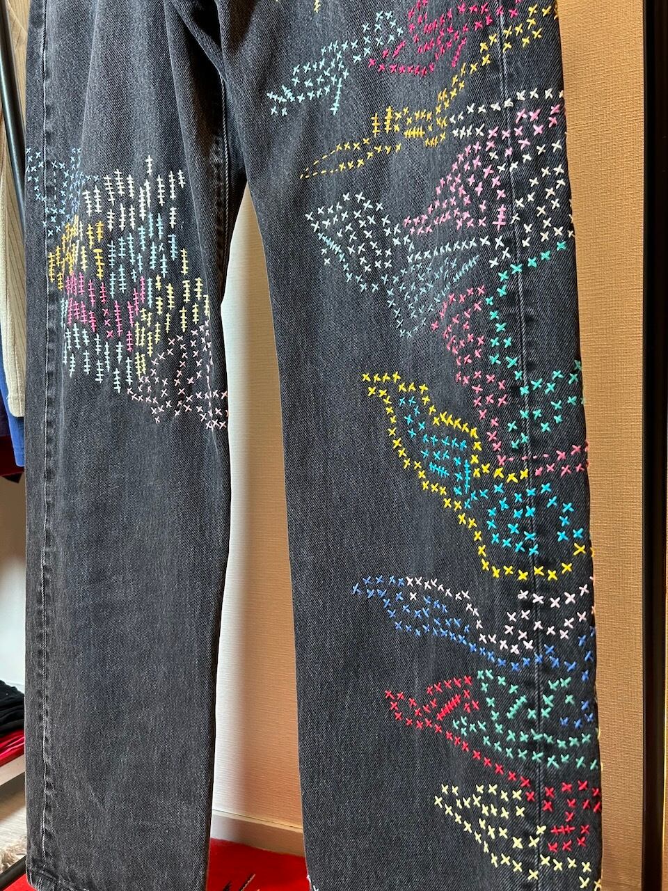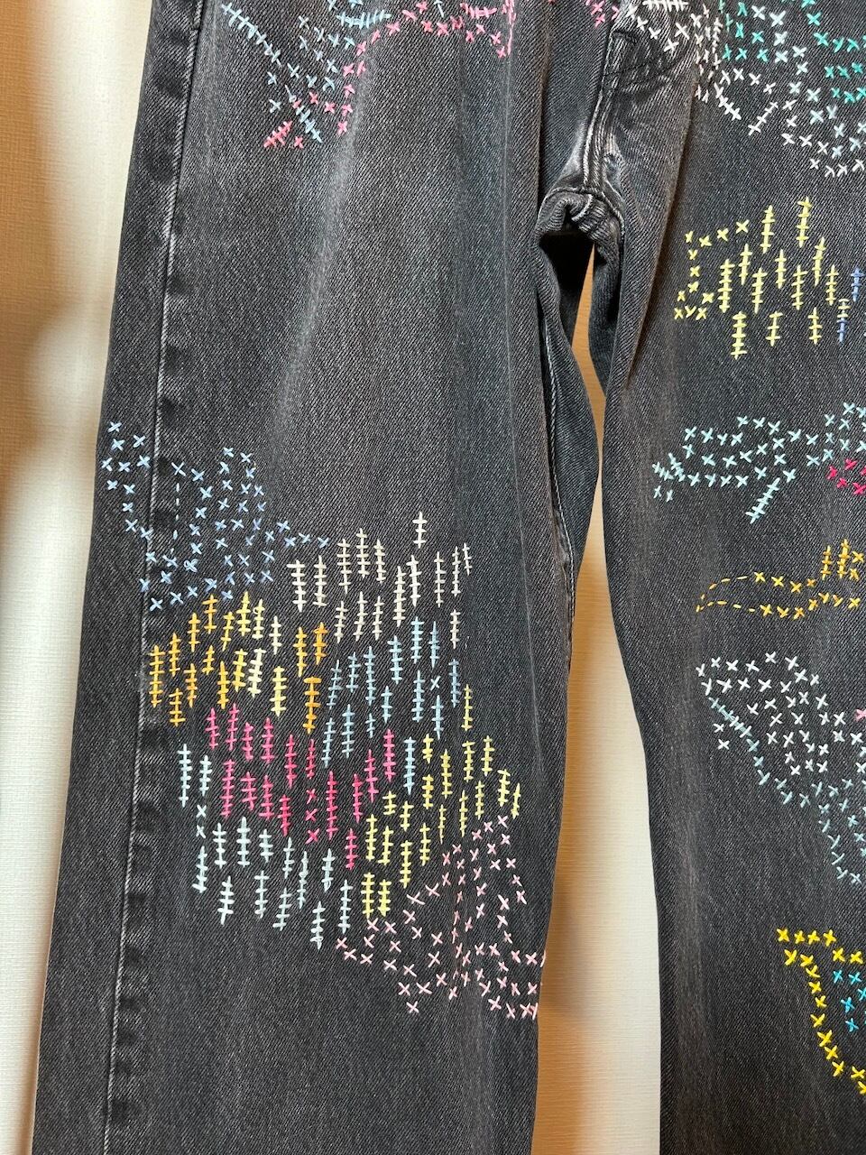 ご覧いただきありがとうございます!こちらのUPRUPR upcycle jeans W34は、2000年頃のメキシコ製リーバイス黒501を使用したアップサイクル品です。程よくフェード掛かったブラックデニムに、フリースタイル刺し子刺繍で自由にカラフルに装飾した作品です。定番的なクラシックジーンズに個性を持たせたデザインです。
