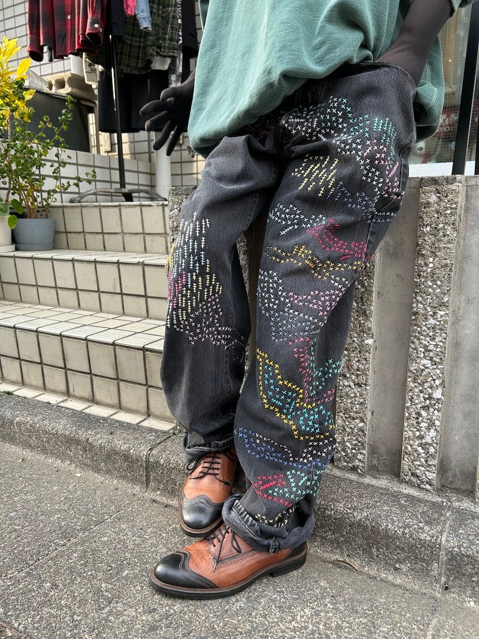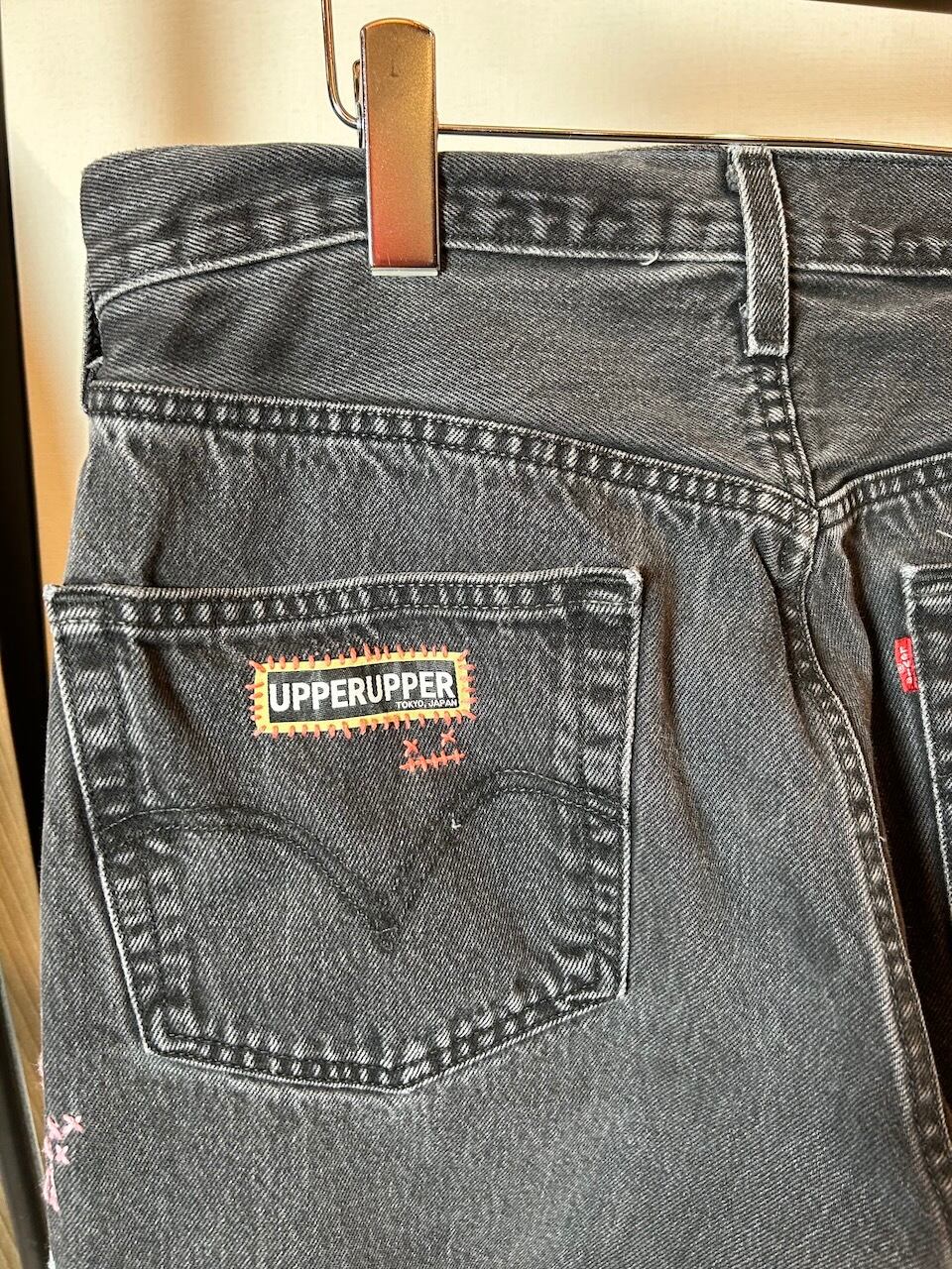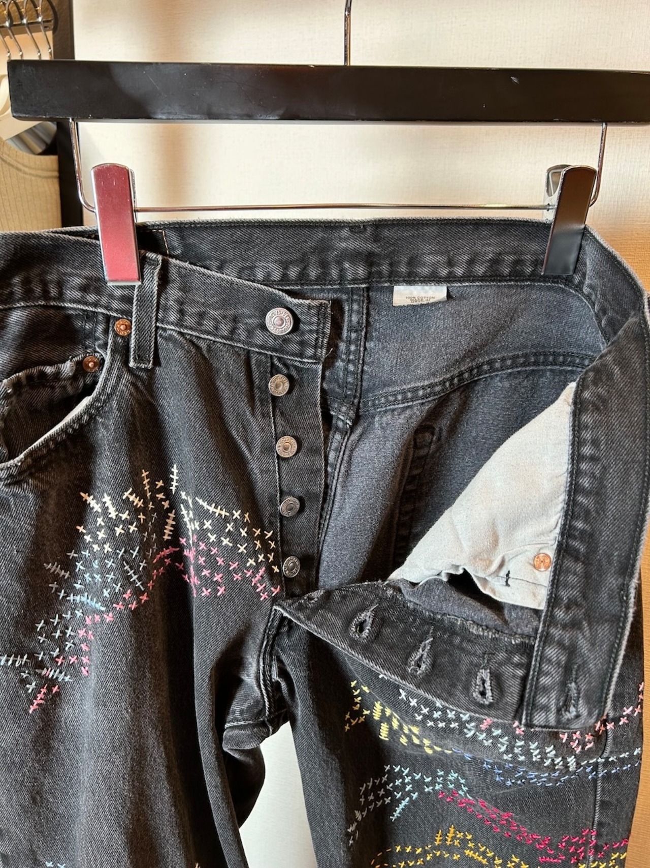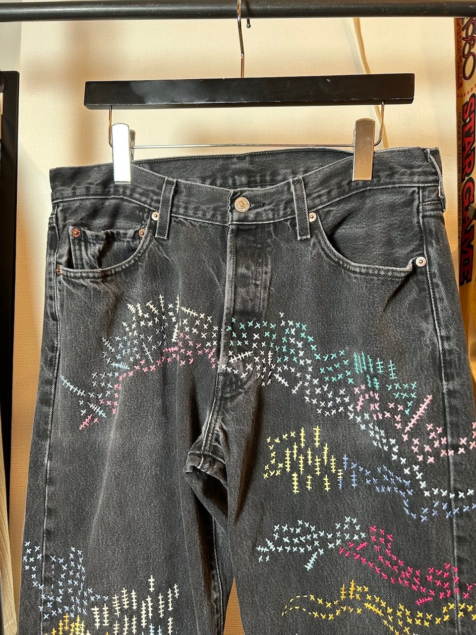 ご覧いただきありがとうございます!こちらのUPRUPR upcycle jeans W34は、2000年頃のメキシコ製リーバイス黒501を使用したアップサイクル品です。程よくフェード掛かったブラックデニムに、フリースタイル刺し子刺繍で自由にカラフルに装飾した作品です。定番的なクラシックジーンズに個性を持たせたデザインです。
