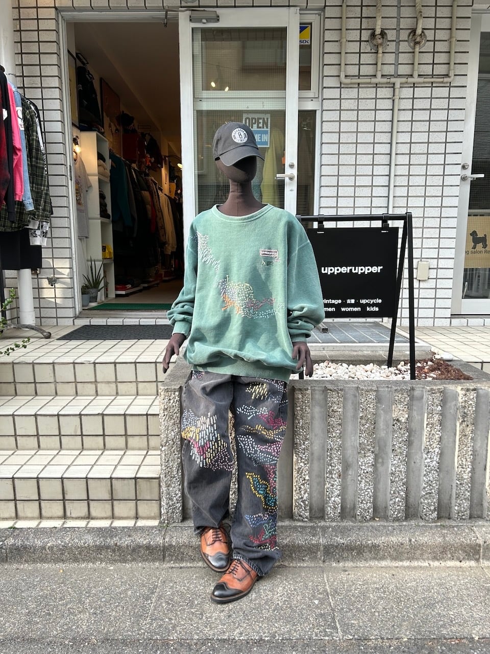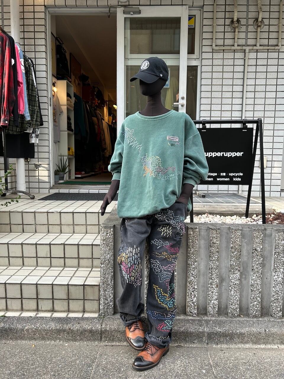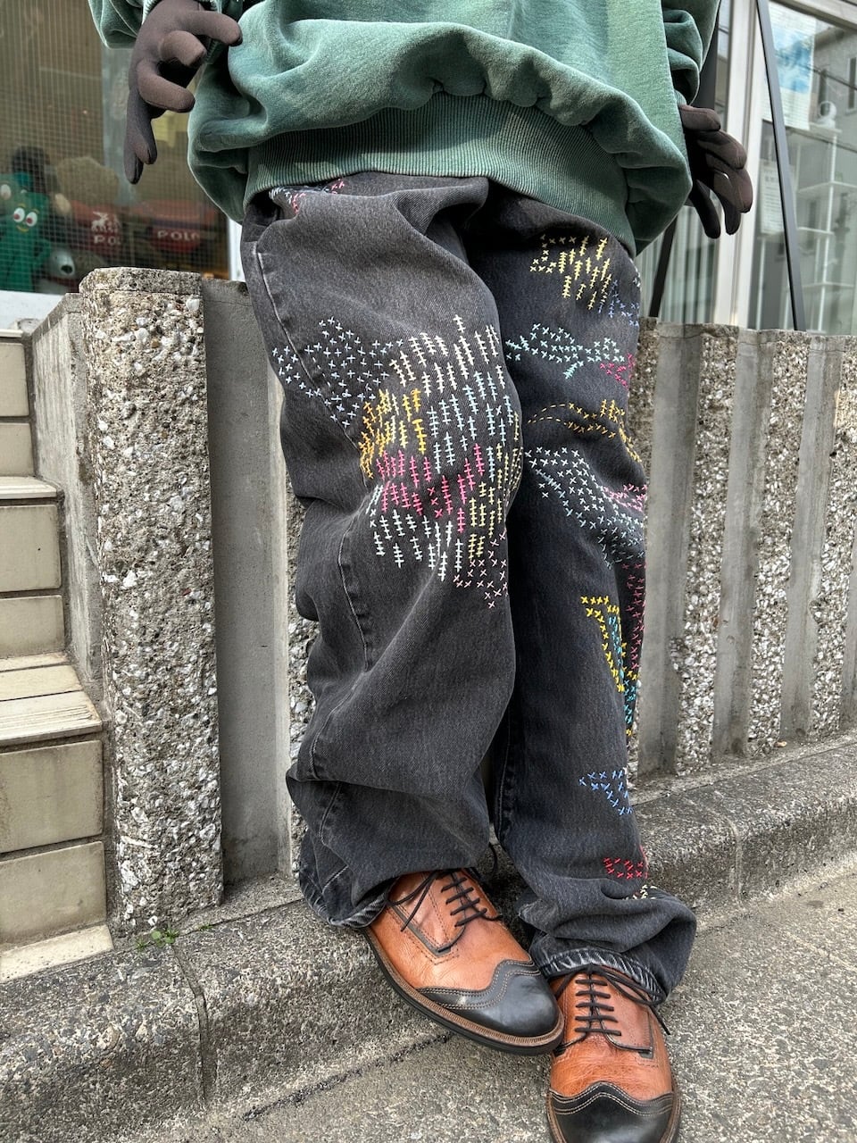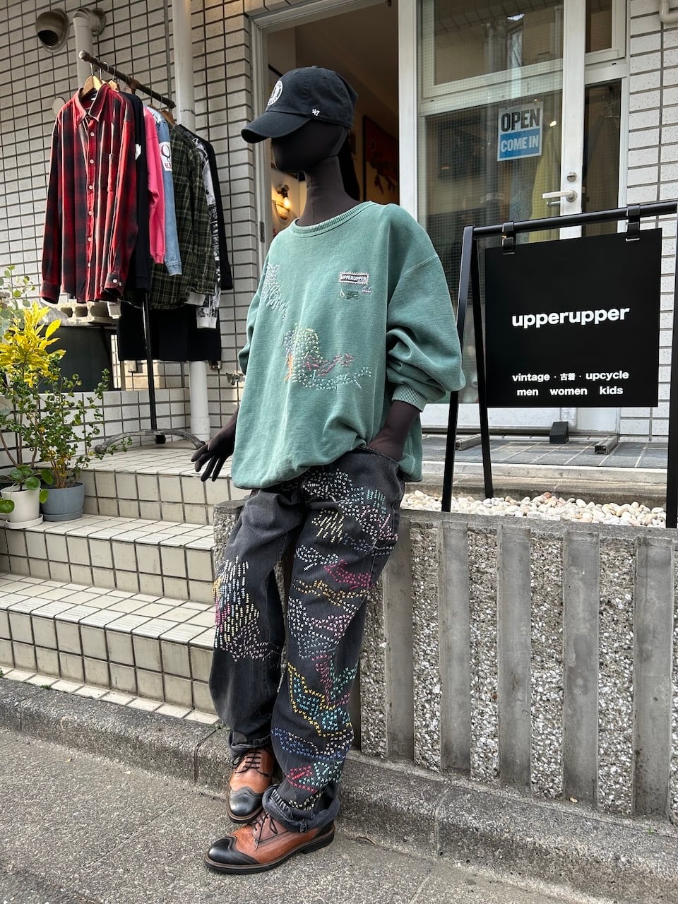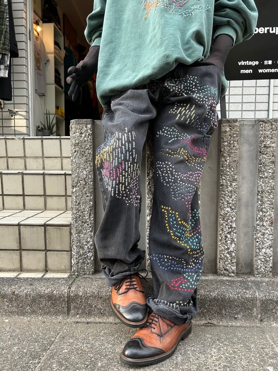 ご覧いただきありがとうございます!こちらのUPRUPR upcycle jeans W34は、2000年頃のメキシコ製リーバイス黒501を使用したアップサイクル品です。程よくフェード掛かったブラックデニムに、フリースタイル刺し子刺繍で自由にカラフルに装飾した作品です。定番的なクラシックジーンズに個性を持たせたデザインです。