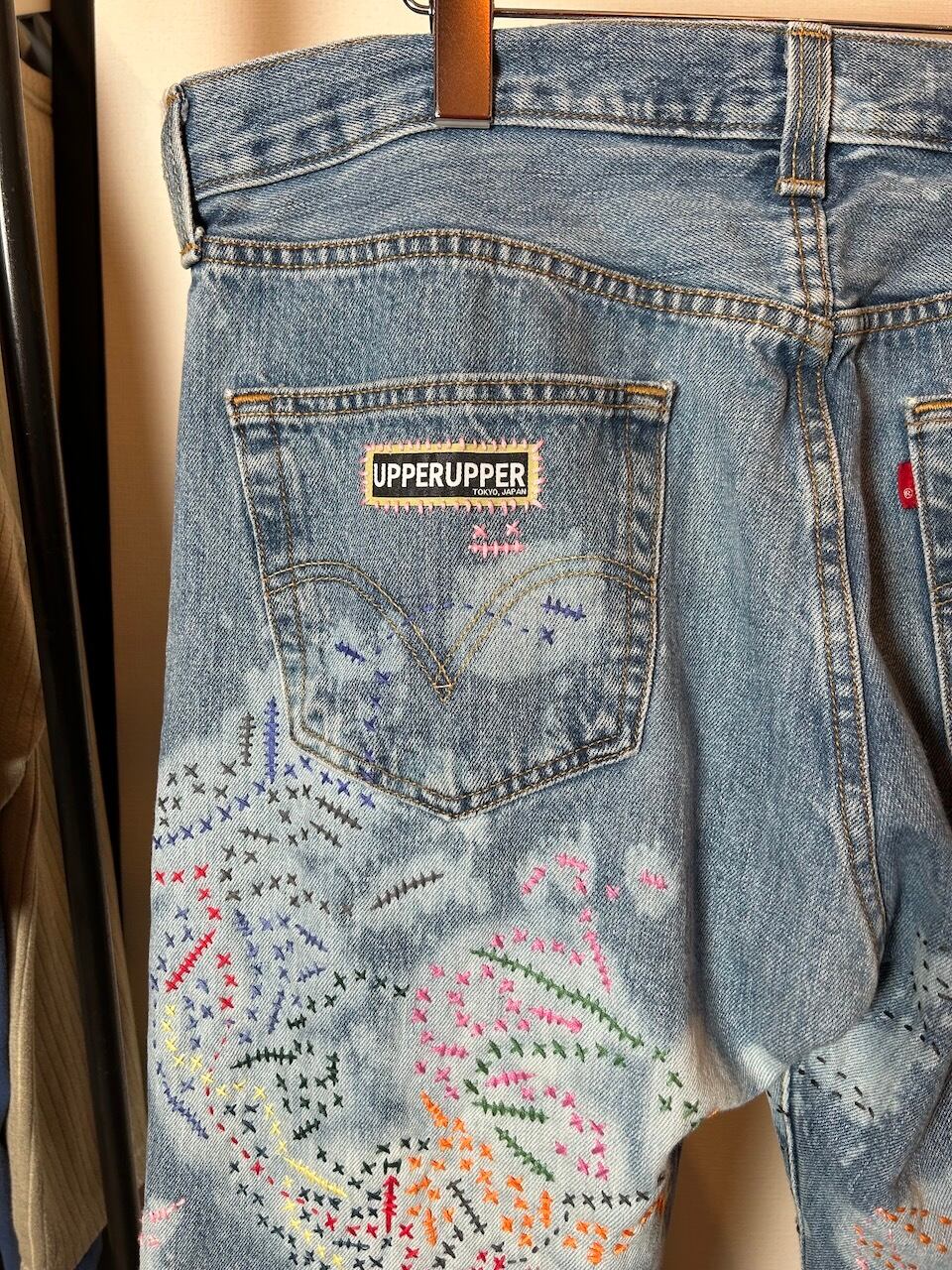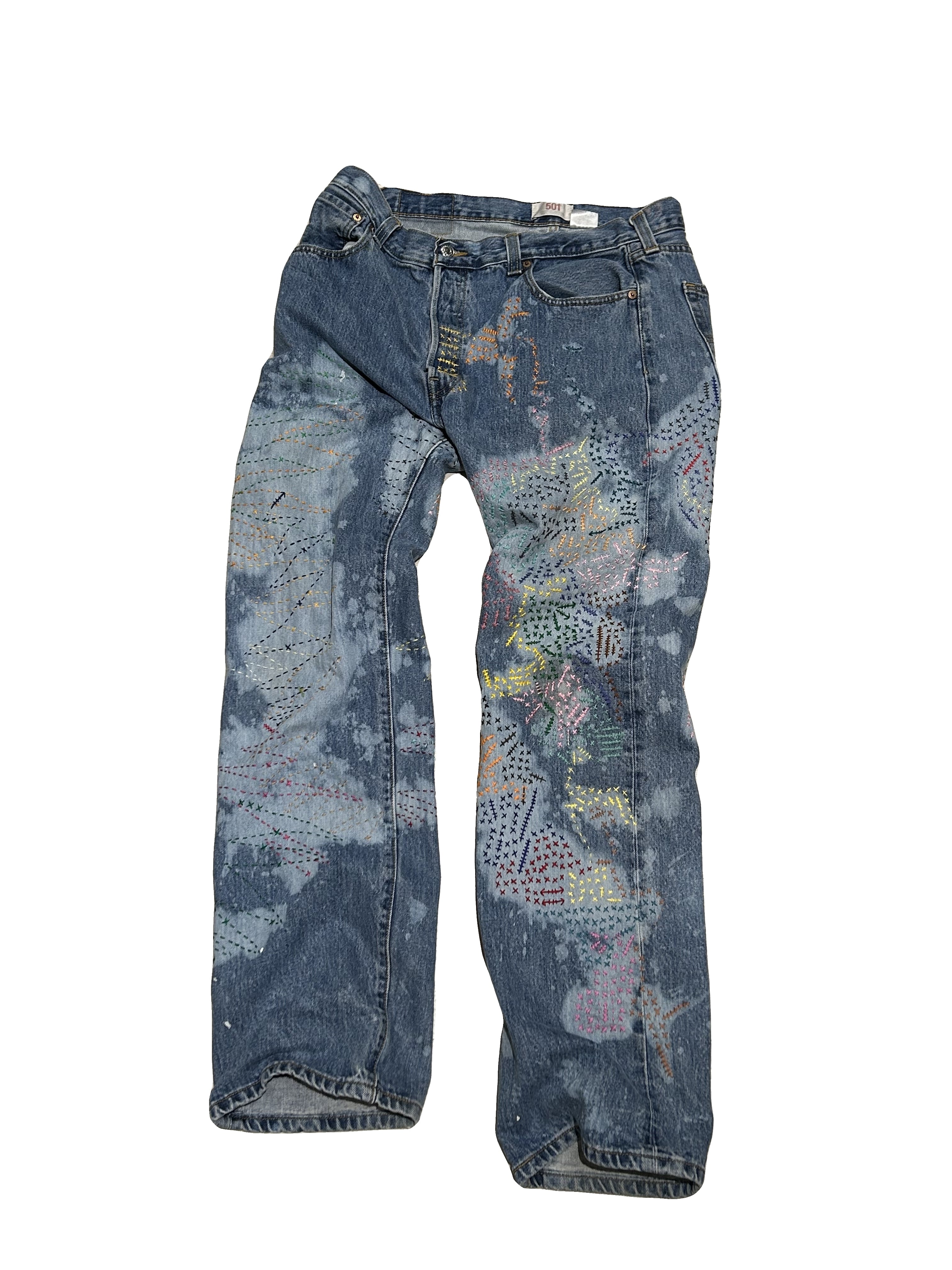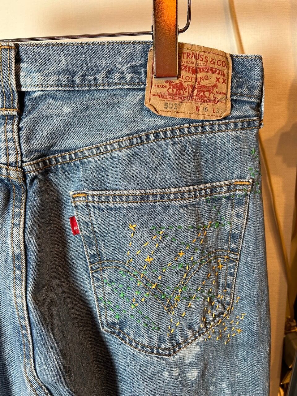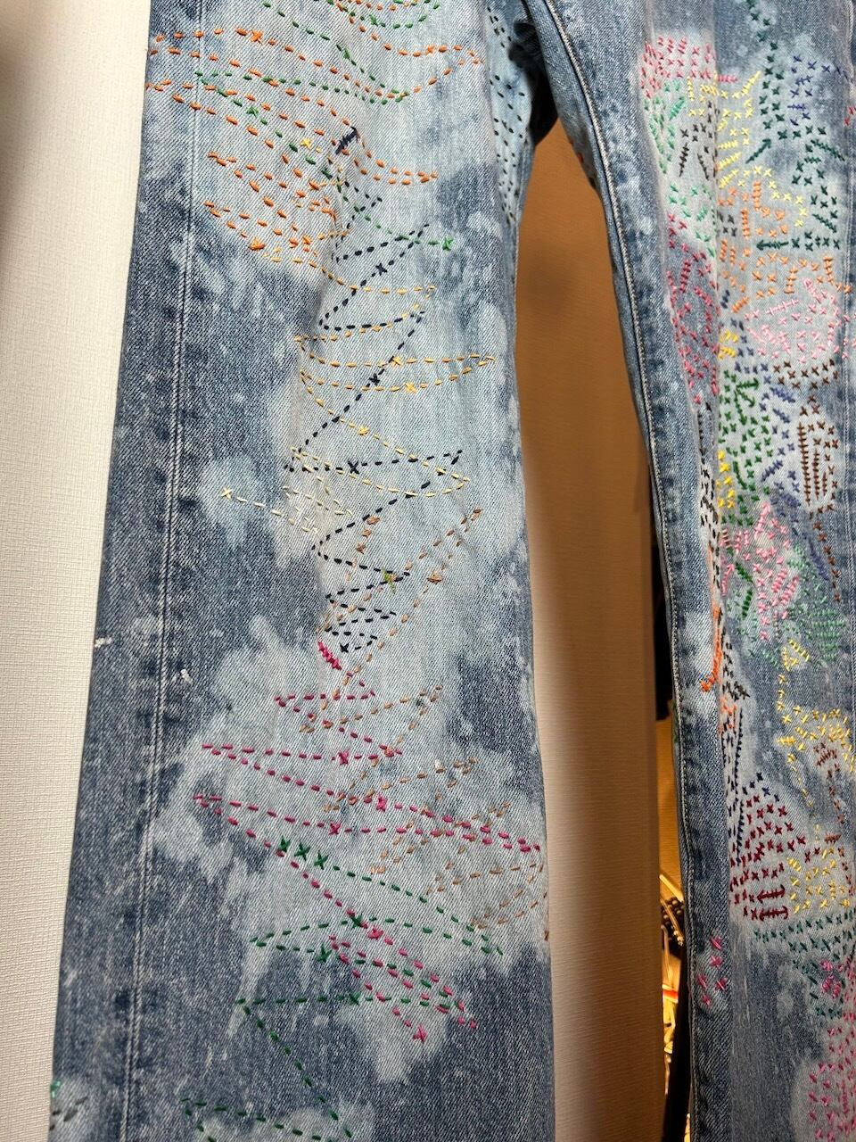 ご覧いただきありがとうございます!こちらのUPRUPR upcycle jeans W36は、2000年頃のメキシコ製リーバイス501を使用したアップサイクル品です。大胆な変色加工を施し、フリースタイル刺し子刺繍によるカラフルな装飾を施した作品です。この一本は、クラシックなブルーデニムに個性的なデザインを持たせ、ハンドメイドで作り上げた、スローファッションを体現する「着るアート」です。