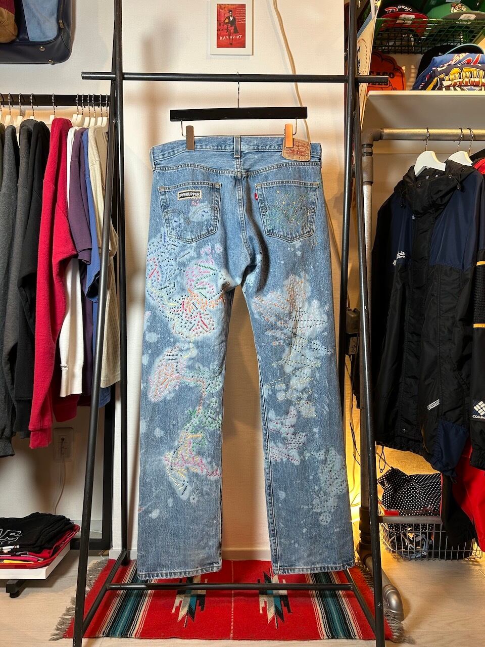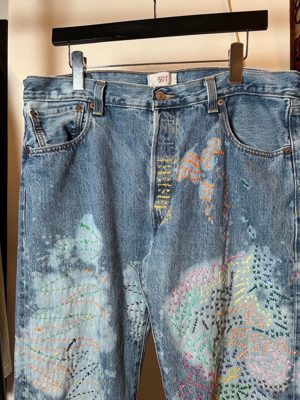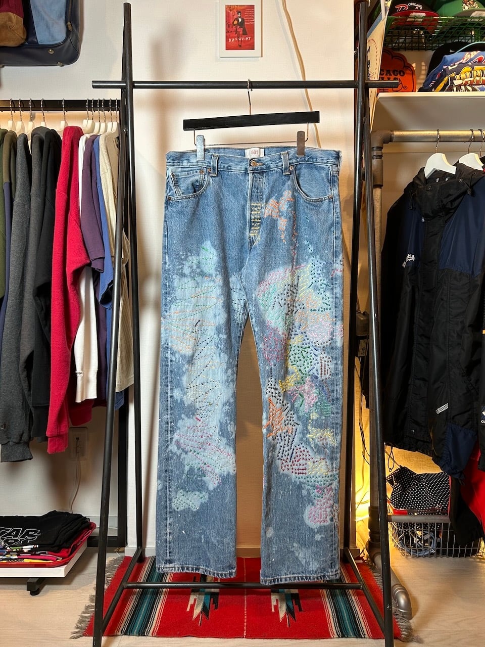 ご覧いただきありがとうございます!こちらのUPRUPR upcycle jeans W36は、2000年頃のメキシコ製リーバイス501を使用したアップサイクル品です。大胆な変色加工を施し、フリースタイル刺し子刺繍によるカラフルな装飾を施した作品です。この一本は、クラシックなブルーデニムに個性的なデザインを持たせ、ハンドメイドで作り上げた、スローファッションを体現する「着るアート」です。