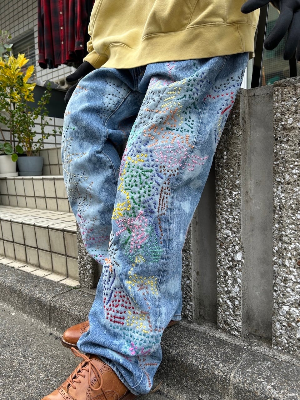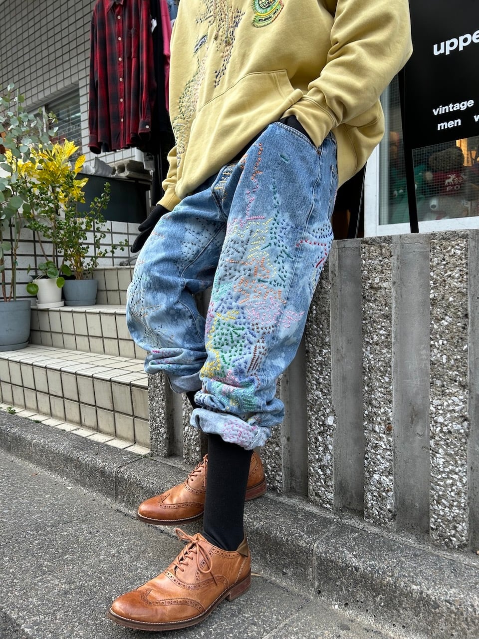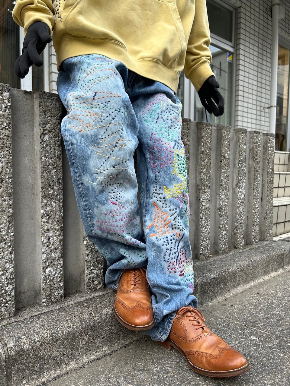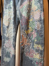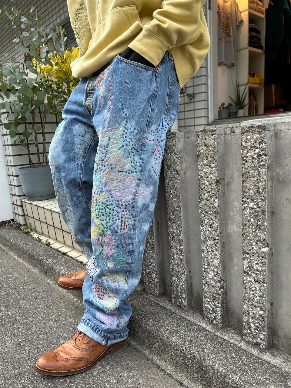ご覧いただきありがとうございます!こちらのUPRUPR upcycle jeans W36は、2000年頃のメキシコ製リーバイス501を使用したアップサイクル品です。大胆な変色加工を施し、フリースタイル刺し子刺繍によるカラフルな装飾を施した作品です。この一本は、クラシックなブルーデニムに個性的なデザインを持たせ、ハンドメイドで作り上げた、スローファッションを体現する「着るアート」です。