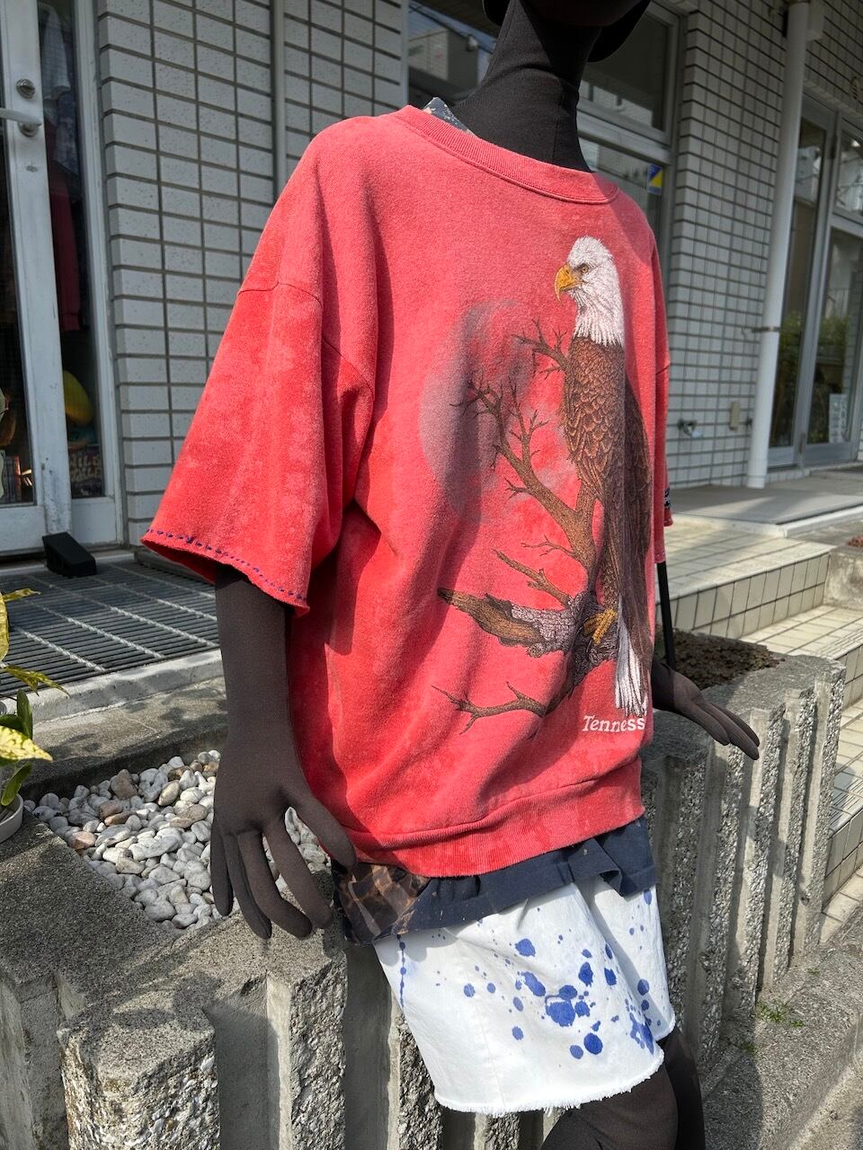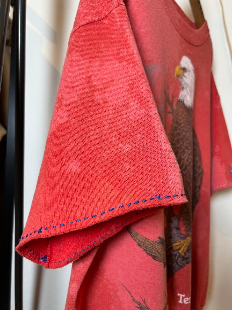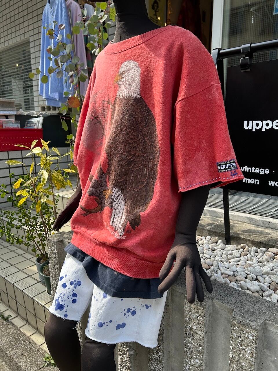 こちらの UPRUPR upcycle sweatshirt XLは、90年代アメリカ製のプリントスウェットを使用したアップサイクル品です。鮮やかな赤のボディに変色加工を施し、独特の色むらに。袖はカットオフし、手縫いの刺繍でユニークなアクセントを加えました。ゆるっとしたシルエットの半袖スウェット、使い勝手の良い1枚です。
